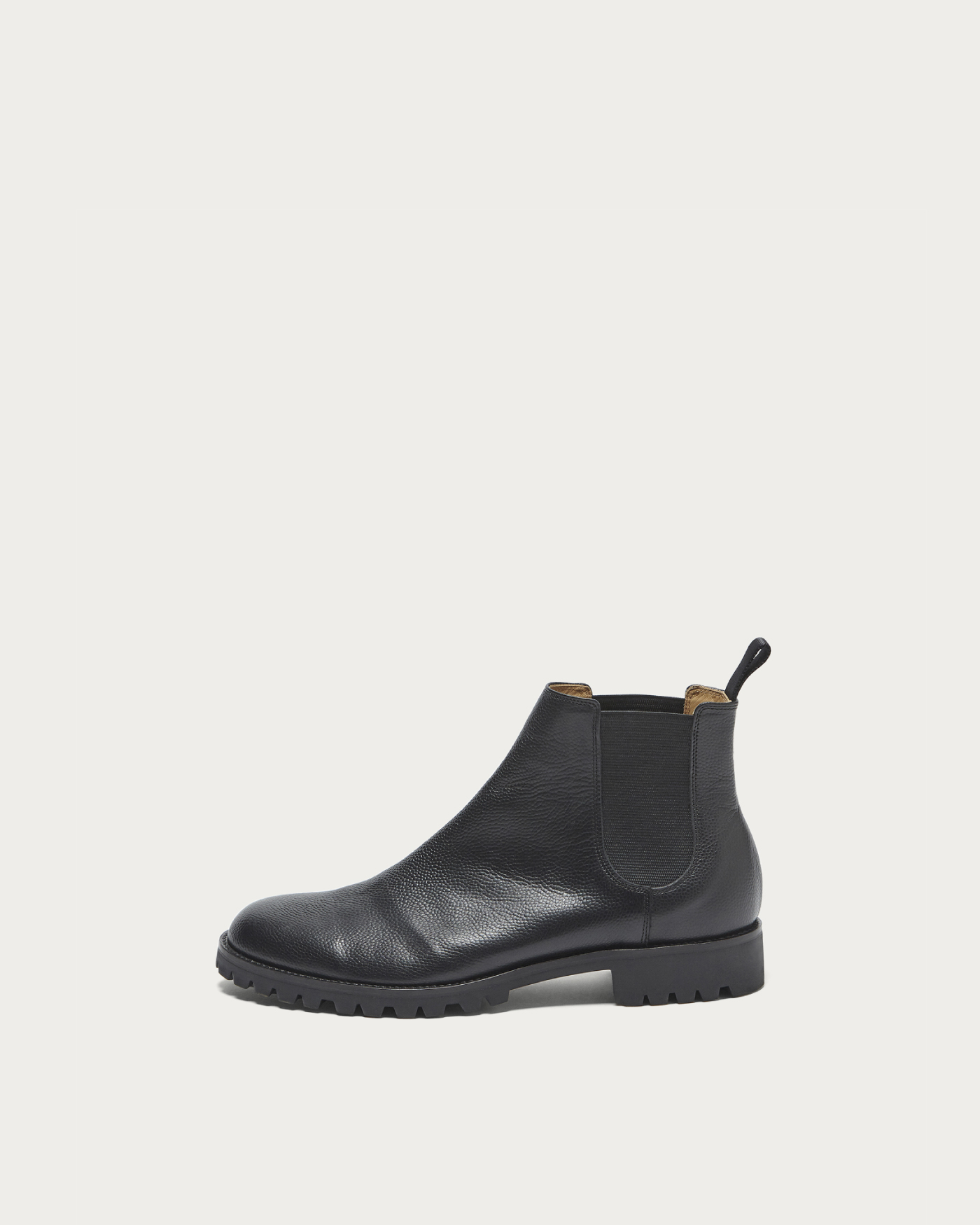 In addition to the classic calf model of our side gore boots, we have added an embossed model to our lineup. Featuring soles made by "VIBRAM," these boots offer stability and can be worn confidently on rough terrain or asphalt. The upper is crafted from embossed leather with a sharp, moderately textured feel, providing a solid wearing experience with a slight thickness. The glossy finish adds a modern touch to your footwear. These boots combine a classic appearance with practicality, making them a timeless staple that can be worn in any season.