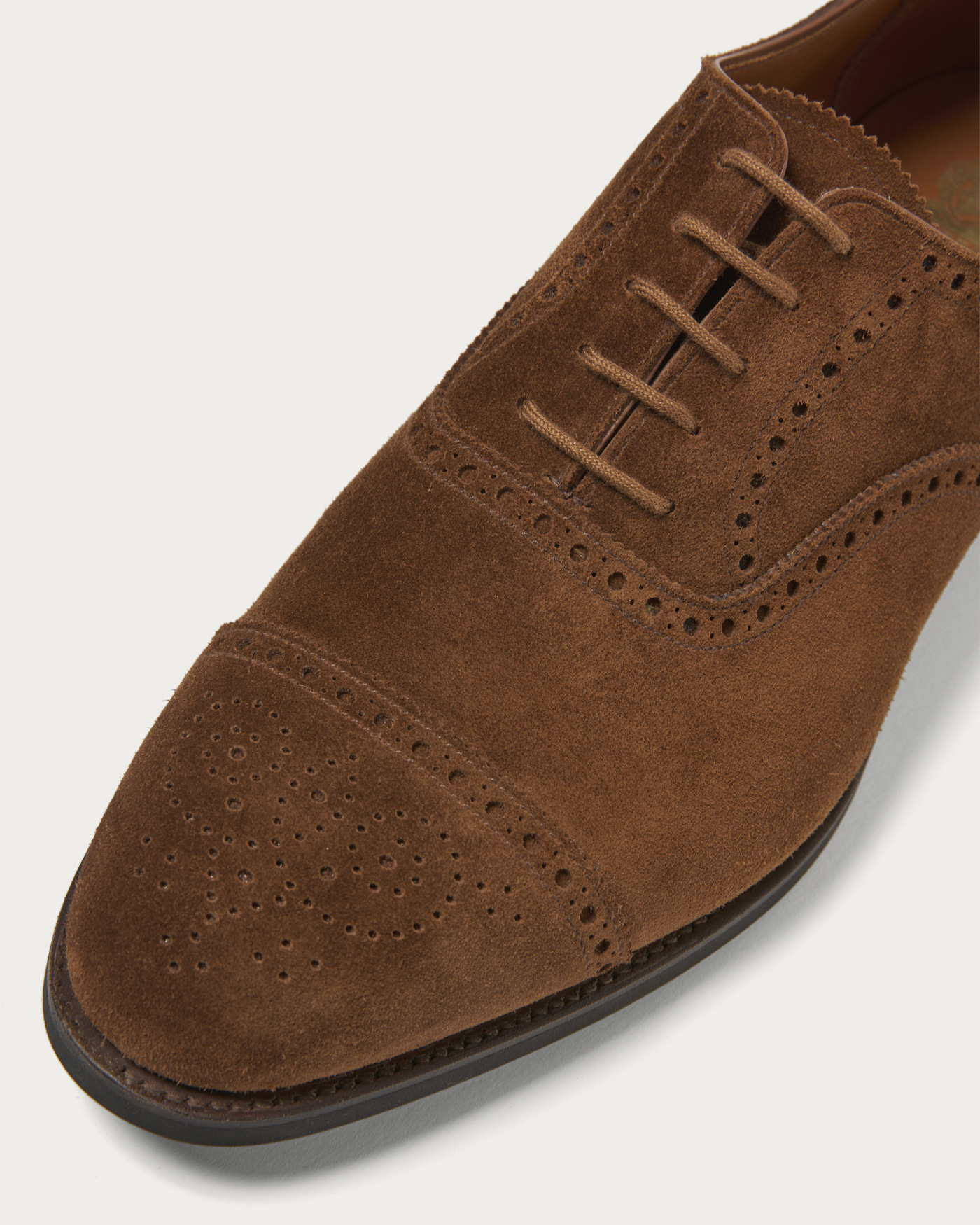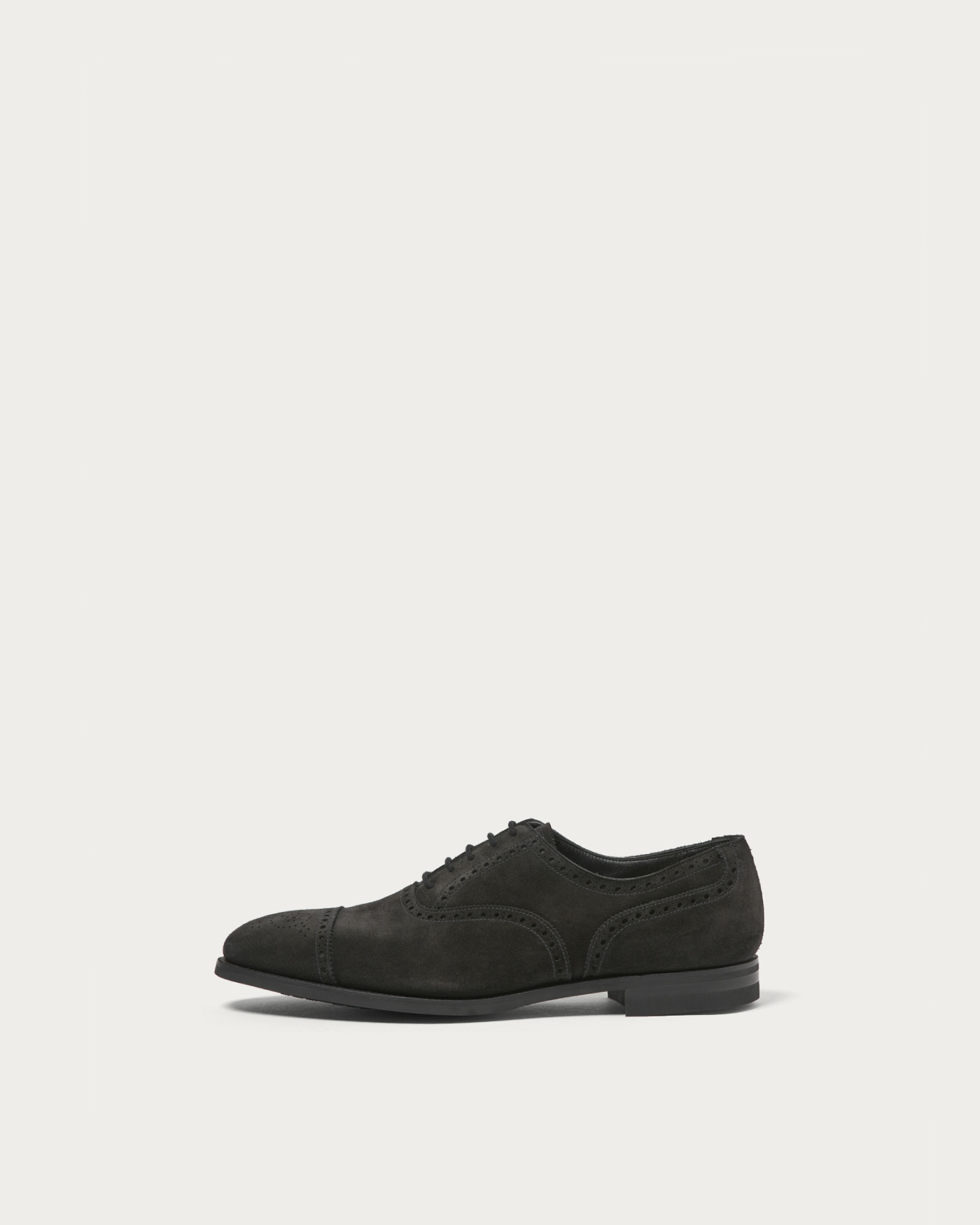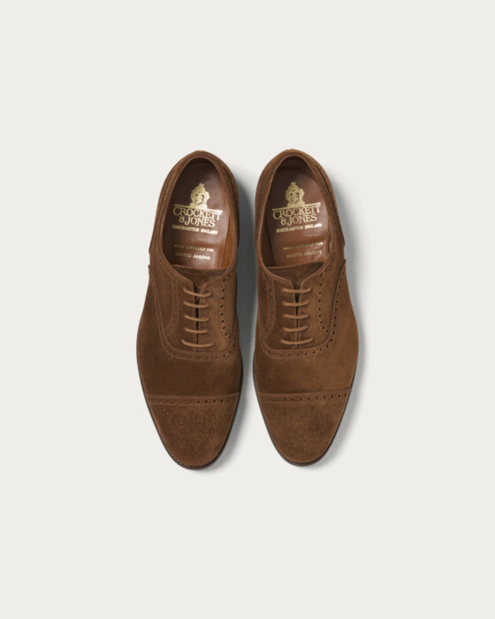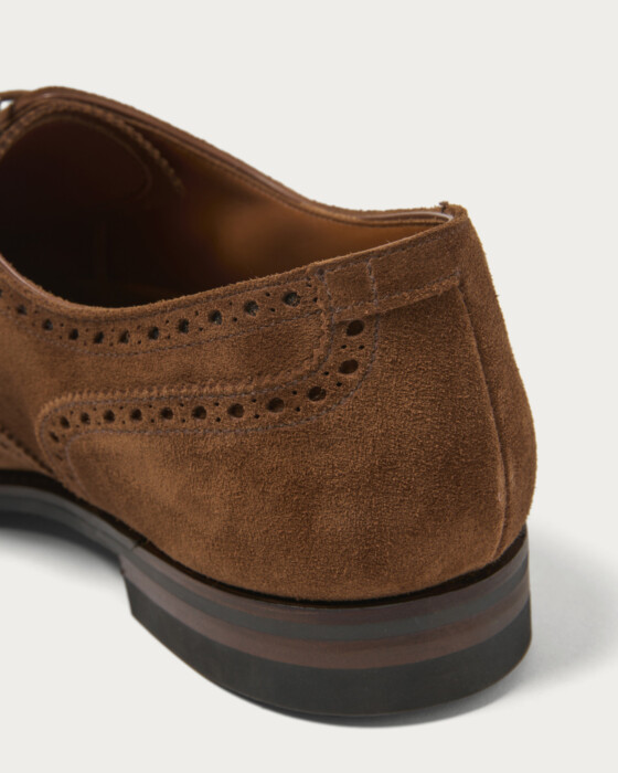 The "Westfield" is a semi-brogue shoe with a classic British style. It features the "Last 379," which has a tapered waist and a smaller heel cup. This design achieves a balance between a classic mood and a modern fit. The upper is made from high-quality, supple calf suede.