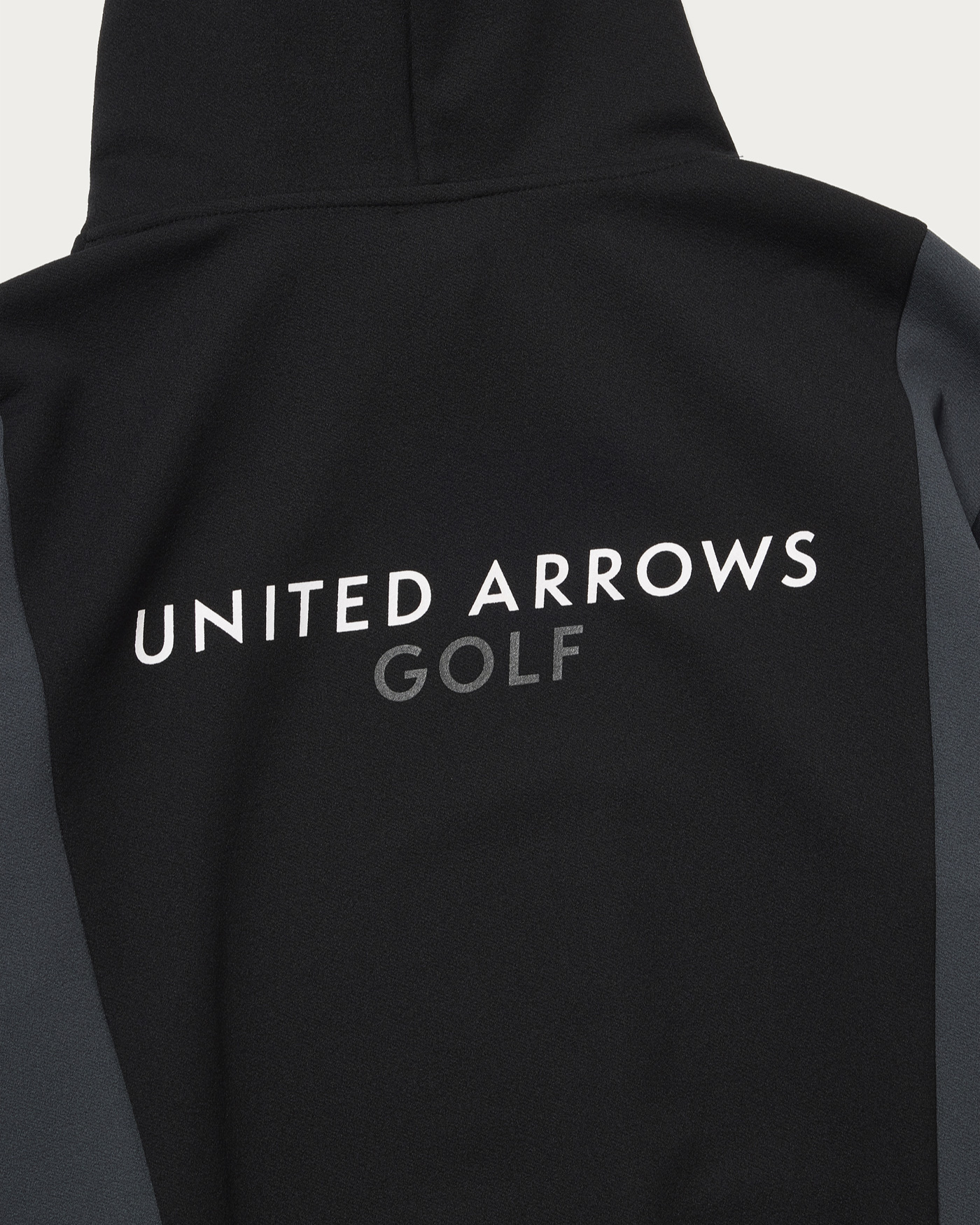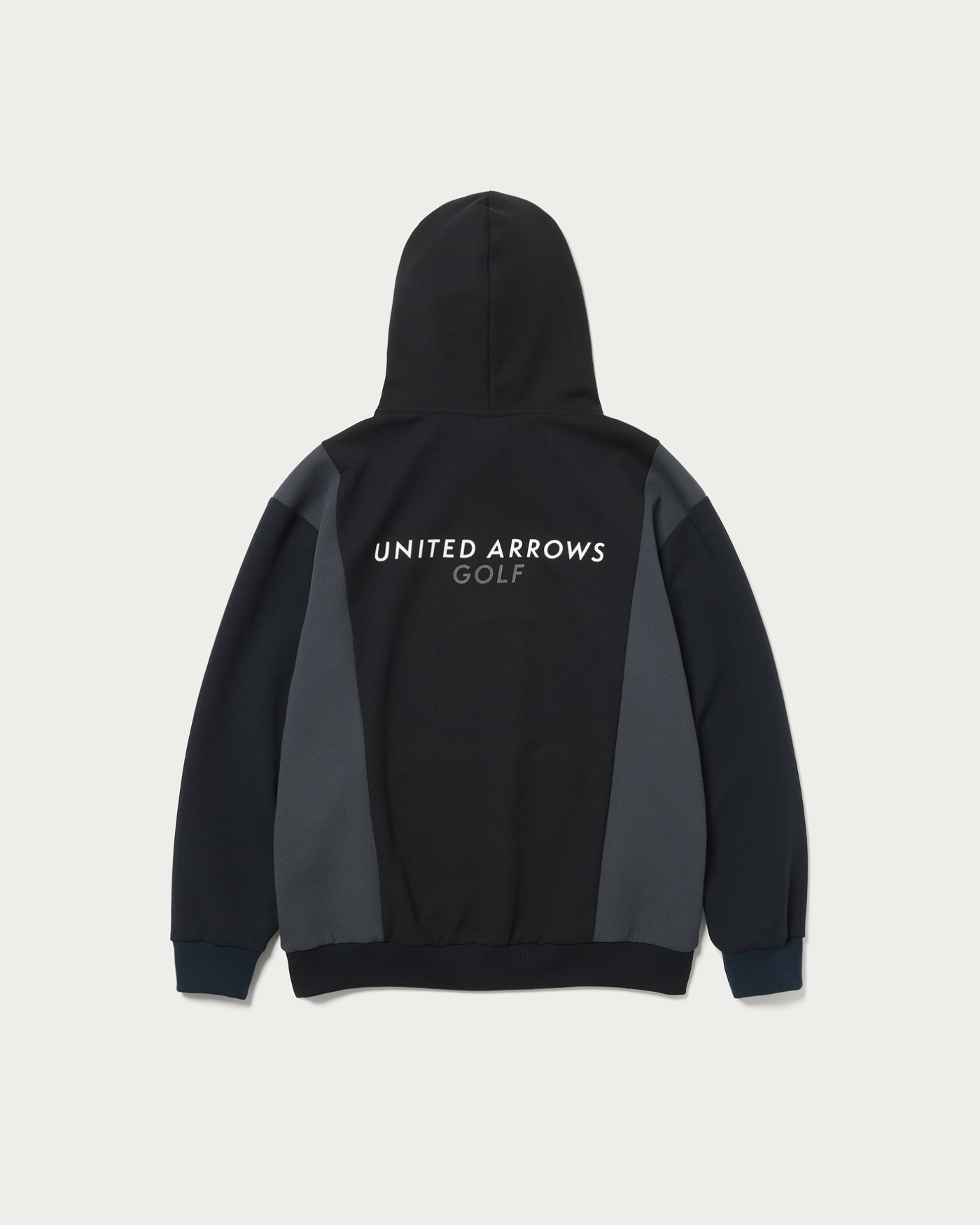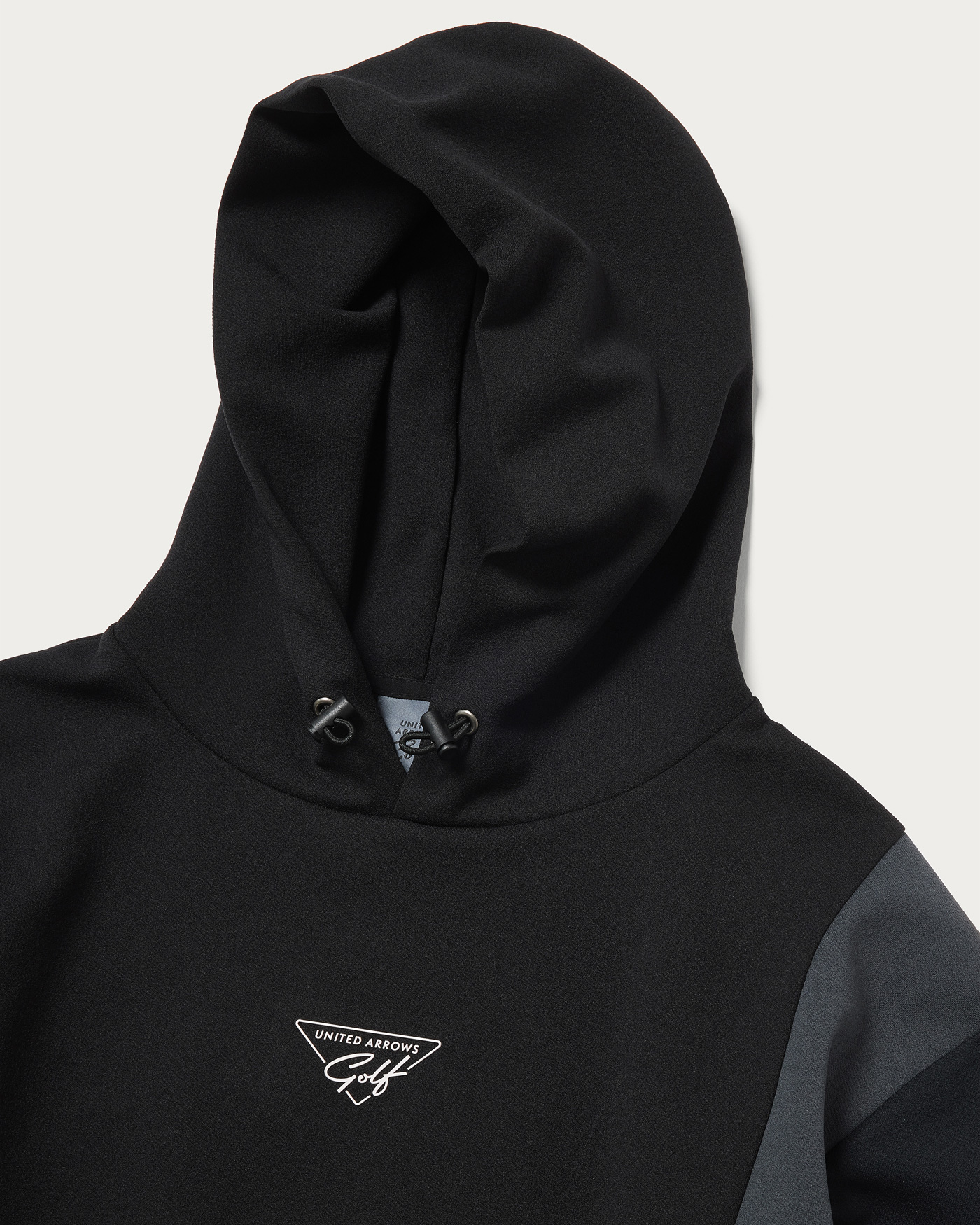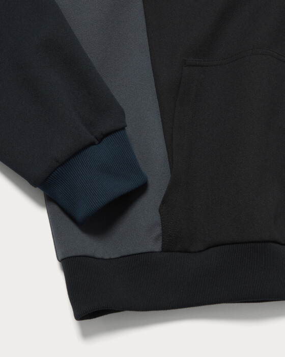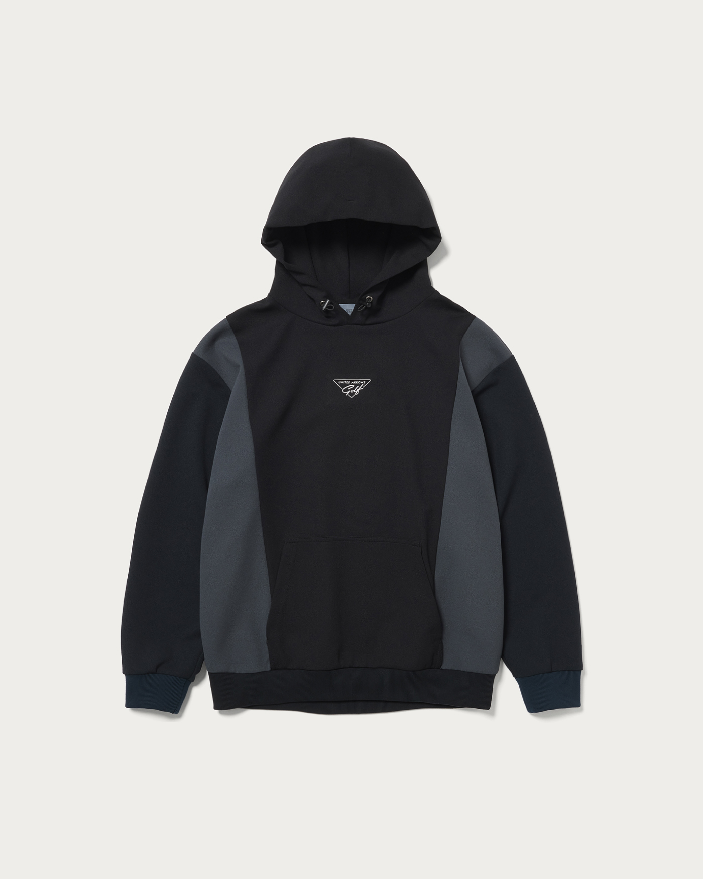 A pullover hoodie characterized by a simple design that combines different materials. It can be worn in a wide range of settings, from casual outings to more formal occasions. The hoodie features a large logo prominently displayed on the chest and back.