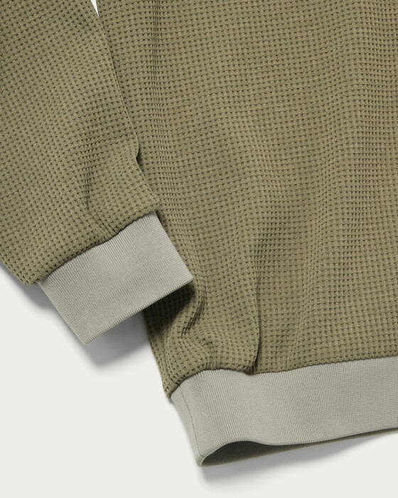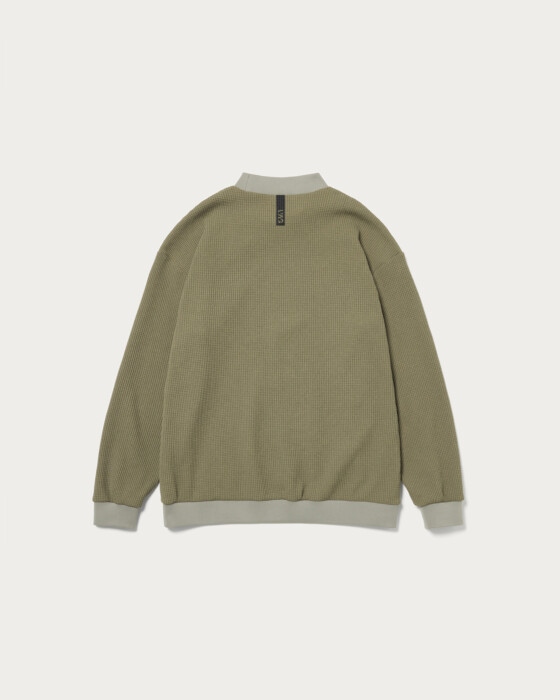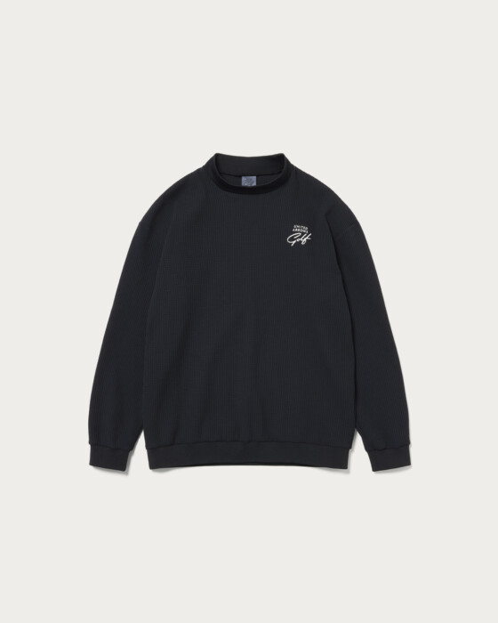 A mock neck shirt made from a textured waffle fabric. It has a simple yet striking presence, making it versatile for wearing on its own or as a layered piece.