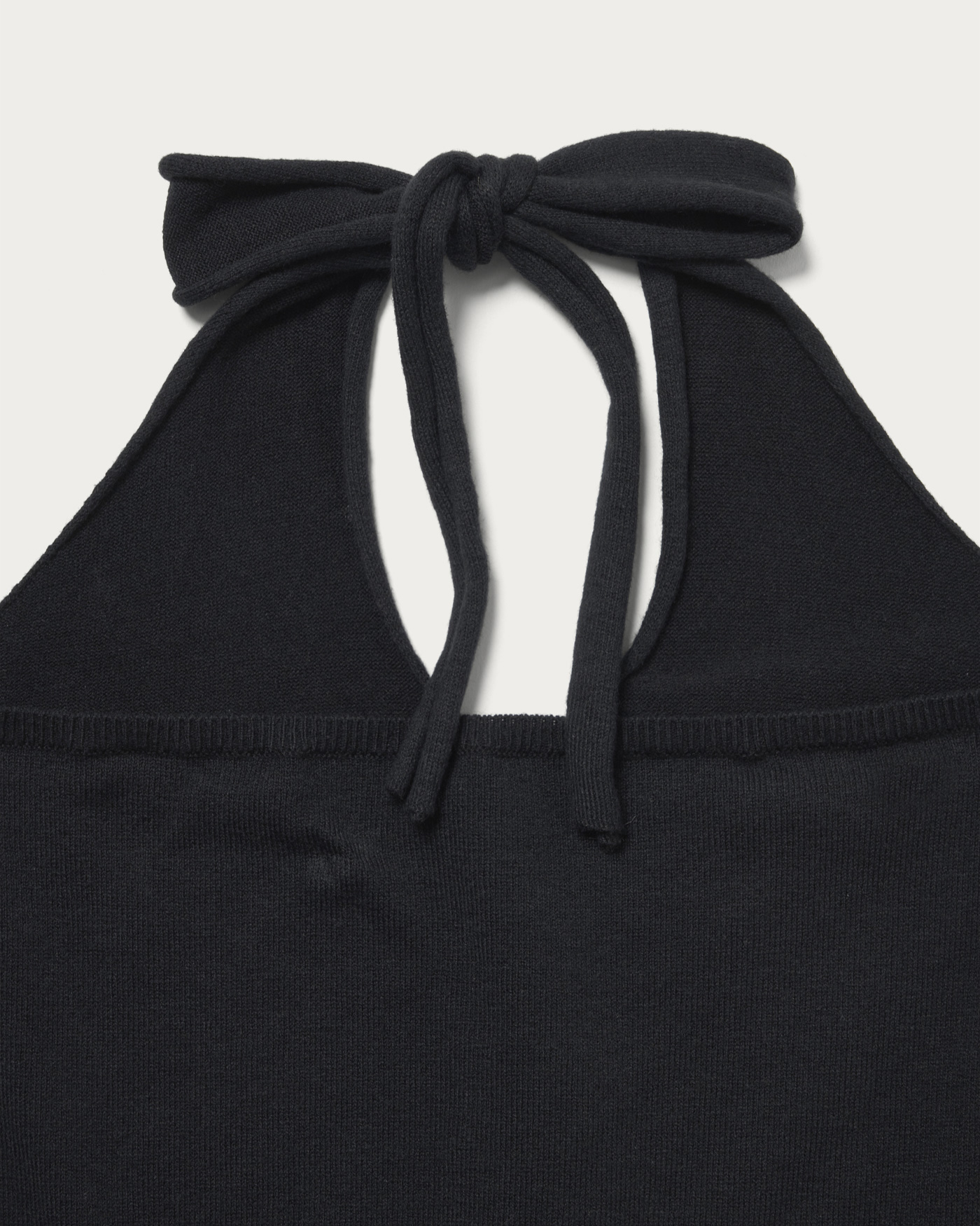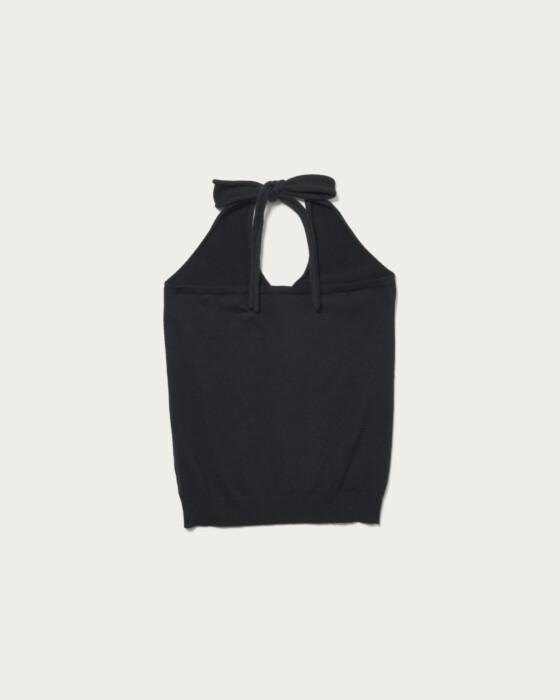 Halter neck made of knit material. The straps are self-tie, allowing you to adjust the fit. With a moderate size and stretchability, it offers a silhouette that fits well. The soft-touch texture feels great on the skin, making it a versatile piece that can be enjoyed on its own or layered with other styles.