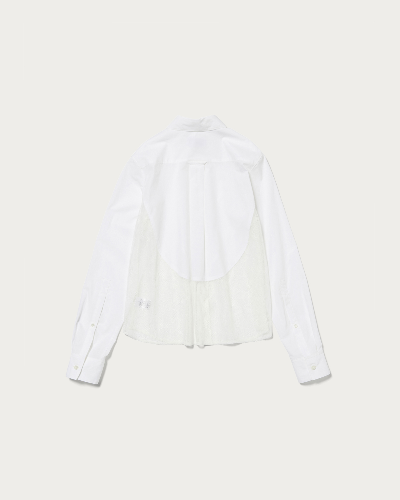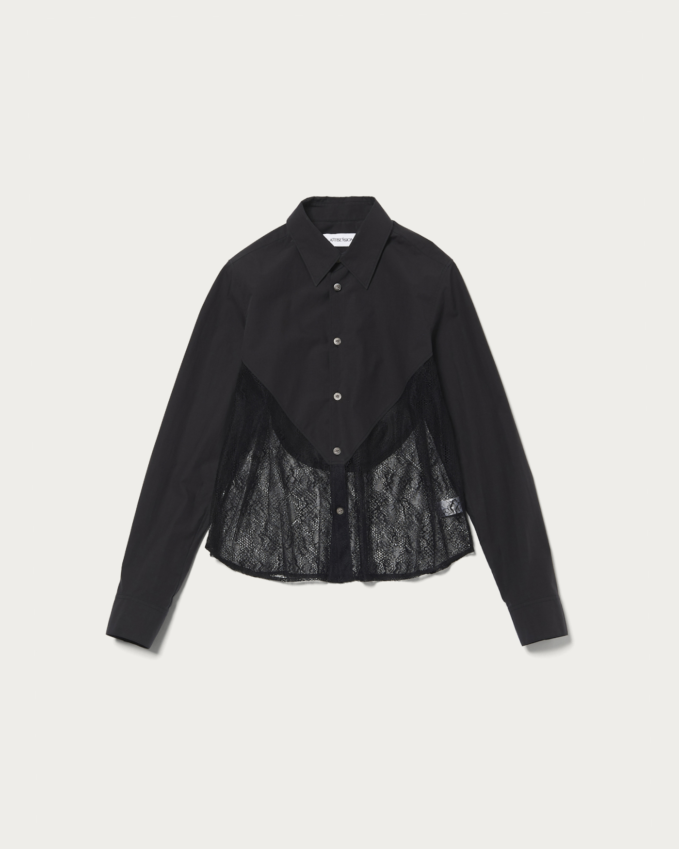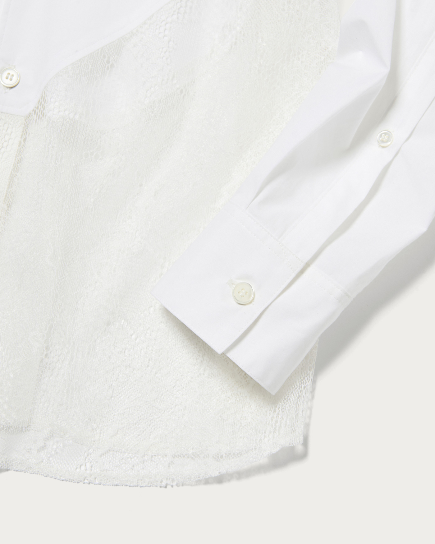 A compact shirt that combines a typewriter and lace design. This piece pays attention to detail with features like switch lines and cut-off specifications. It pairs well with casual bottoms like denim.