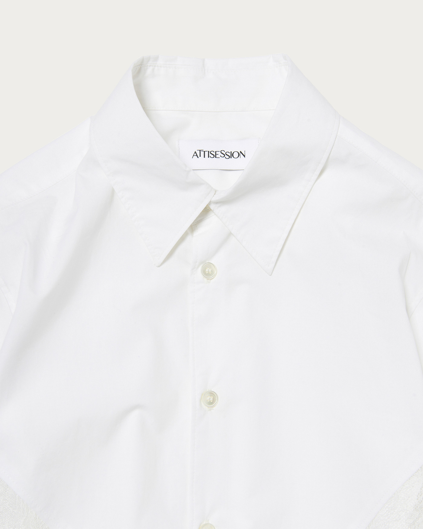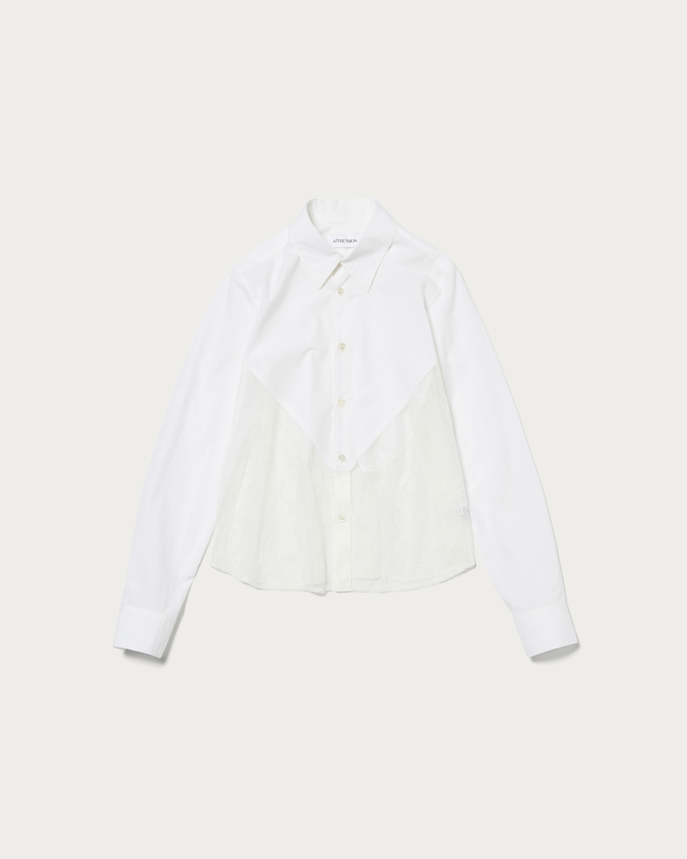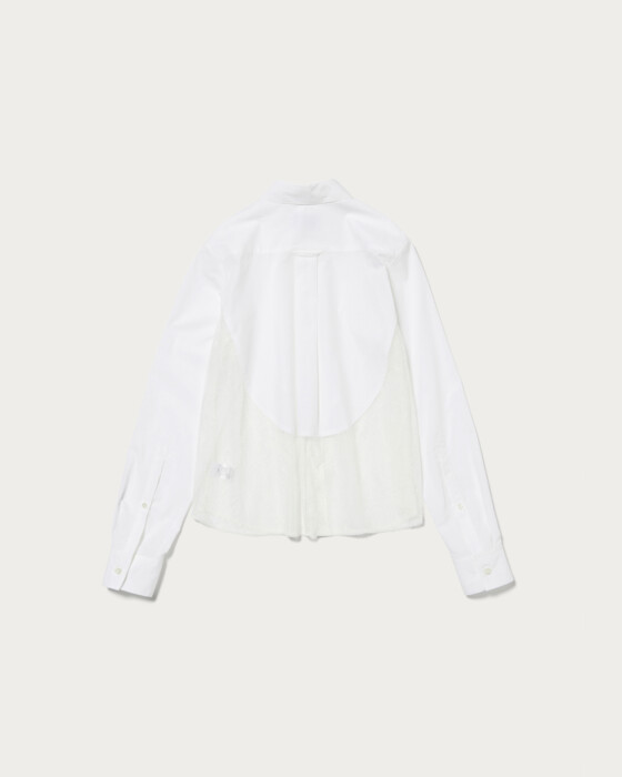A compact shirt that combines a typewriter and lace design. This piece pays attention to detail with features like switch lines and cut-off specifications. It pairs well with casual bottoms like denim.