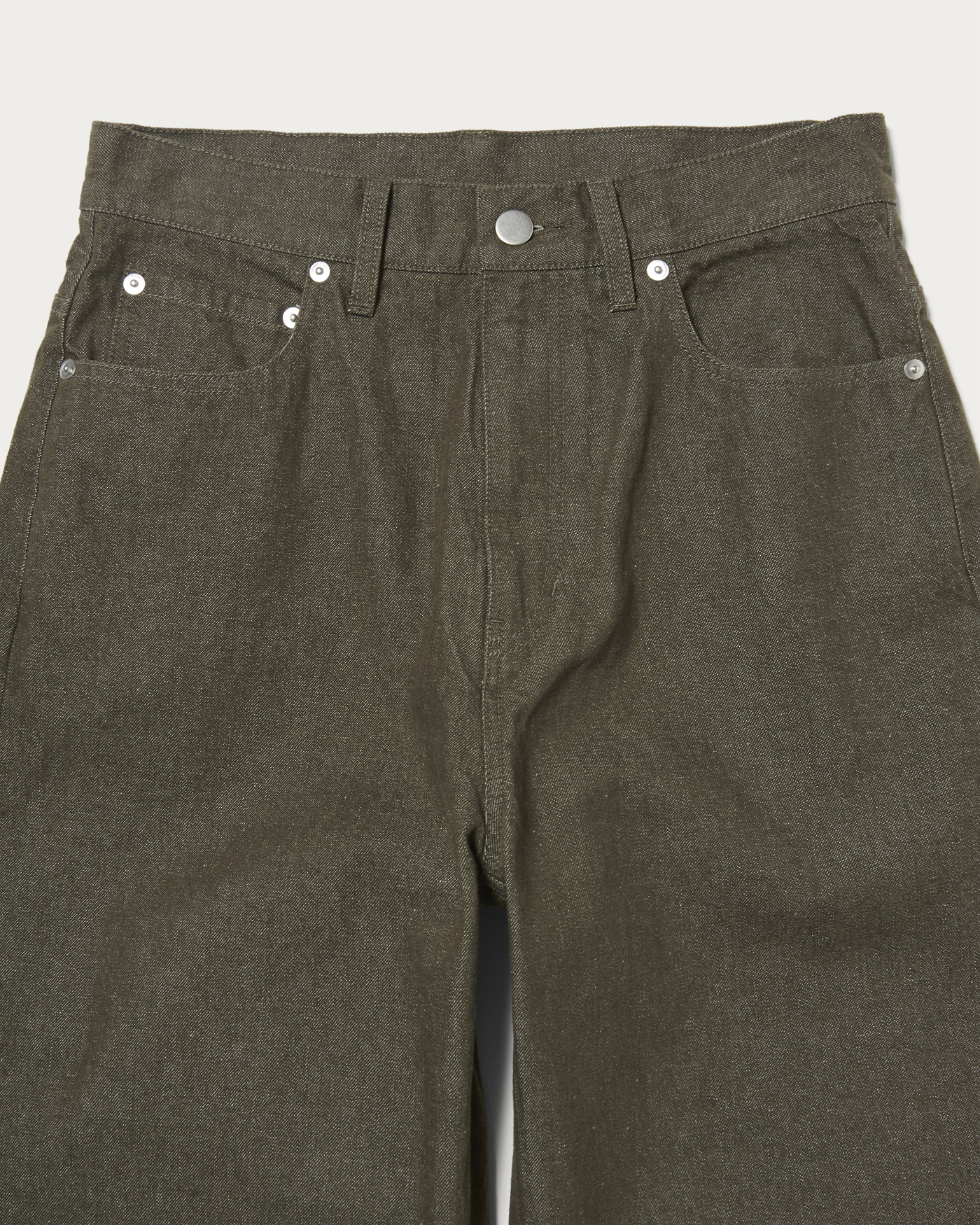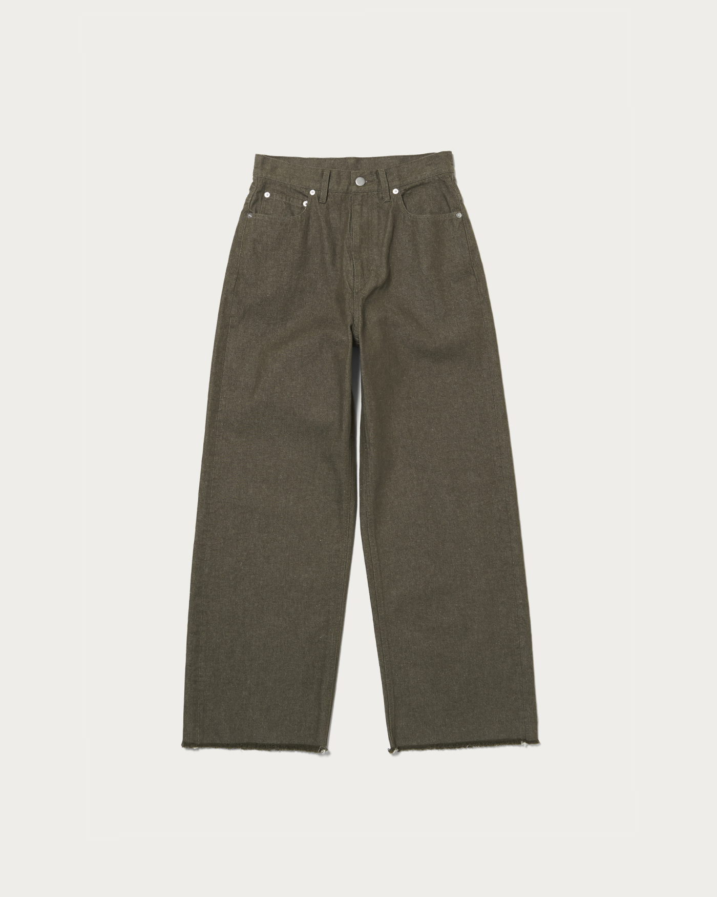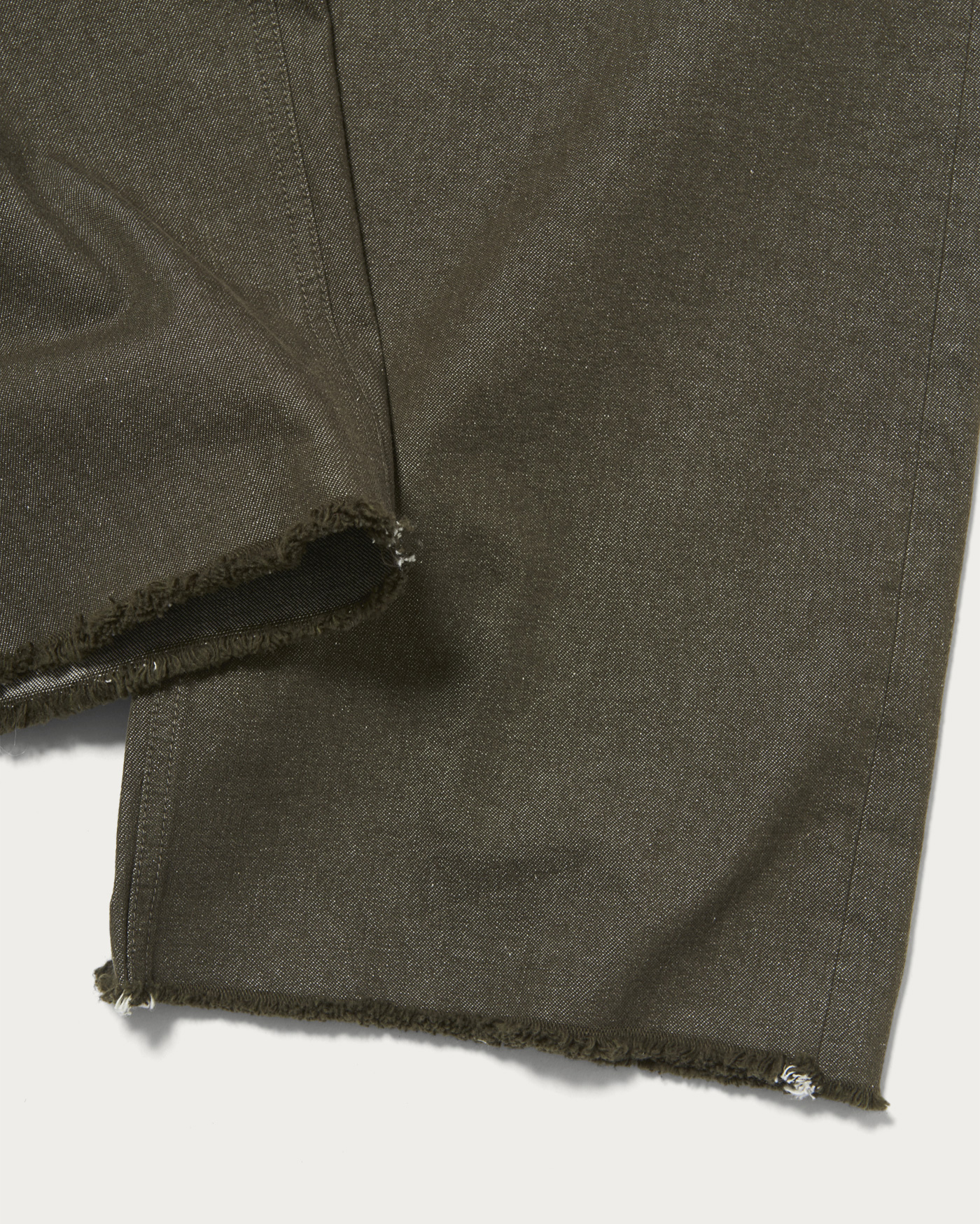 The wide silhouette, utilizing the fabric's firmness, leads to a sophisticated impression with these straight-cut denim pants. The cut-off hem adds a casual vibe to the piece. Available in two new colors: olive and navy.