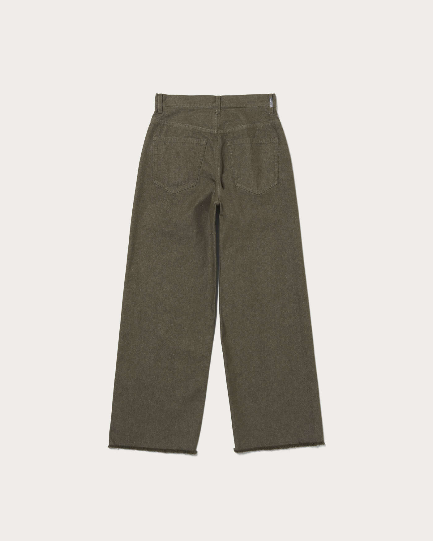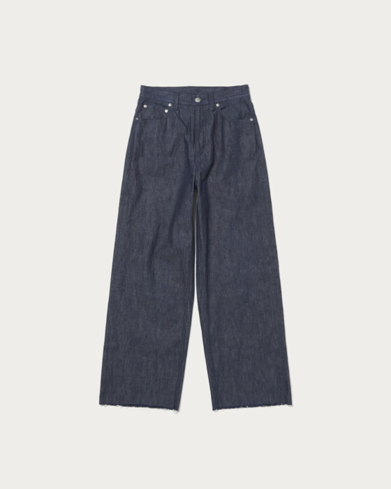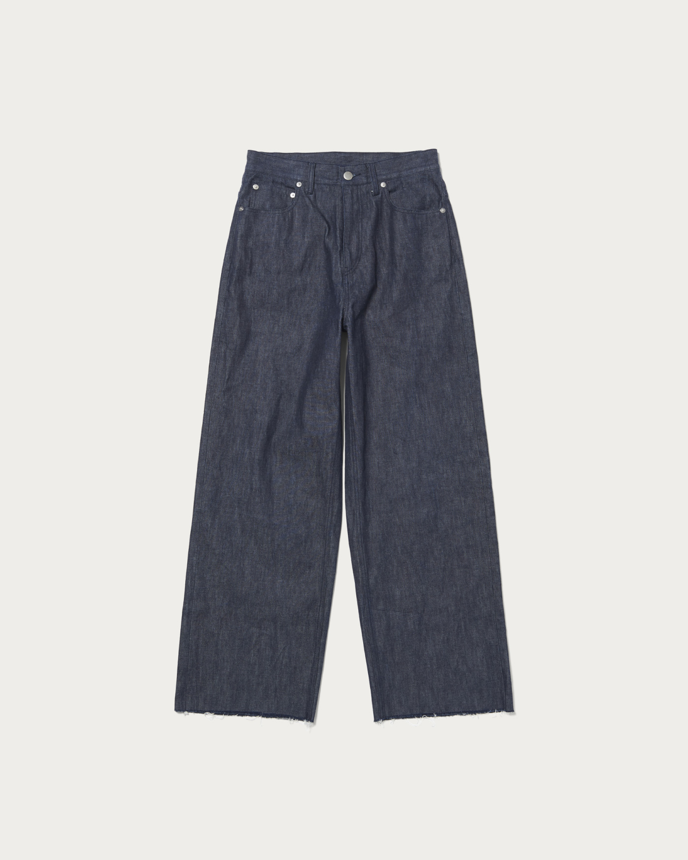 The wide silhouette, utilizing the fabric's firmness, leads to a sophisticated impression with these straight-cut denim pants. The cut-off hem adds a casual vibe to the piece. Available in two new colors: olive and navy.