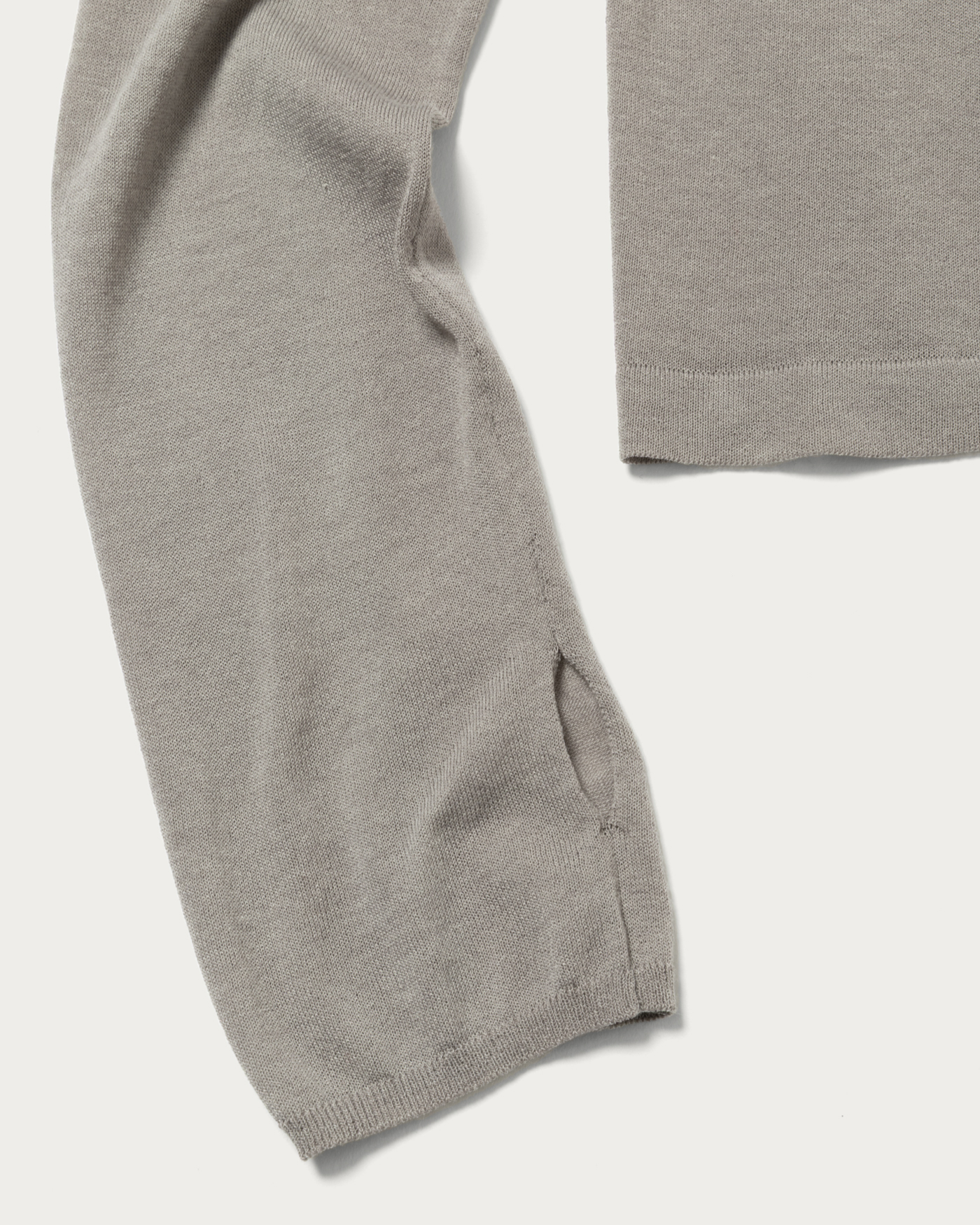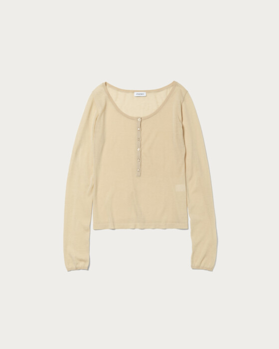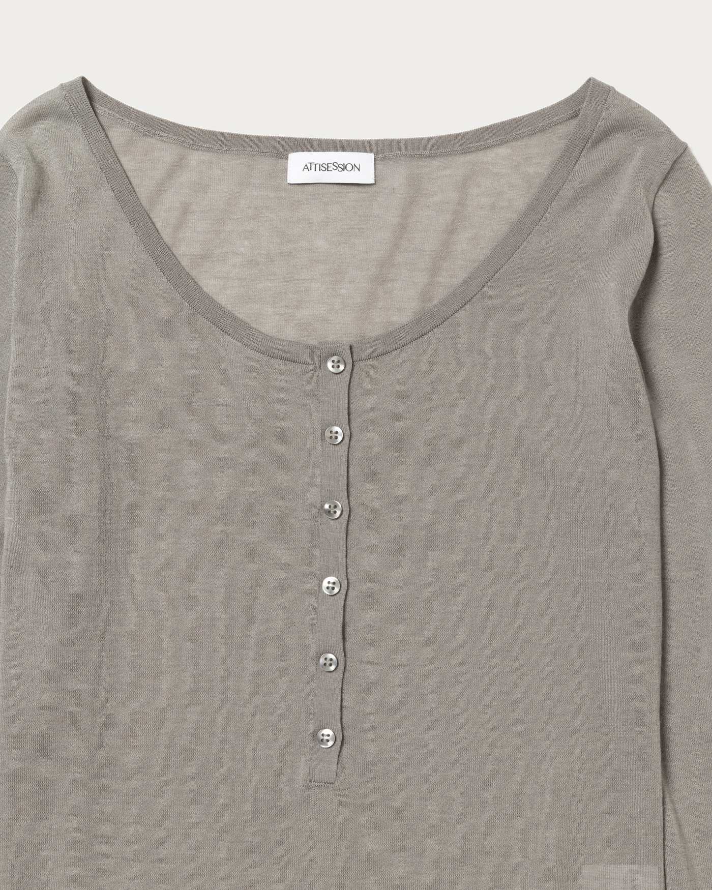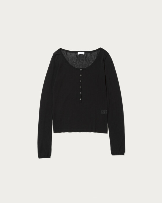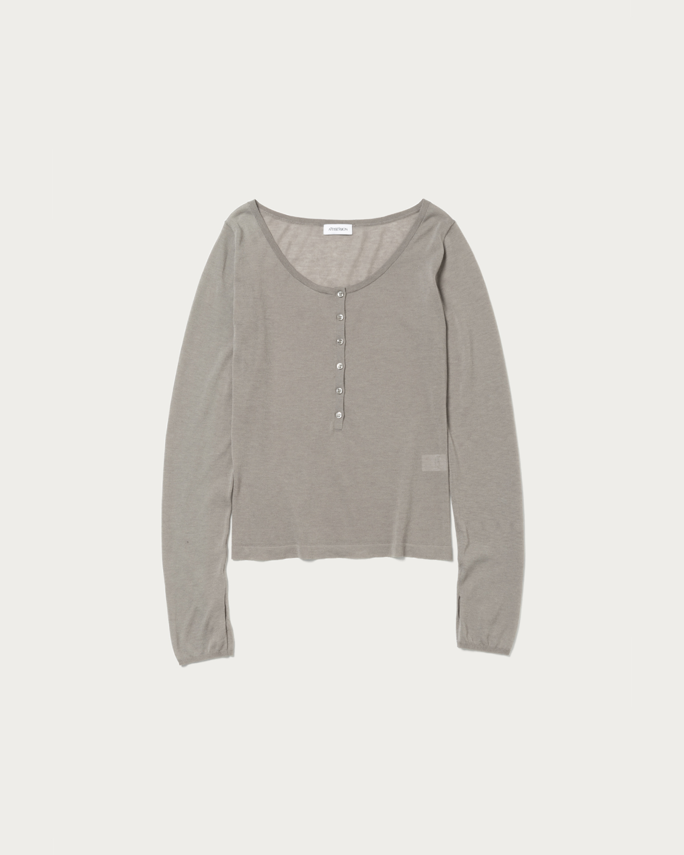 A Henley neck design top with a wide neckline and a waist-shaped silhouette that exudes a healthy and feminine mood. The sleeves are long and feature thumbholes, making it a trendy piece.