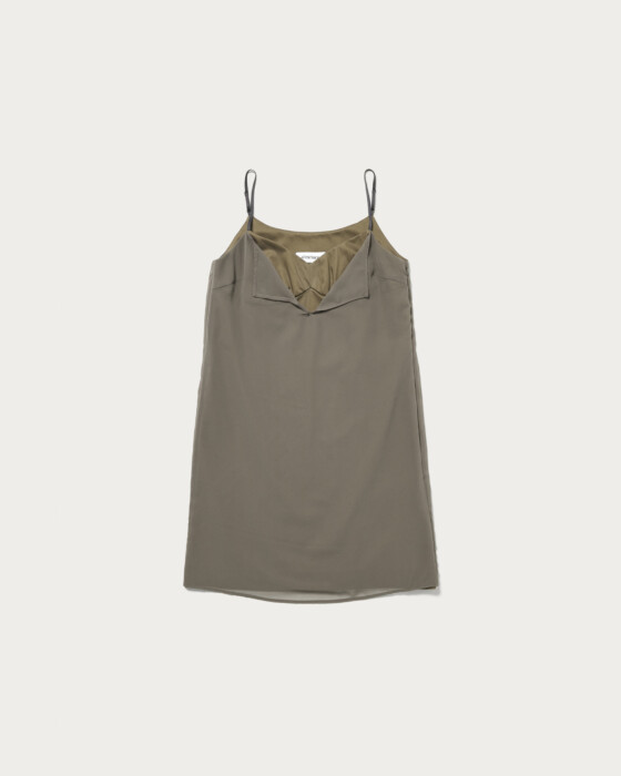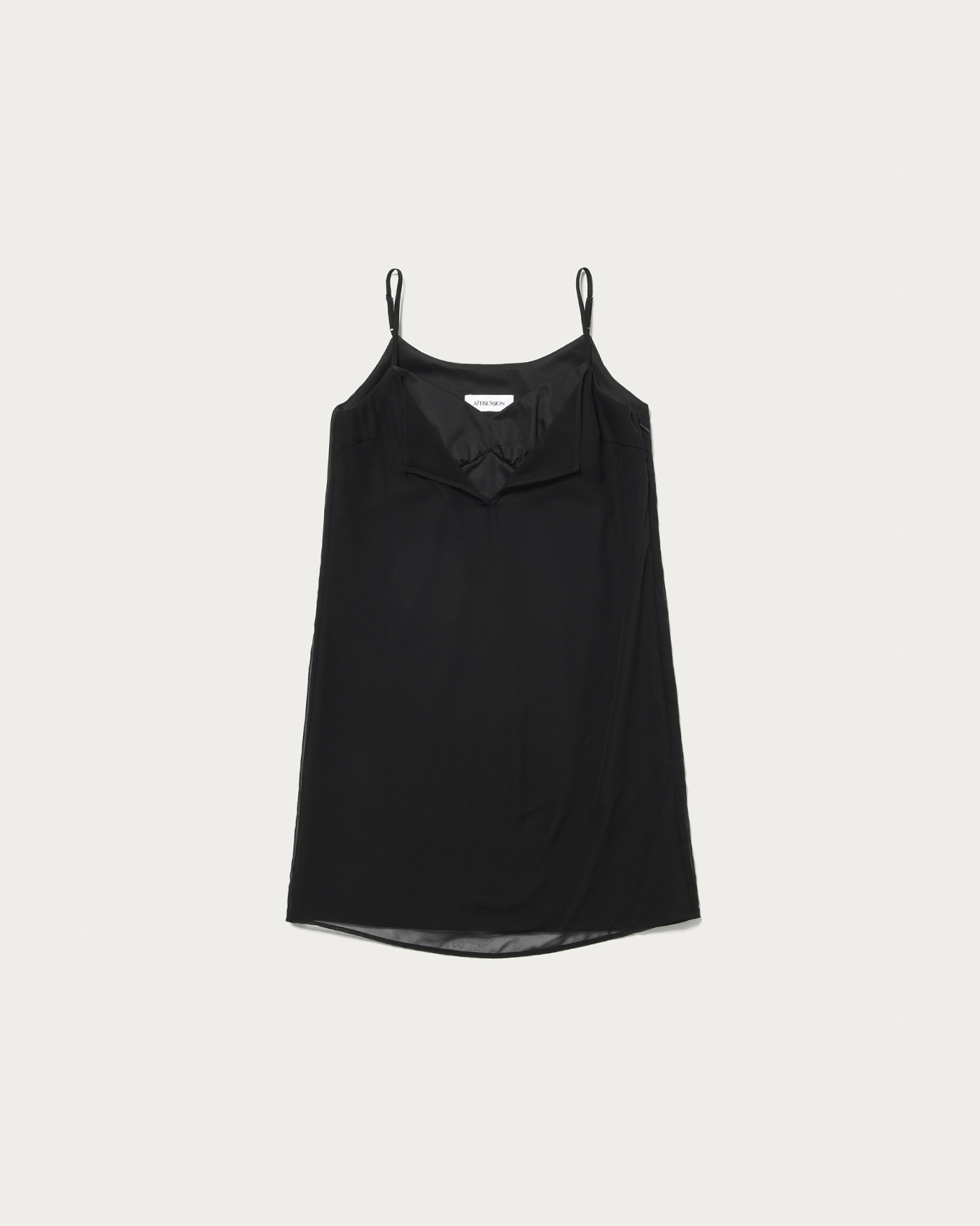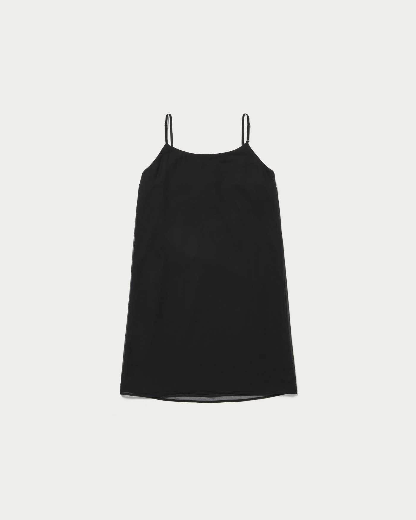 A mini dress designed with layers of organza fabric over satin. The neckline features details that add a casual touch, and the delicate shoulder straps come with adjusters for a perfect fit. Available in two colors: a chic black and a nuanced dark brown.