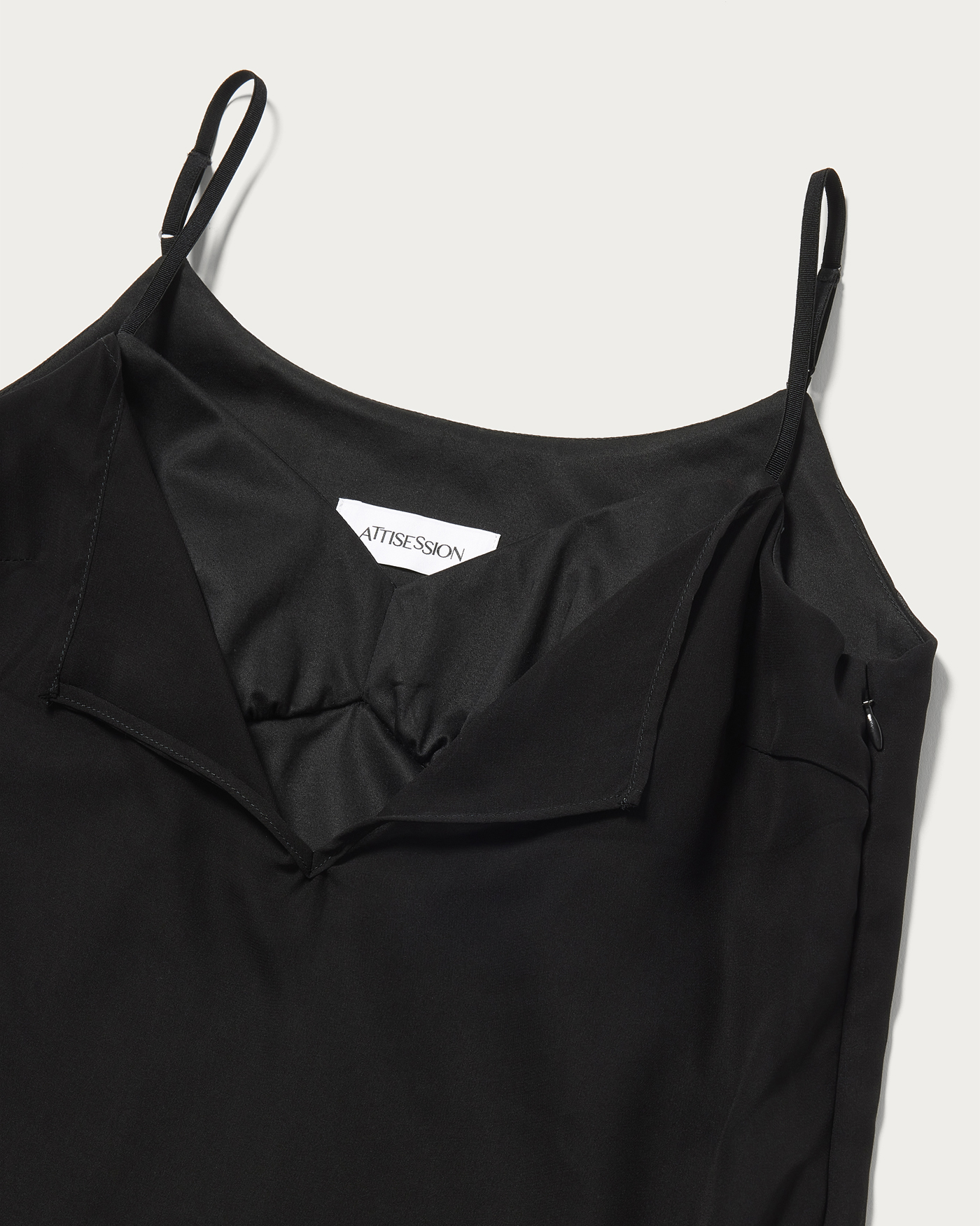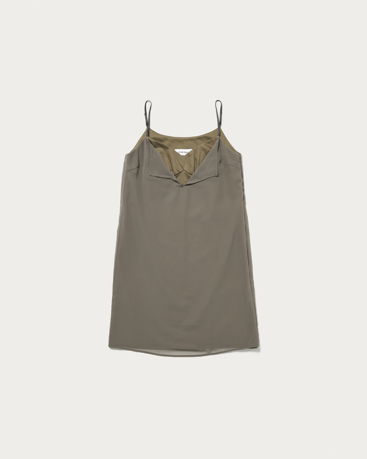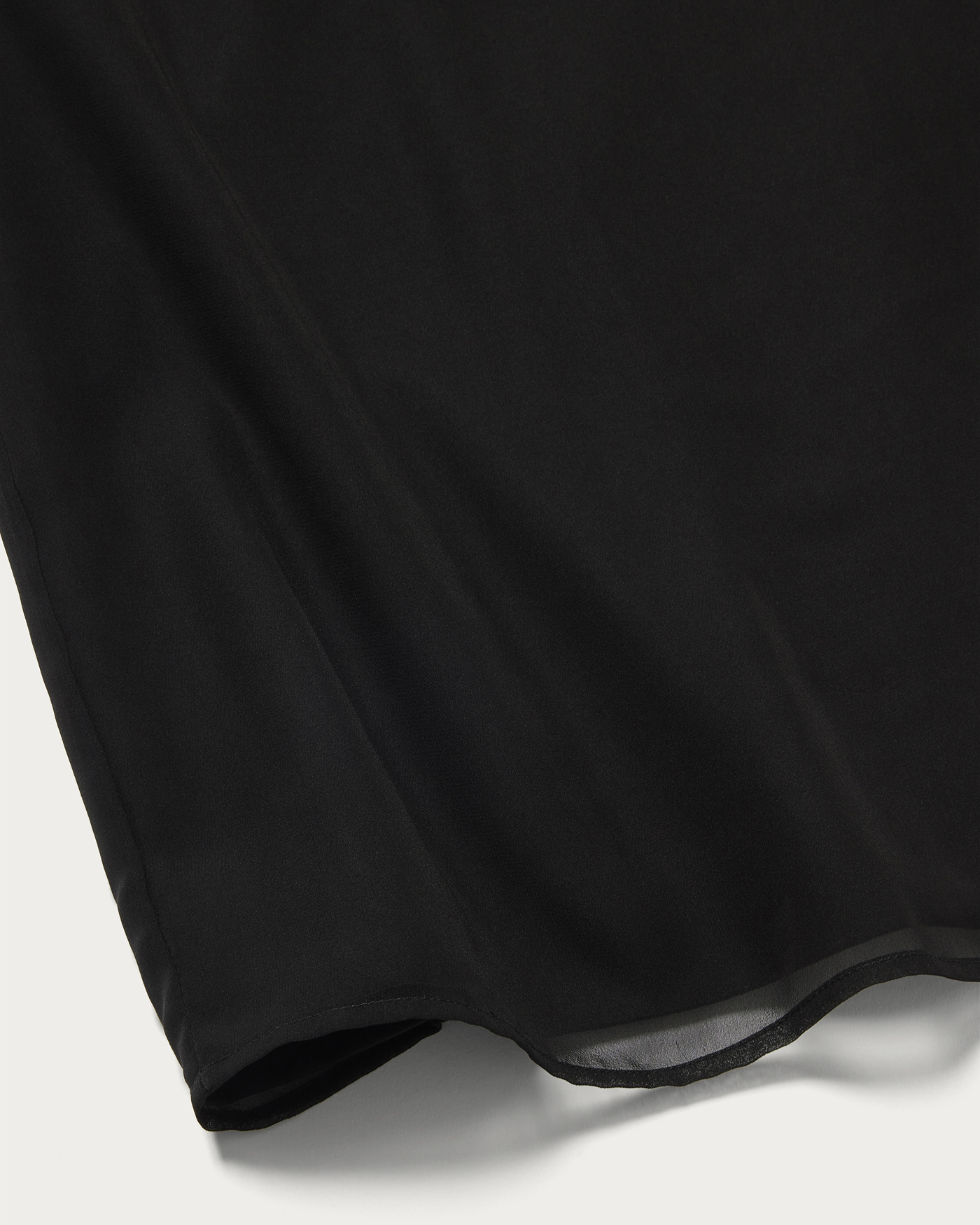 A mini dress designed with layers of organza fabric over satin. The neckline features details that add a casual touch, and the delicate shoulder straps come with adjusters for a perfect fit. Available in two colors: a chic black and a nuanced dark brown.