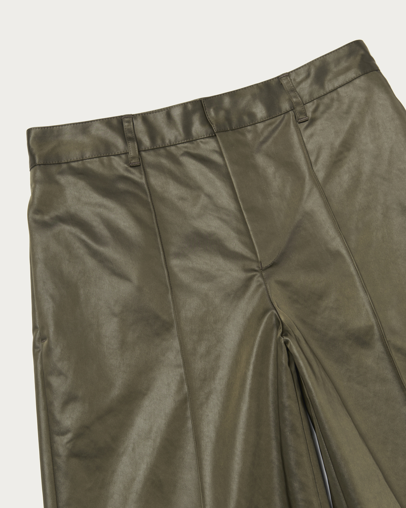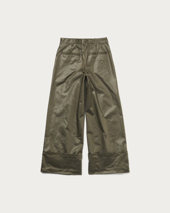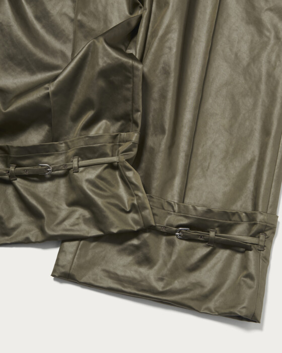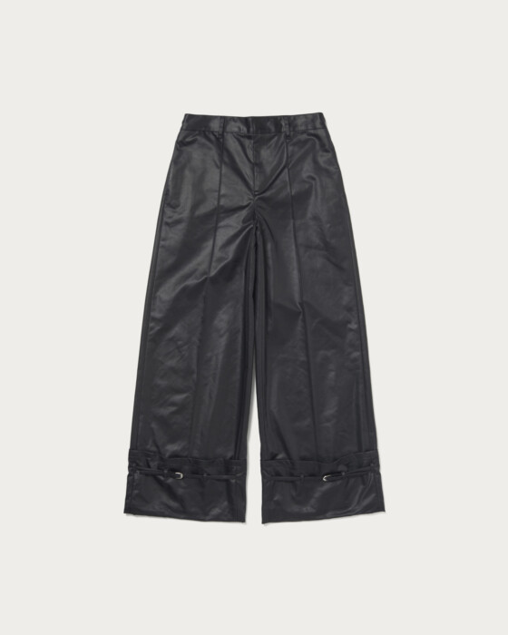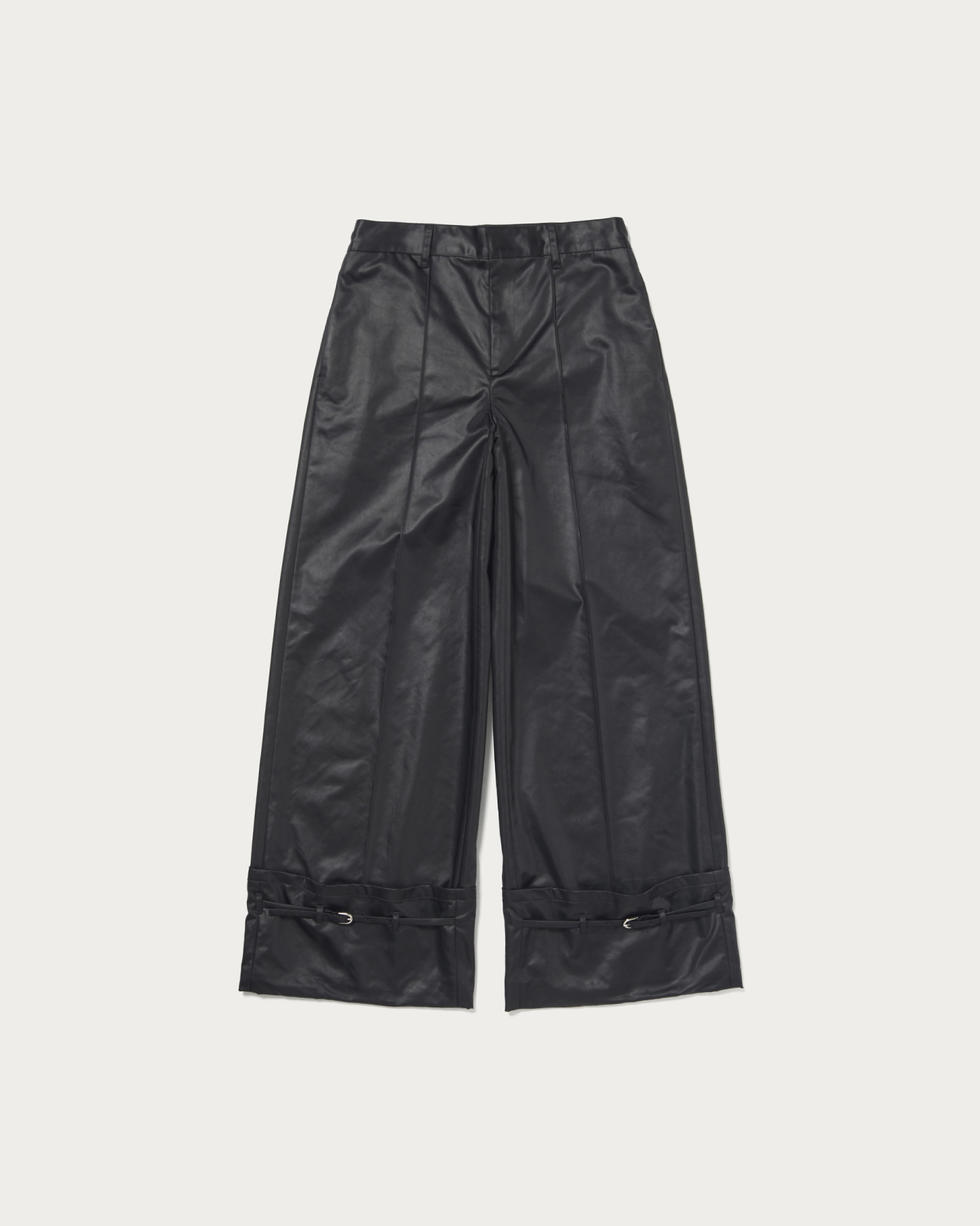 Pants made from satin material with a leather-like texture that creates an impactful and striking appearance. The hem features a folded design with belt details, adding an extra accent. With pintucks and a relaxed wide silhouette, this piece looks great even when tucked in.