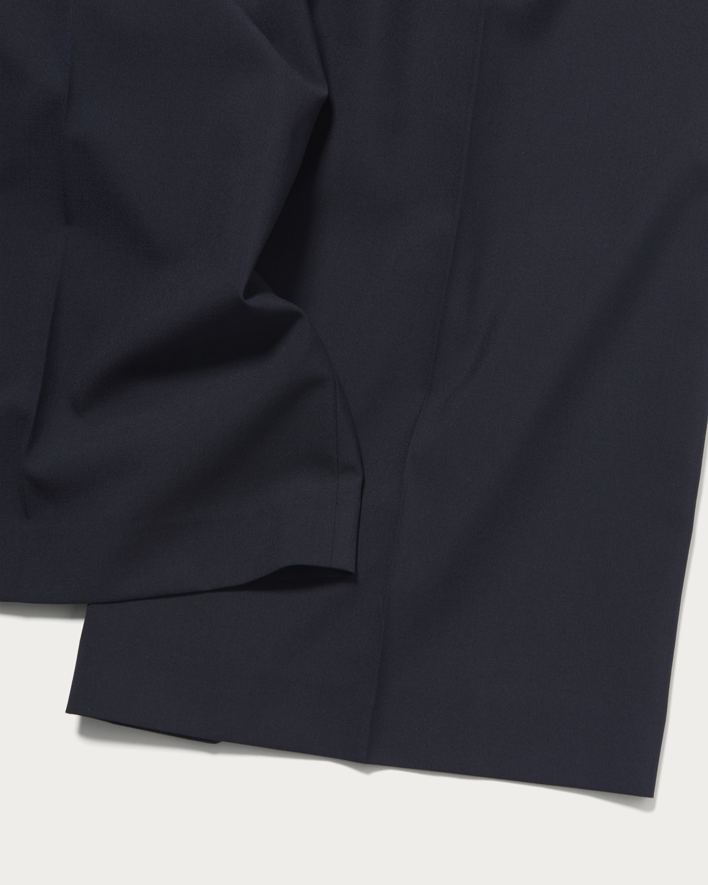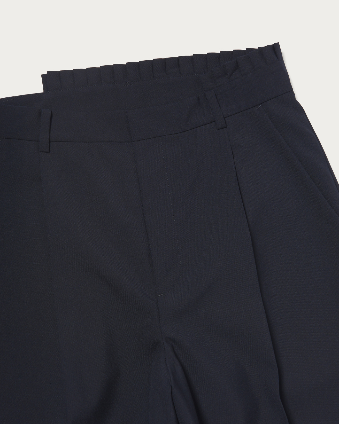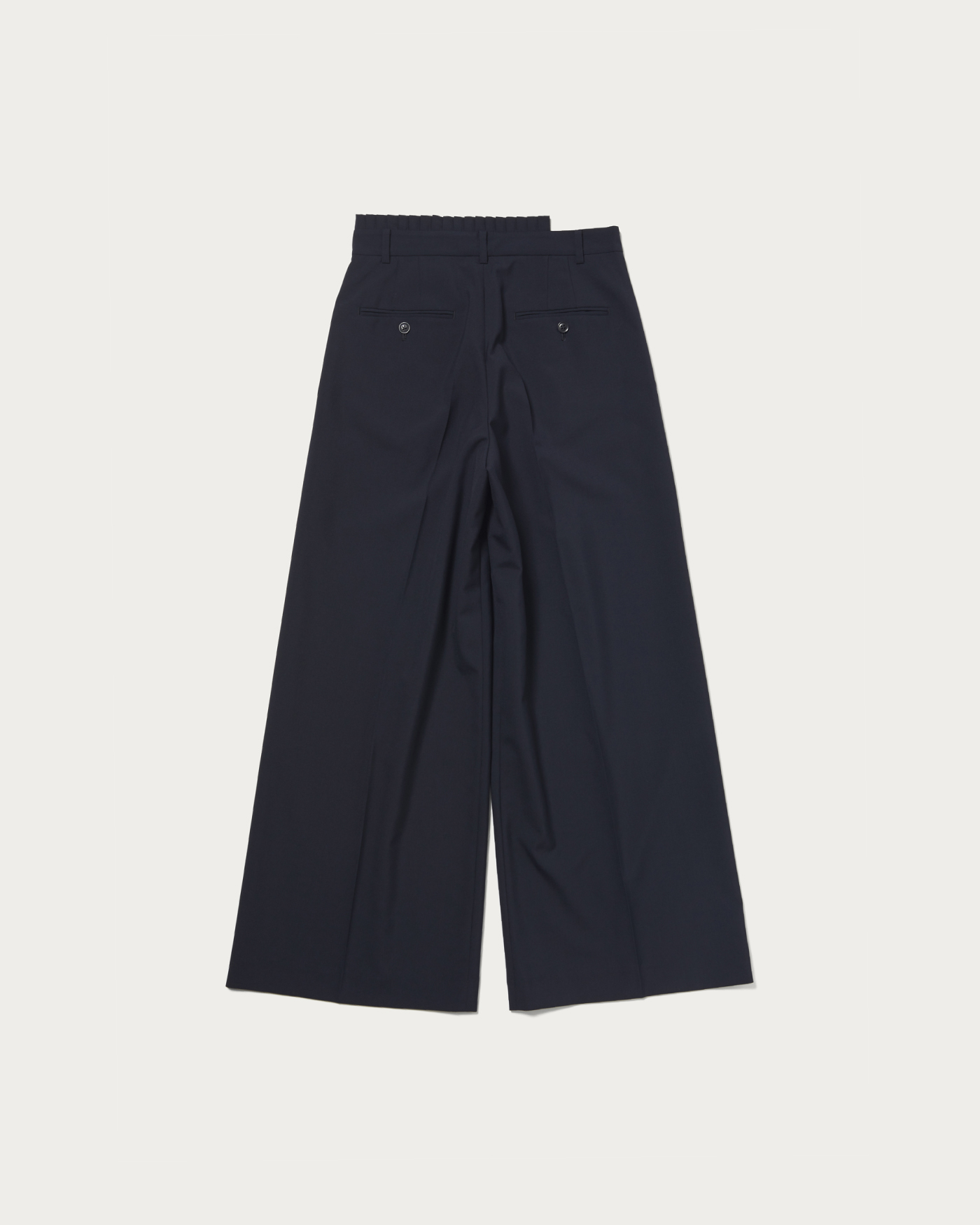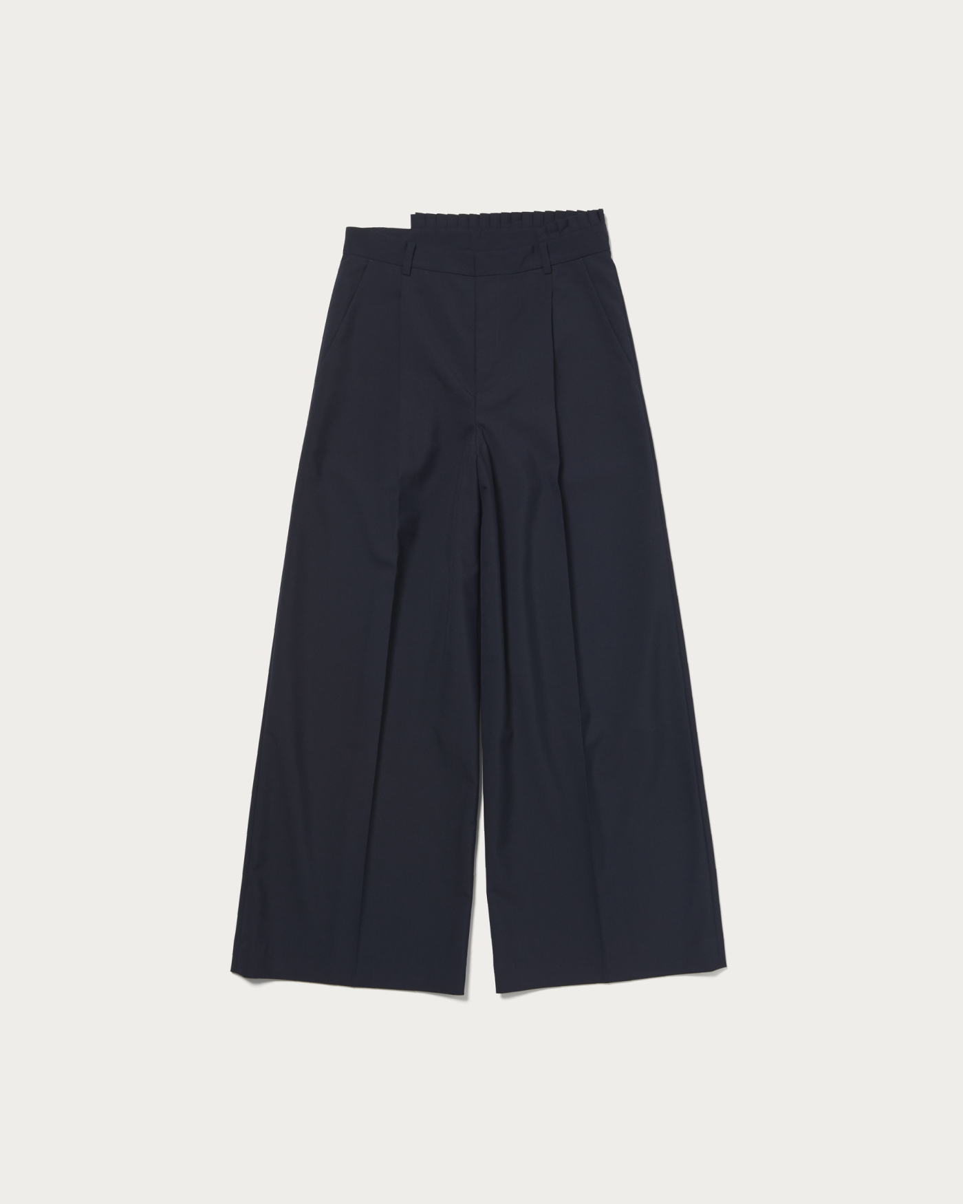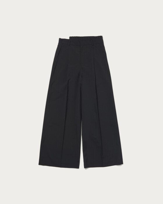 These wide slacks feature an impressive design with pleated parts made from the same material extending from one side to the back. With a single tuck, they offer a comfortable fit and an elegant silhouette suitable for any occasion. Available in two colors: chic black and a calm, sophisticated navy.