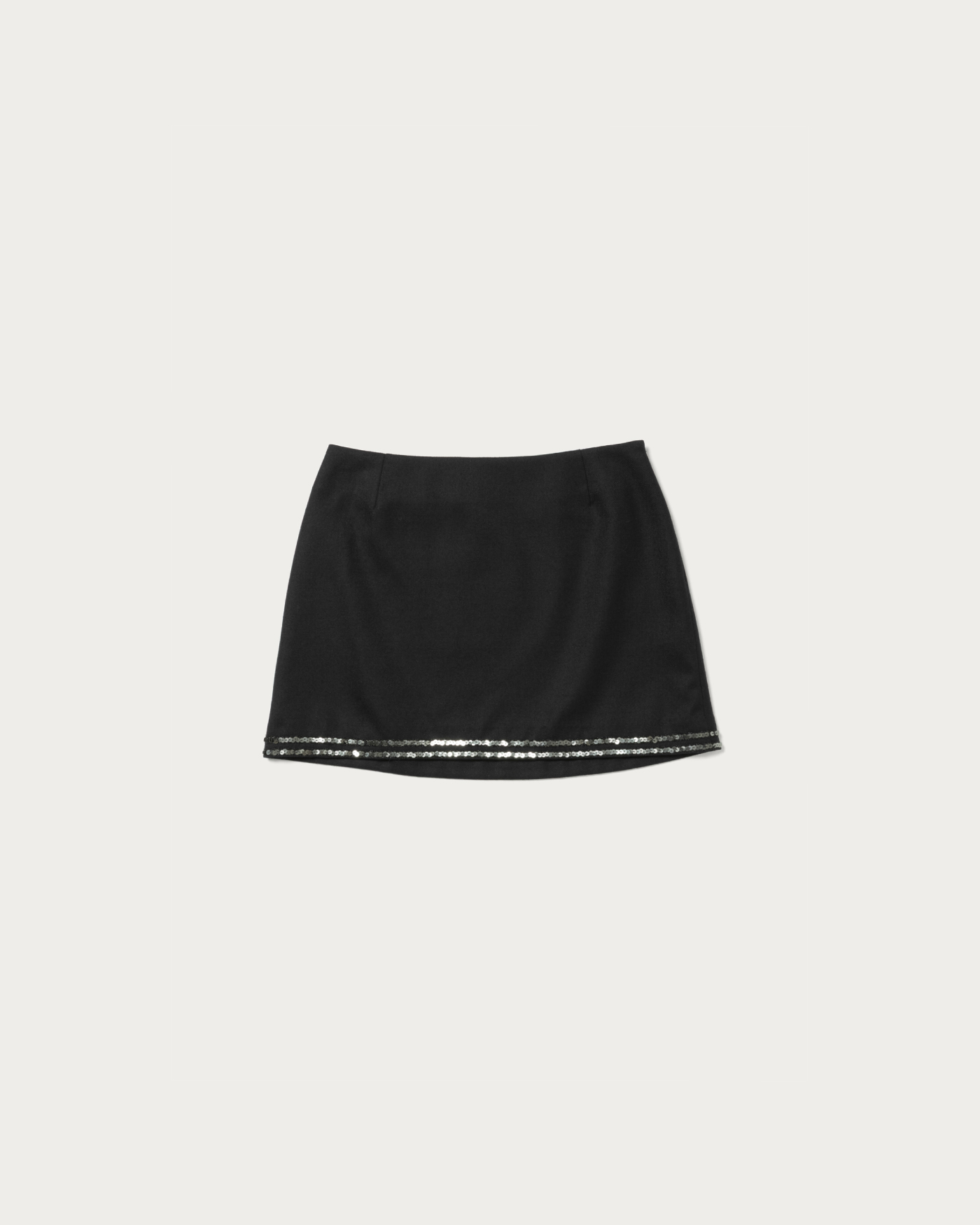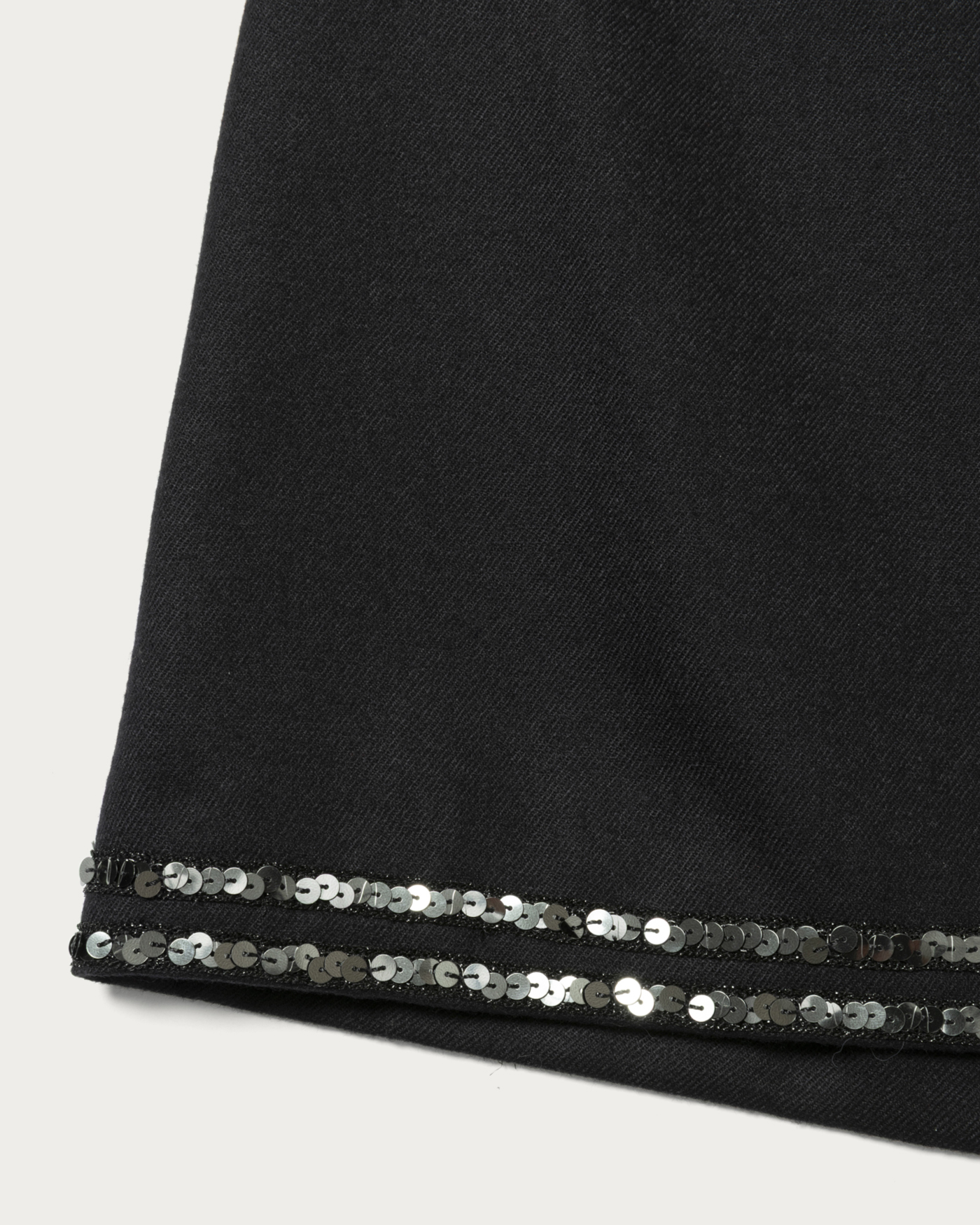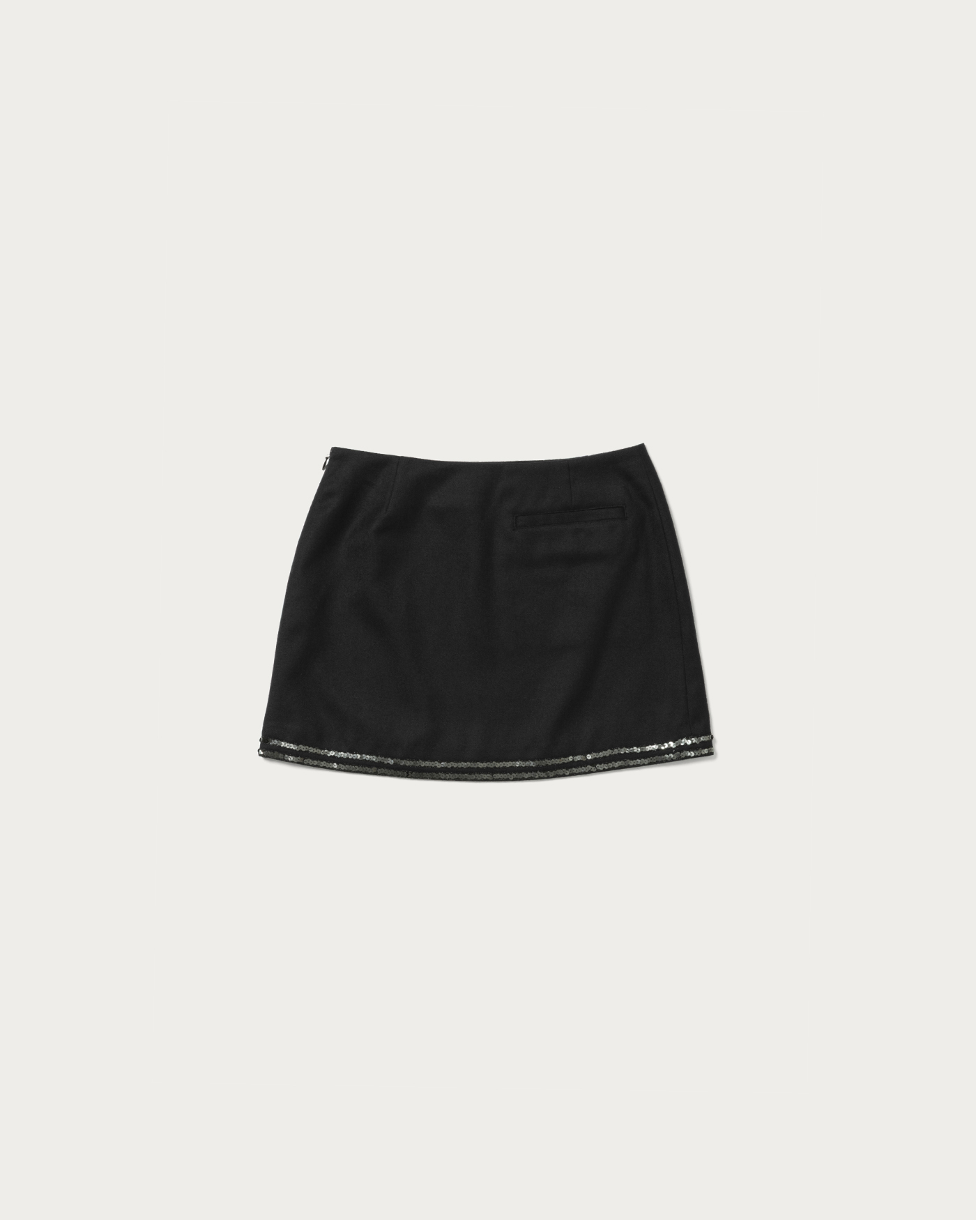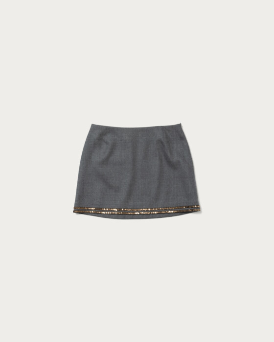 A simple yet elegant mini skirt featuring a line of sequins at the hem to add a touch of glamour. The slightly A-line silhouette is a delightful feature that enhances your style. It can be worn with bare legs for a fresh look, and it also pairs well with tights or socks, allowing you to enjoy various styling options.