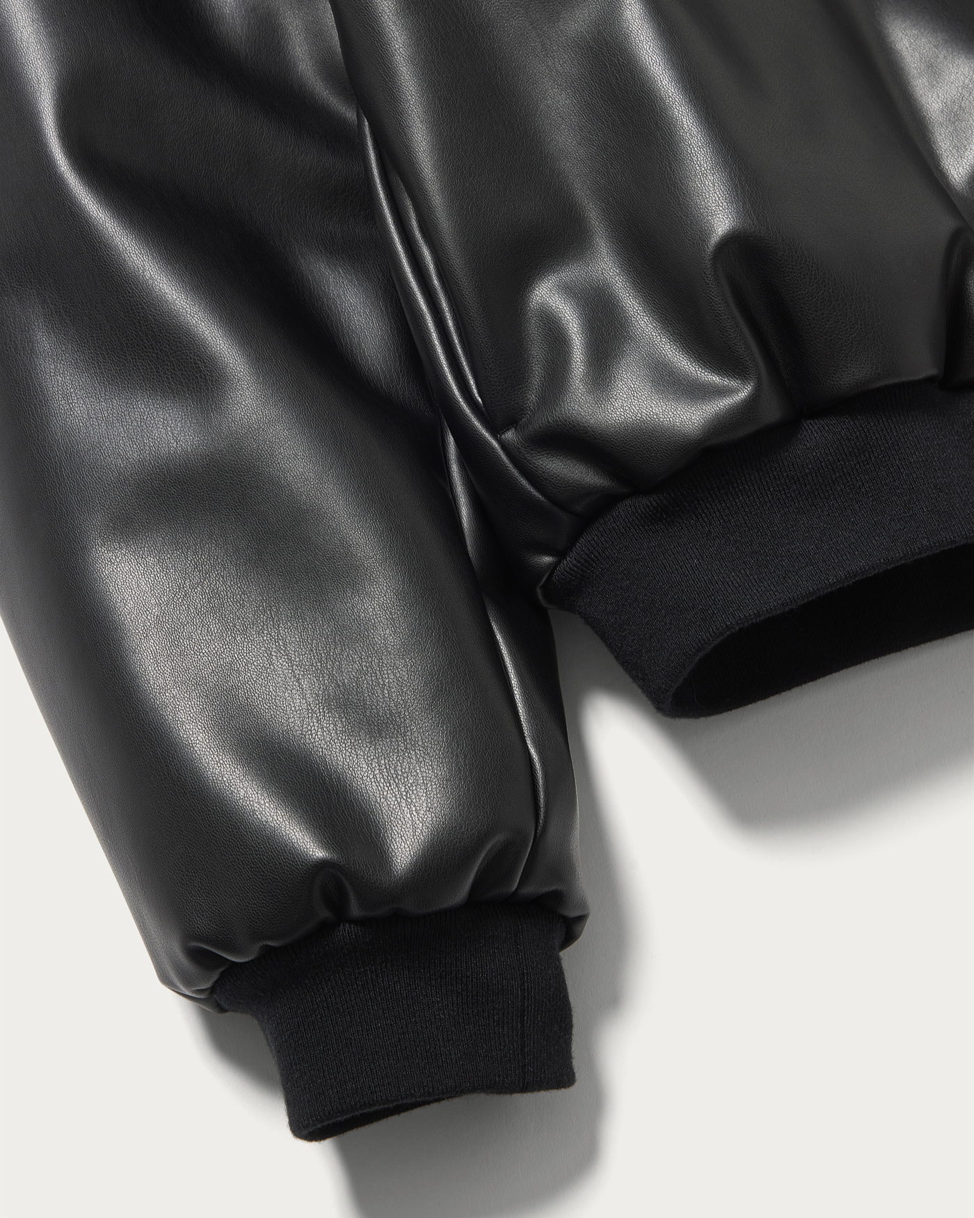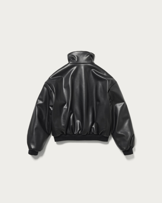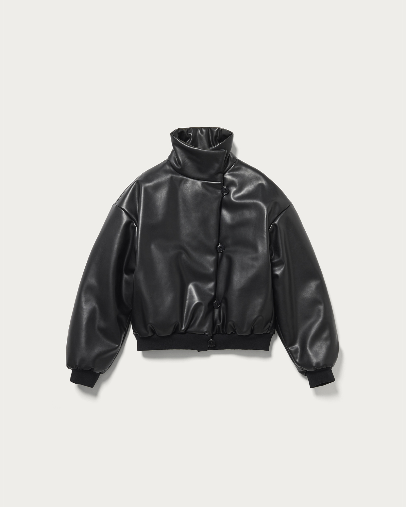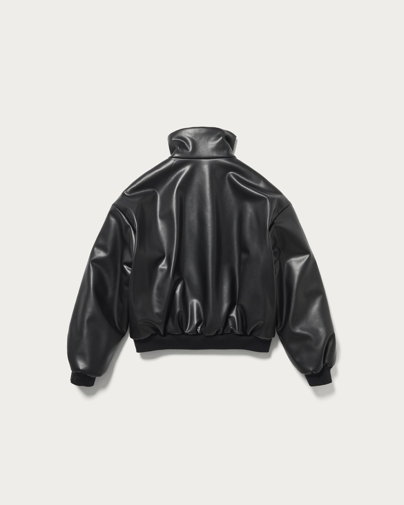 A leather-like short-length blouson that captivates with its simple, waste-free design that highlights the texture of the material. It features a padded design with filling, creating a silhouette with volume and dimension. The ribbed cuffs and hem add a sporty touch to this piece.