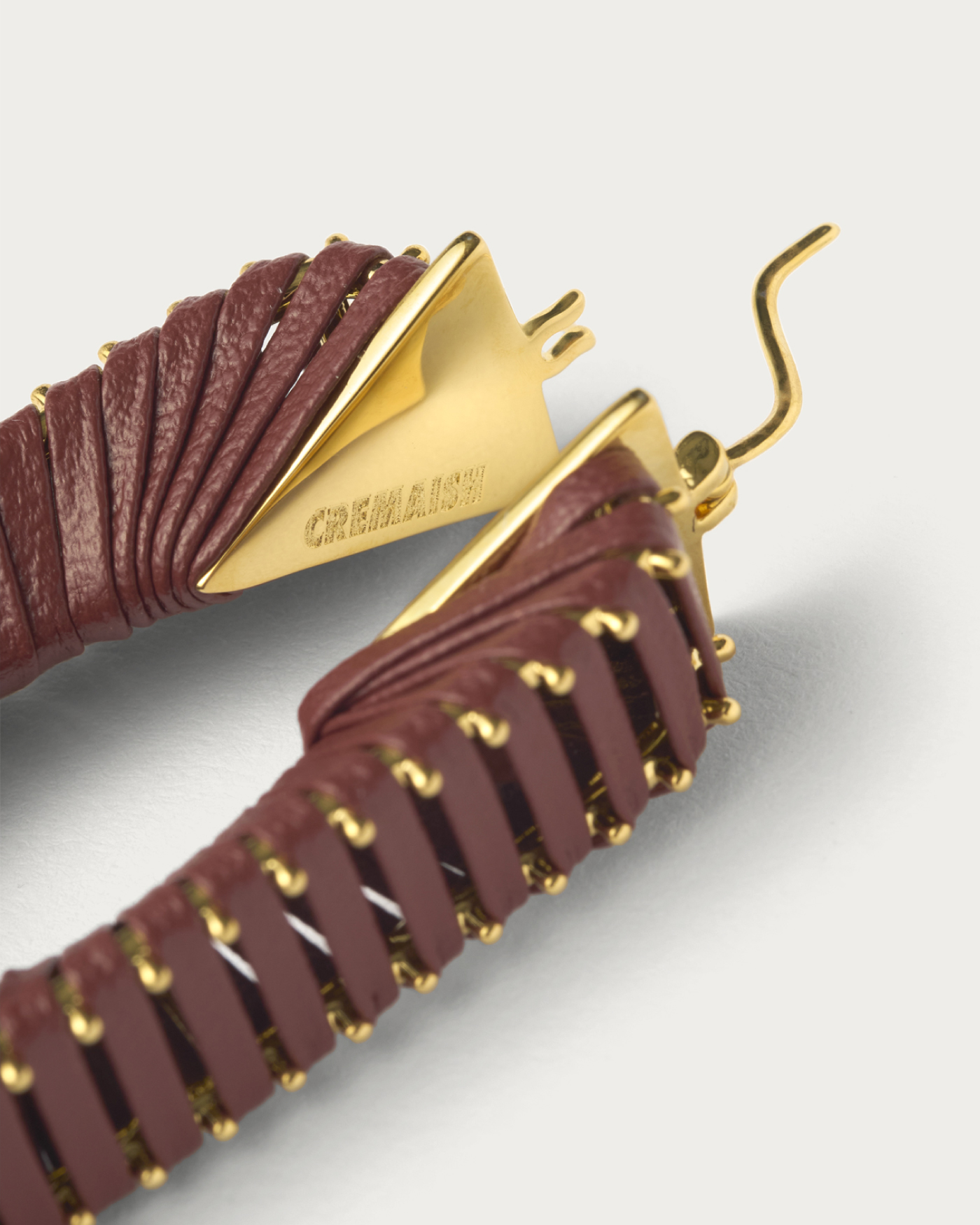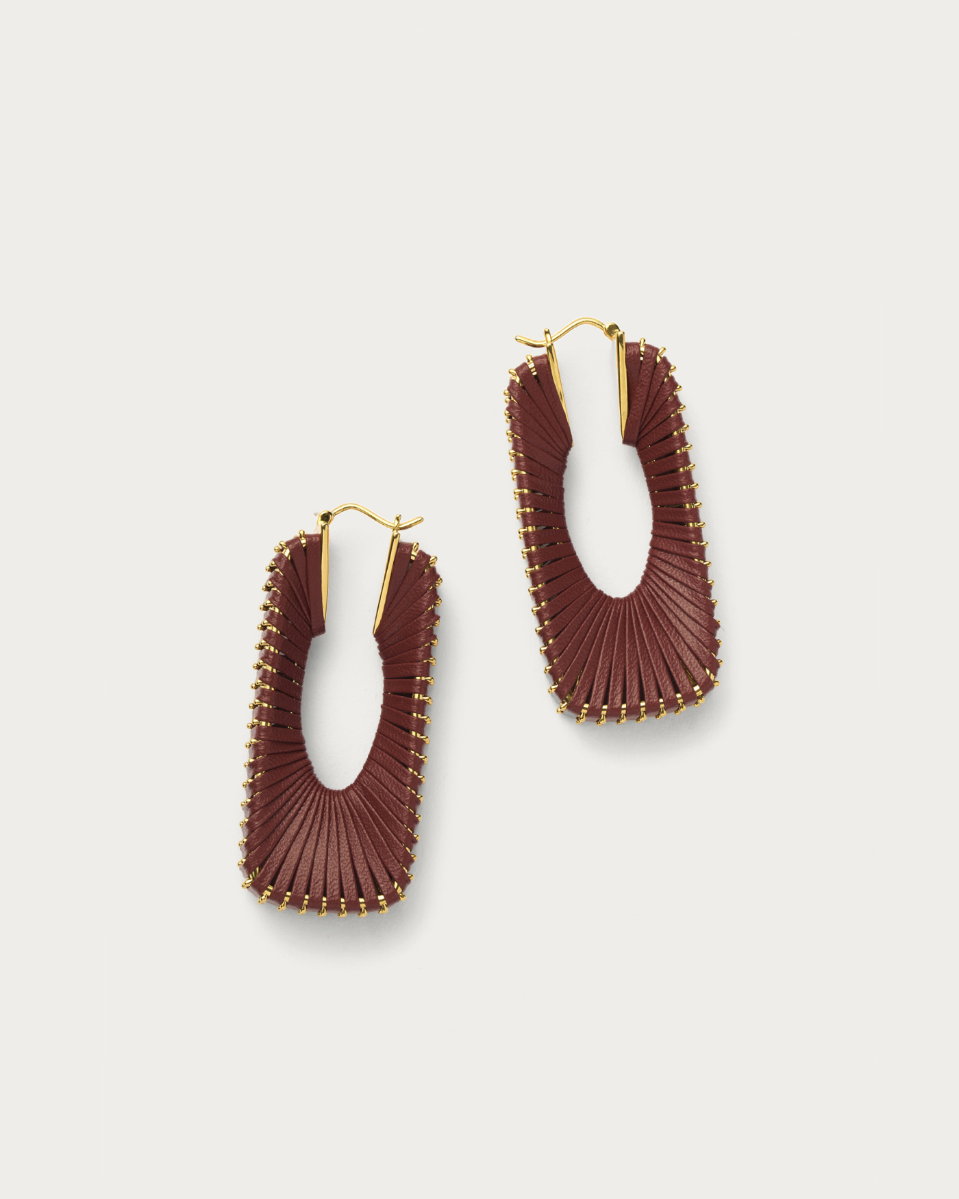 The earrings from the fashion brand 〈CREMAISH〉, based in Guangzhou and originating from New York, are characterized by their leather-wrapped design. With their large size, they add an accent to any outfit.