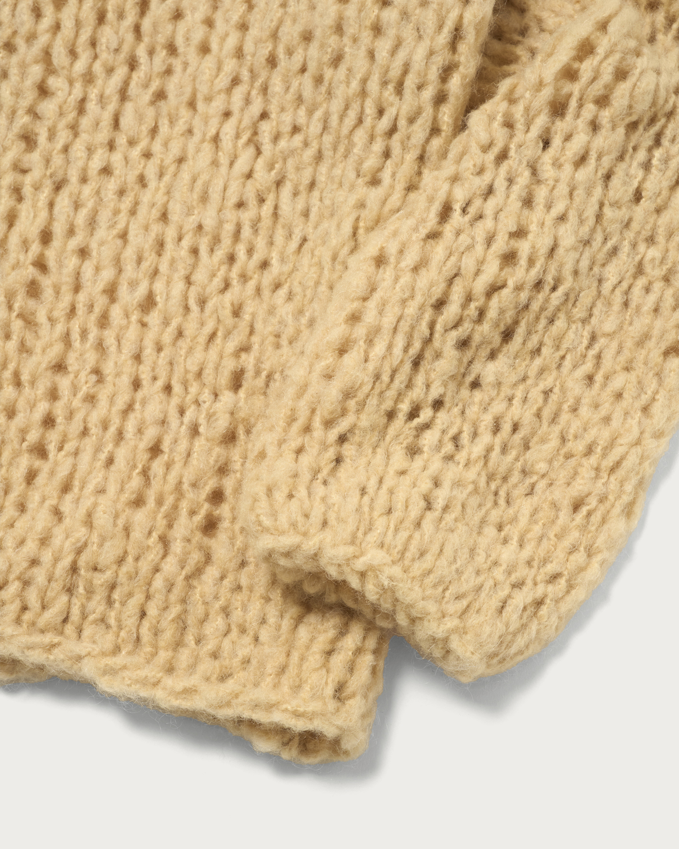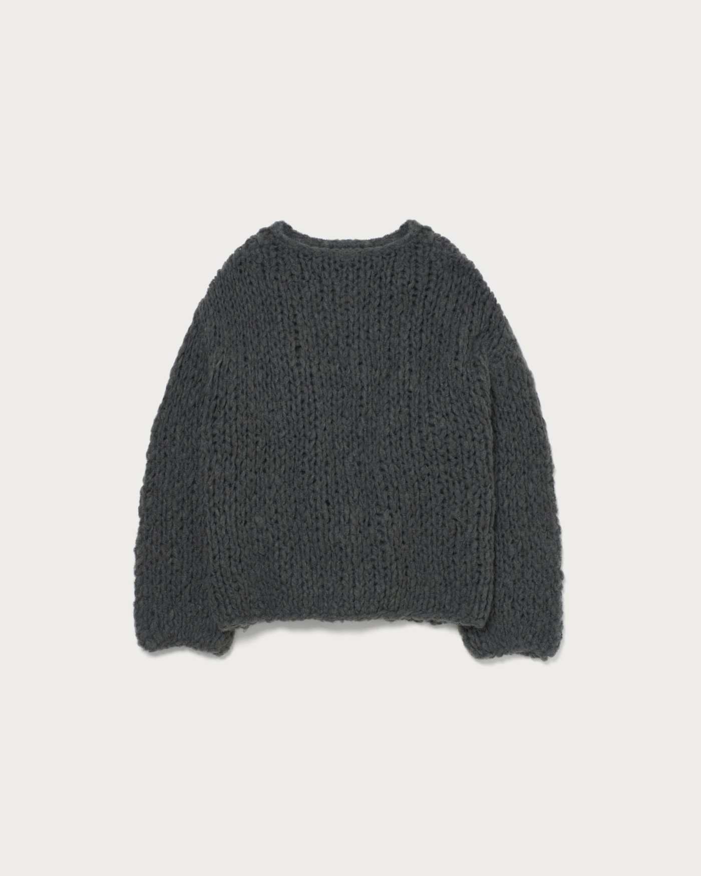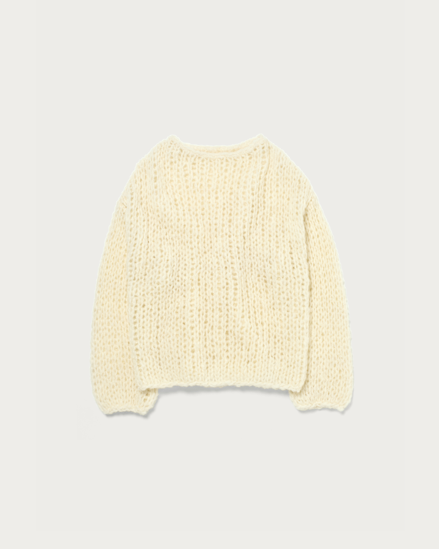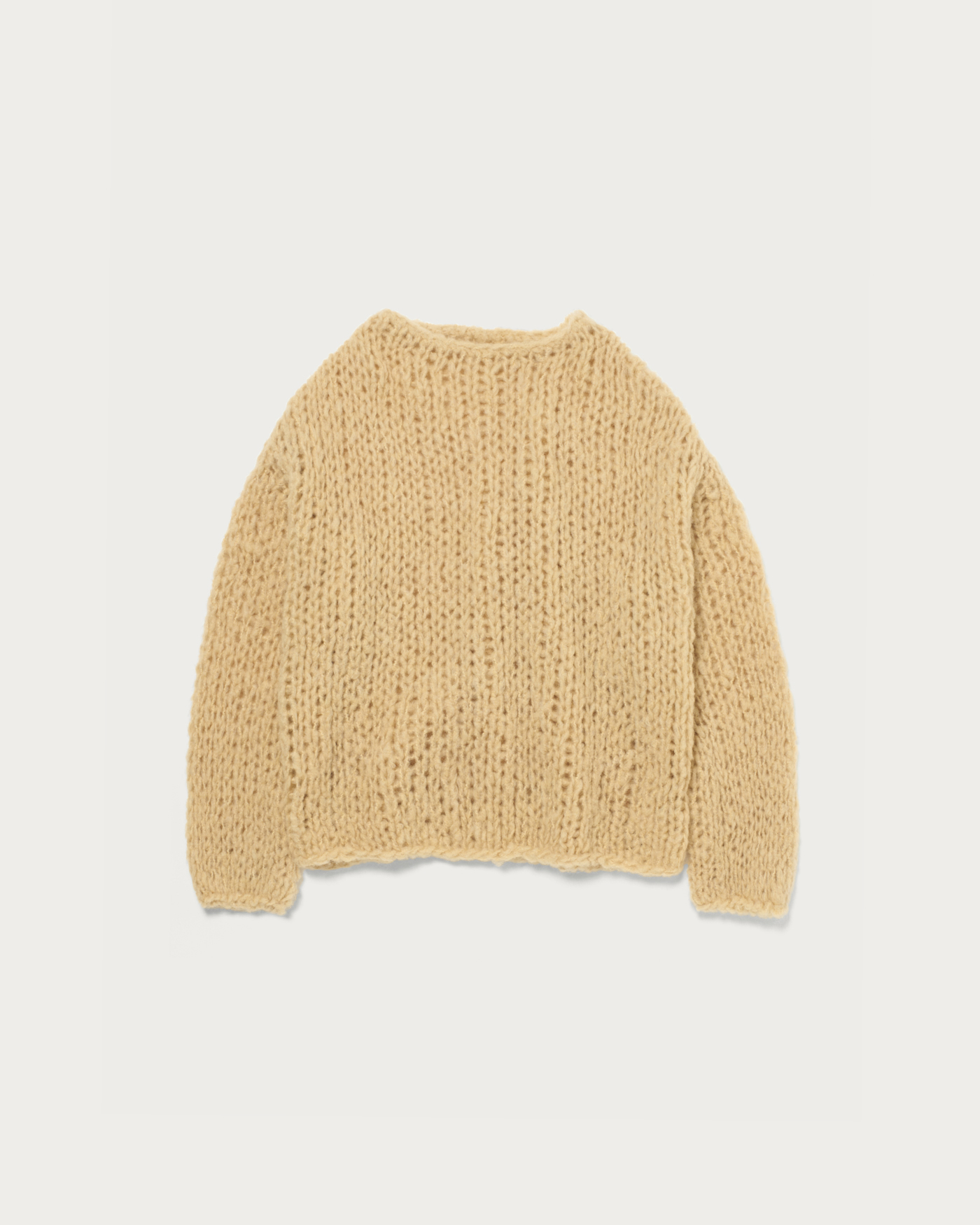 A loose-knit sweater made with specially ordered thick yarn that has been brushed to create volume. It is crafted using a 2G machine with a tuck stitch, resulting in a texture that resembles hand-knitted needlework. We recommend styling it with the corduroy pants from the same collection.