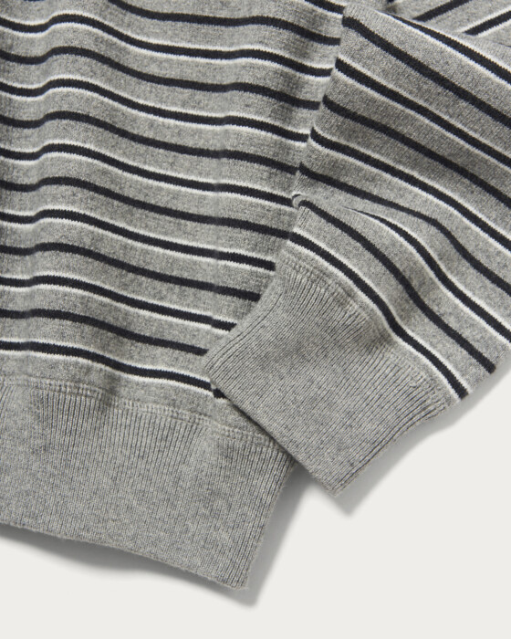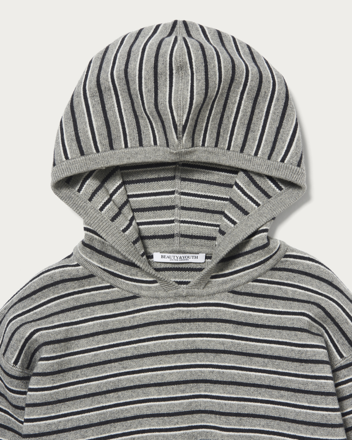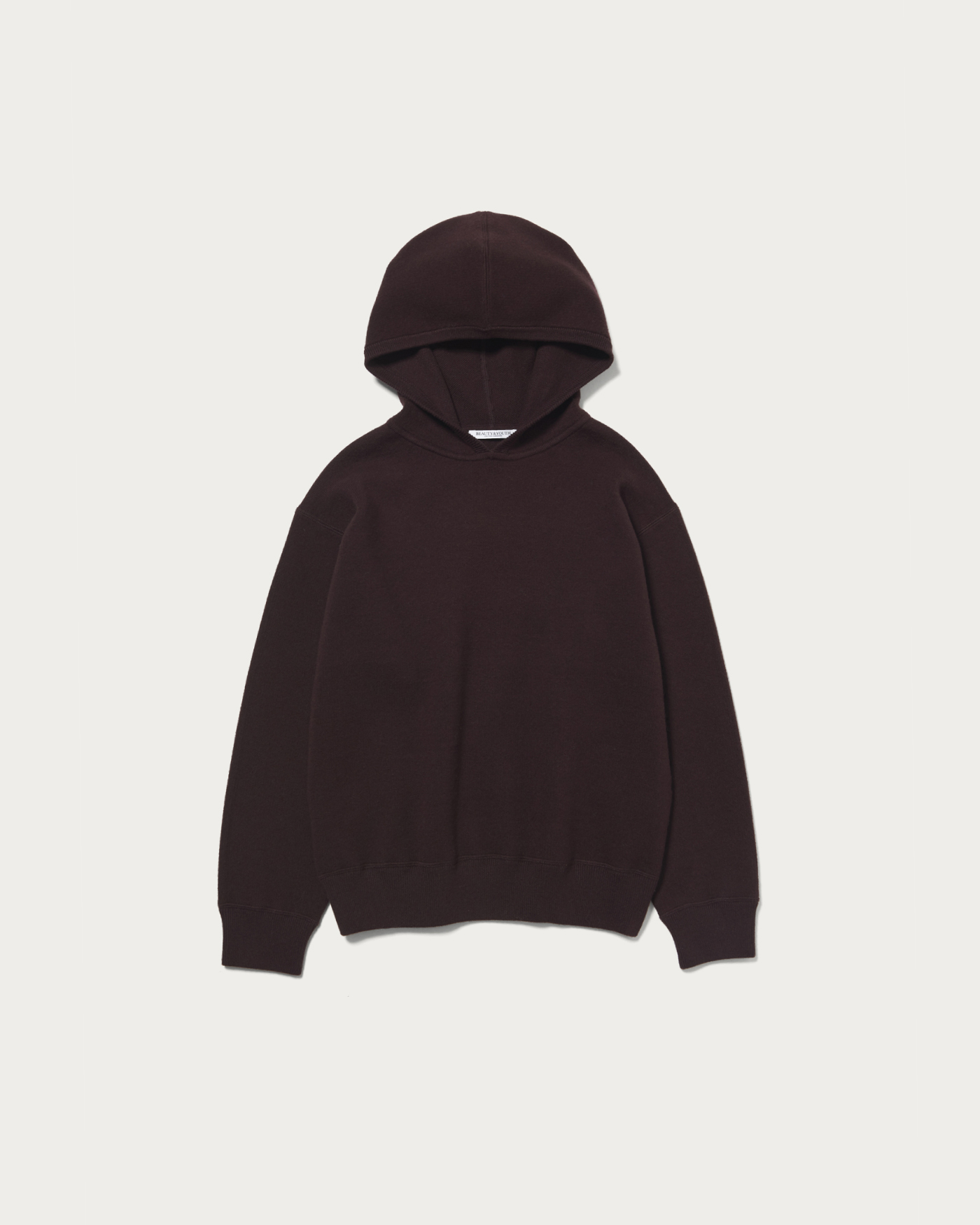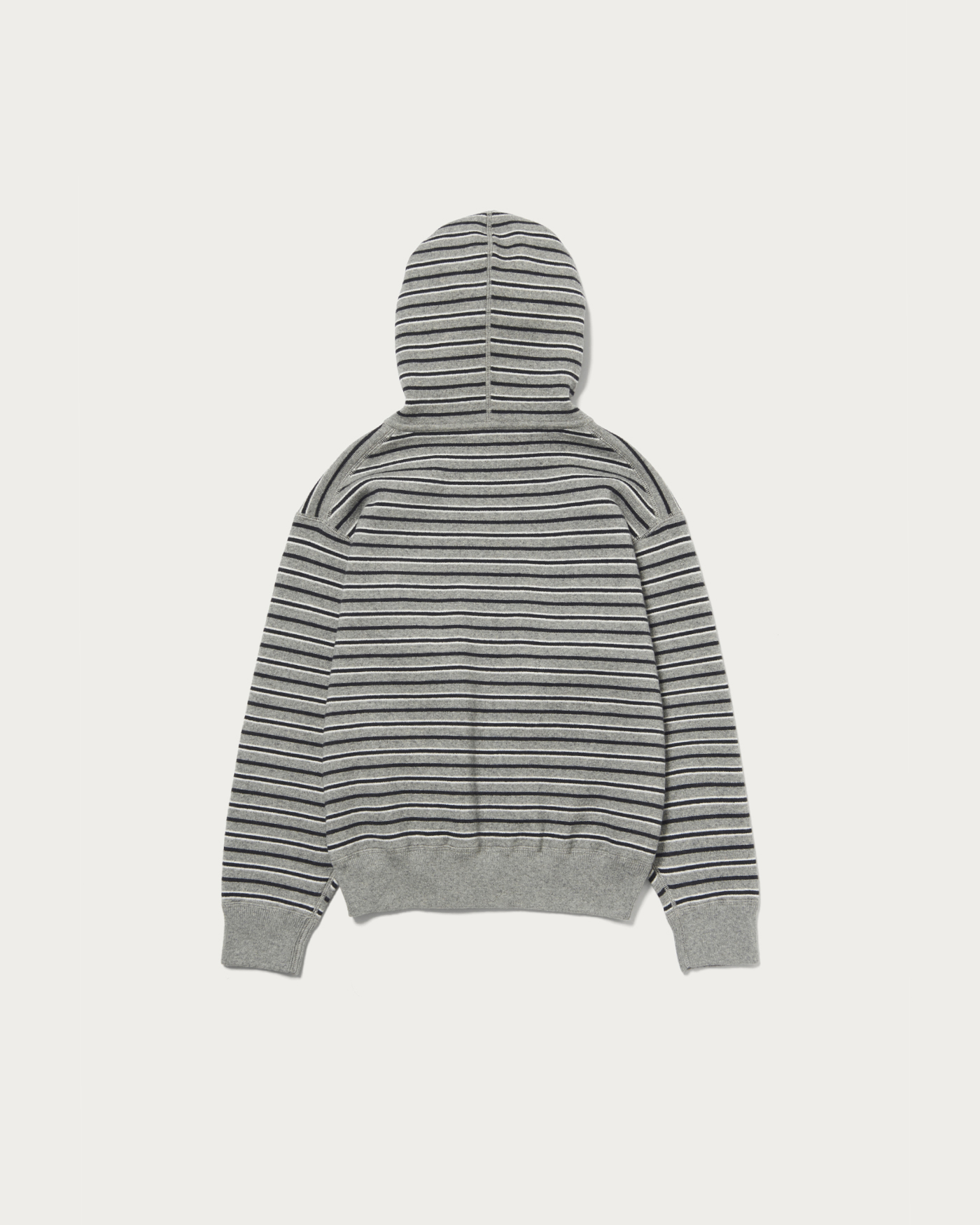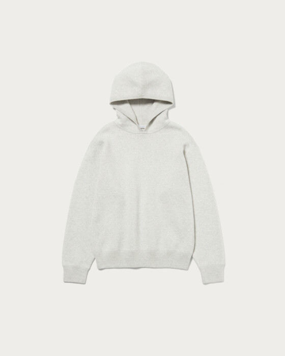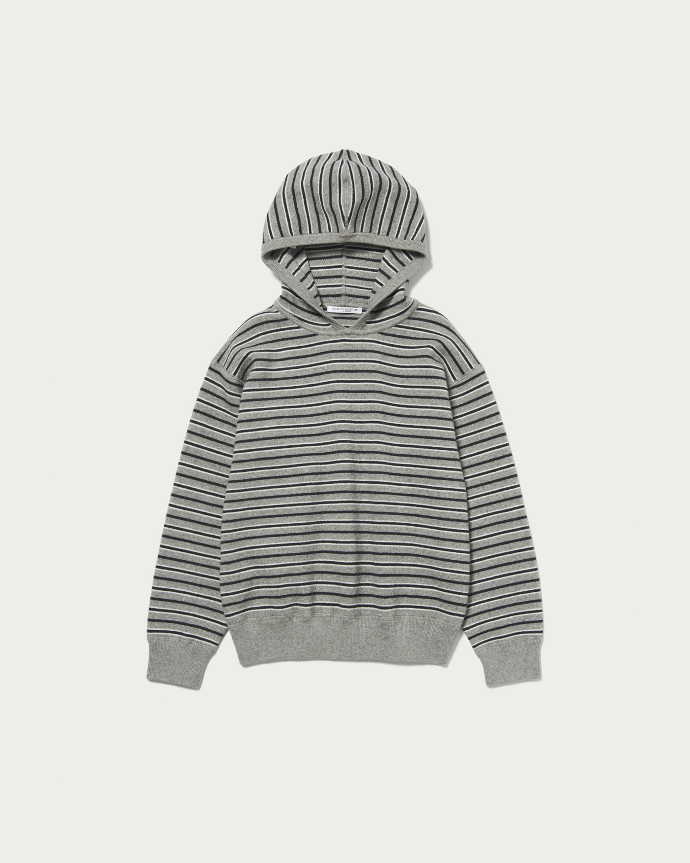 We have crafted a hoodie knit with a sweat-like feel using cotton wool yarn that combines the warmth of wool with the comfort of cotton. This piece features a unique single-color border design characteristic of knits, offering a more casual and original style. We recommend wearing it as an inner layer under a collarless jacket. It pairs well with a variety of pants and skirts.