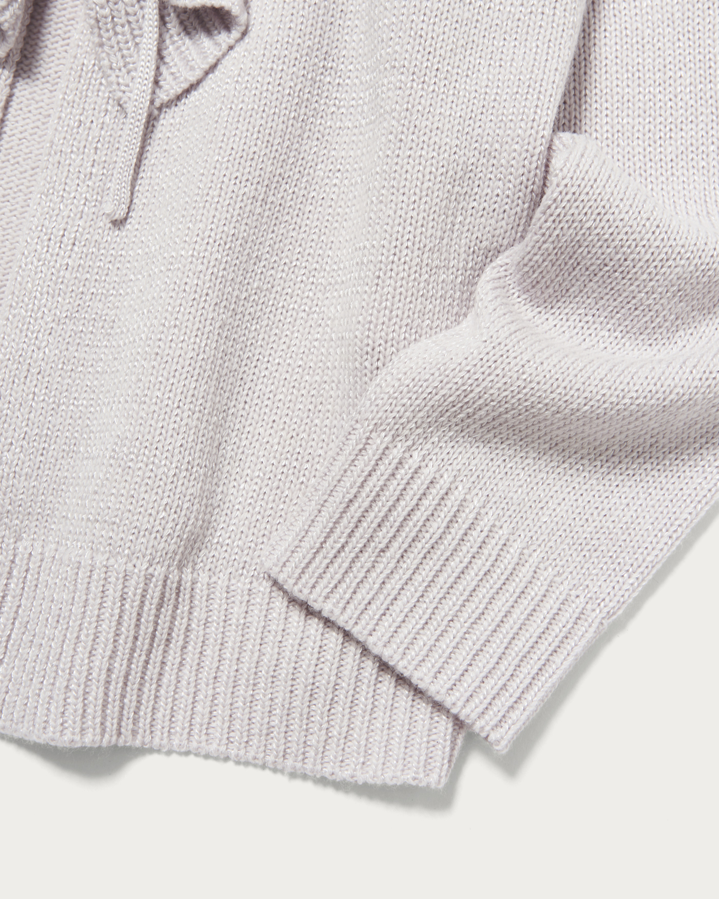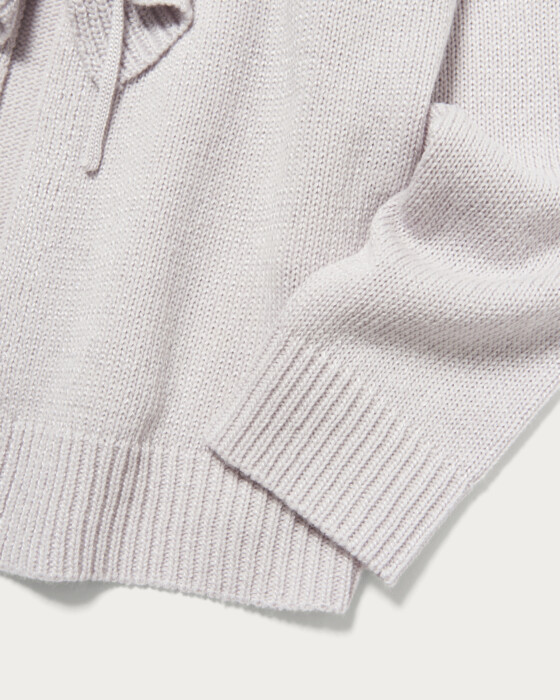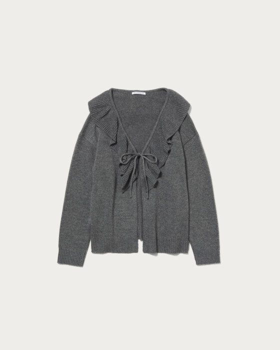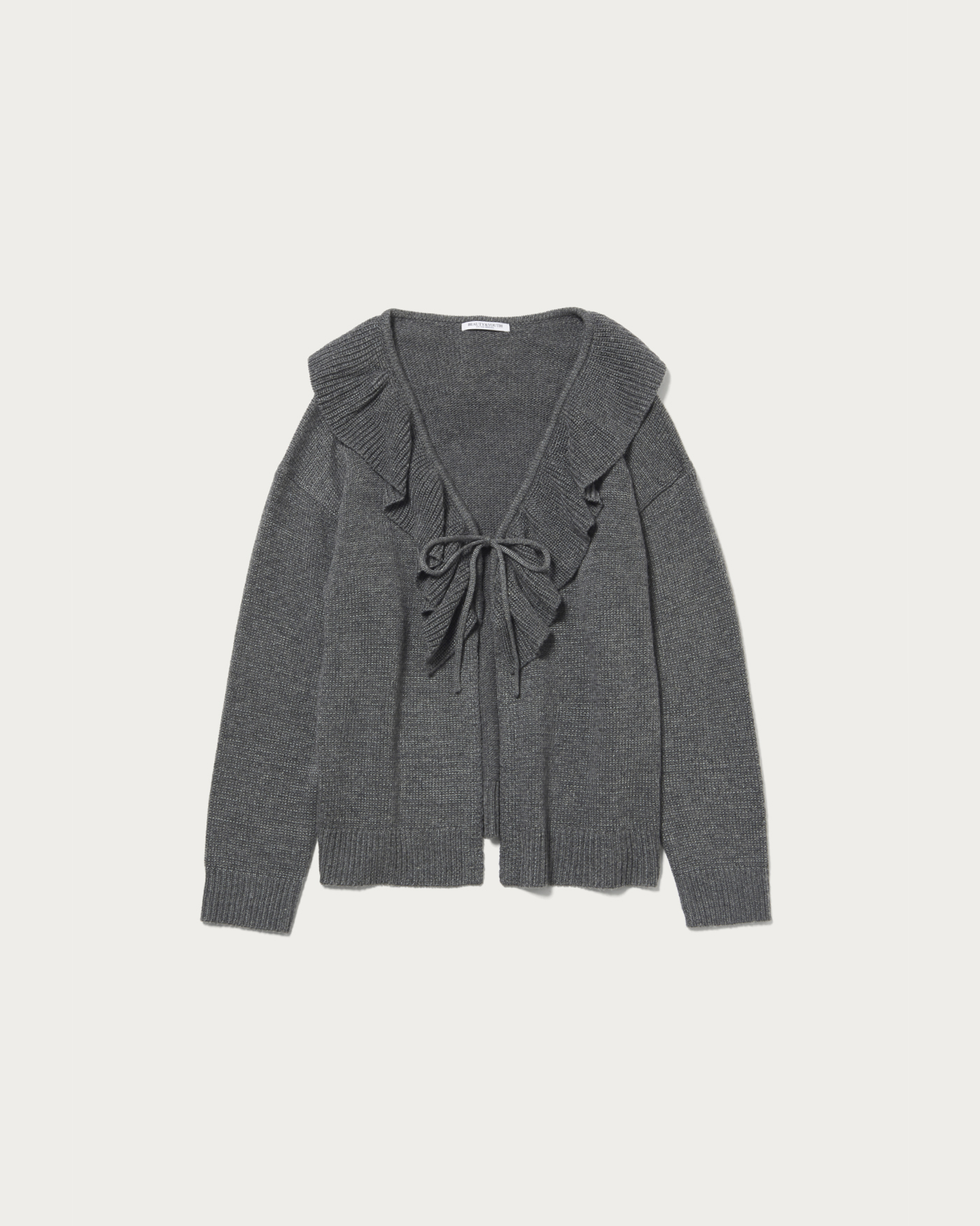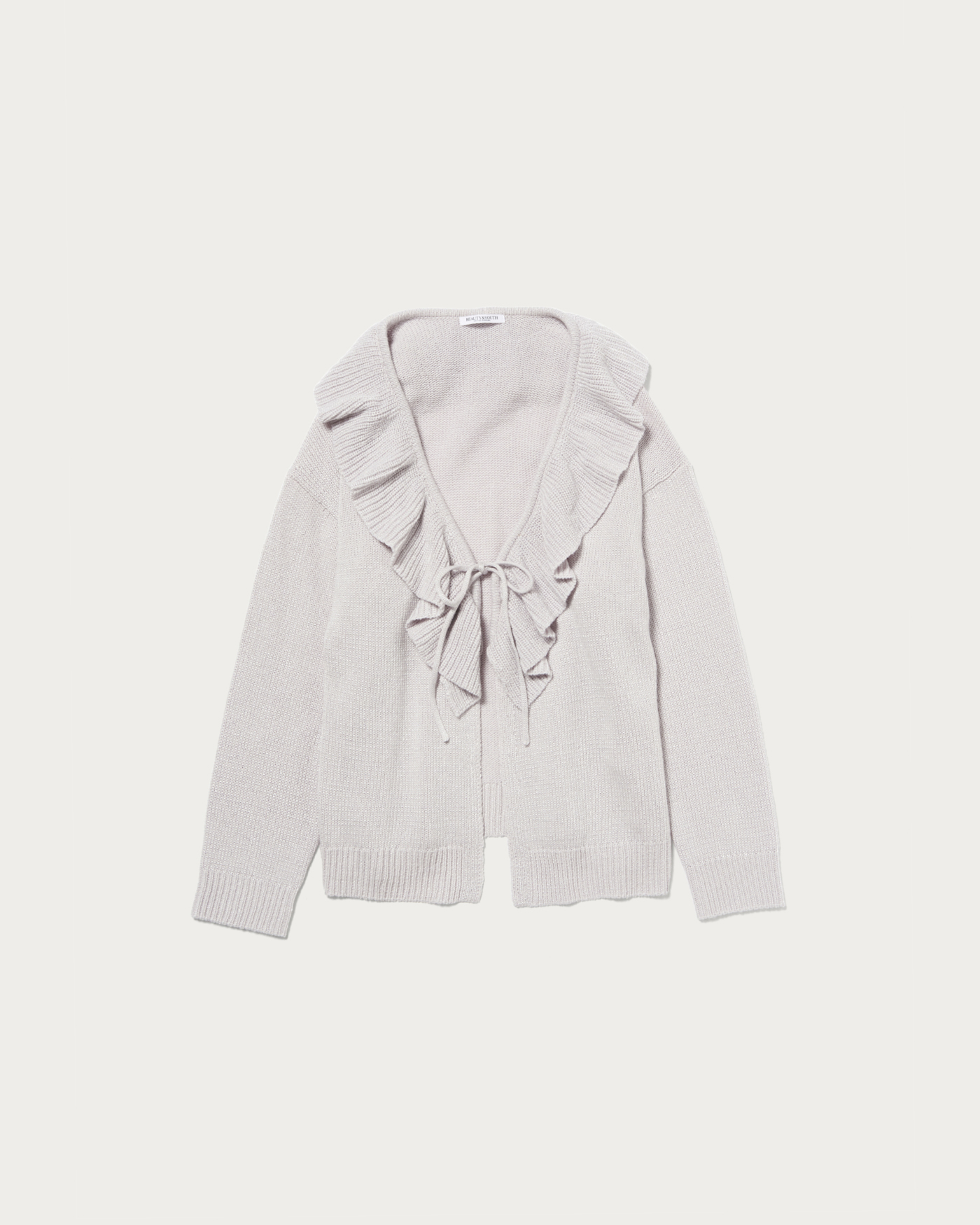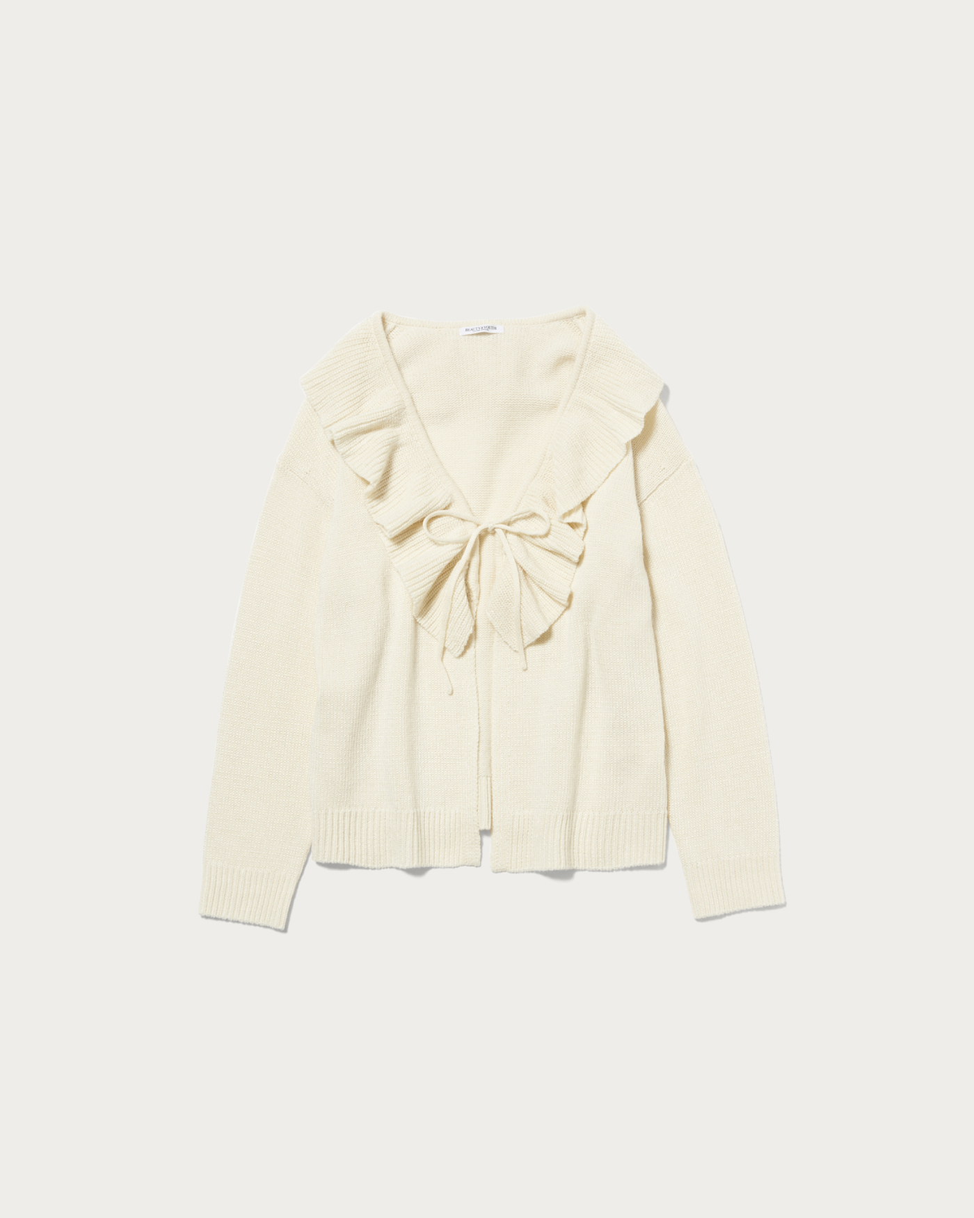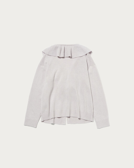 The focal point of this piece is the ruffle frill detail added to the neckline, enhanced with ribbon accents for a touch of casual elegance. It combines the warmth of wool yarn with the sheen of bright rayon yarn, subtly adding texture to the knit. It pairs beautifully with bottoms that have a drape, such as satin or worsted wool, as well as skirts. You can also wear it charmingly with a long-sleeve T-shirt layered underneath for a more relaxed look.