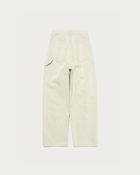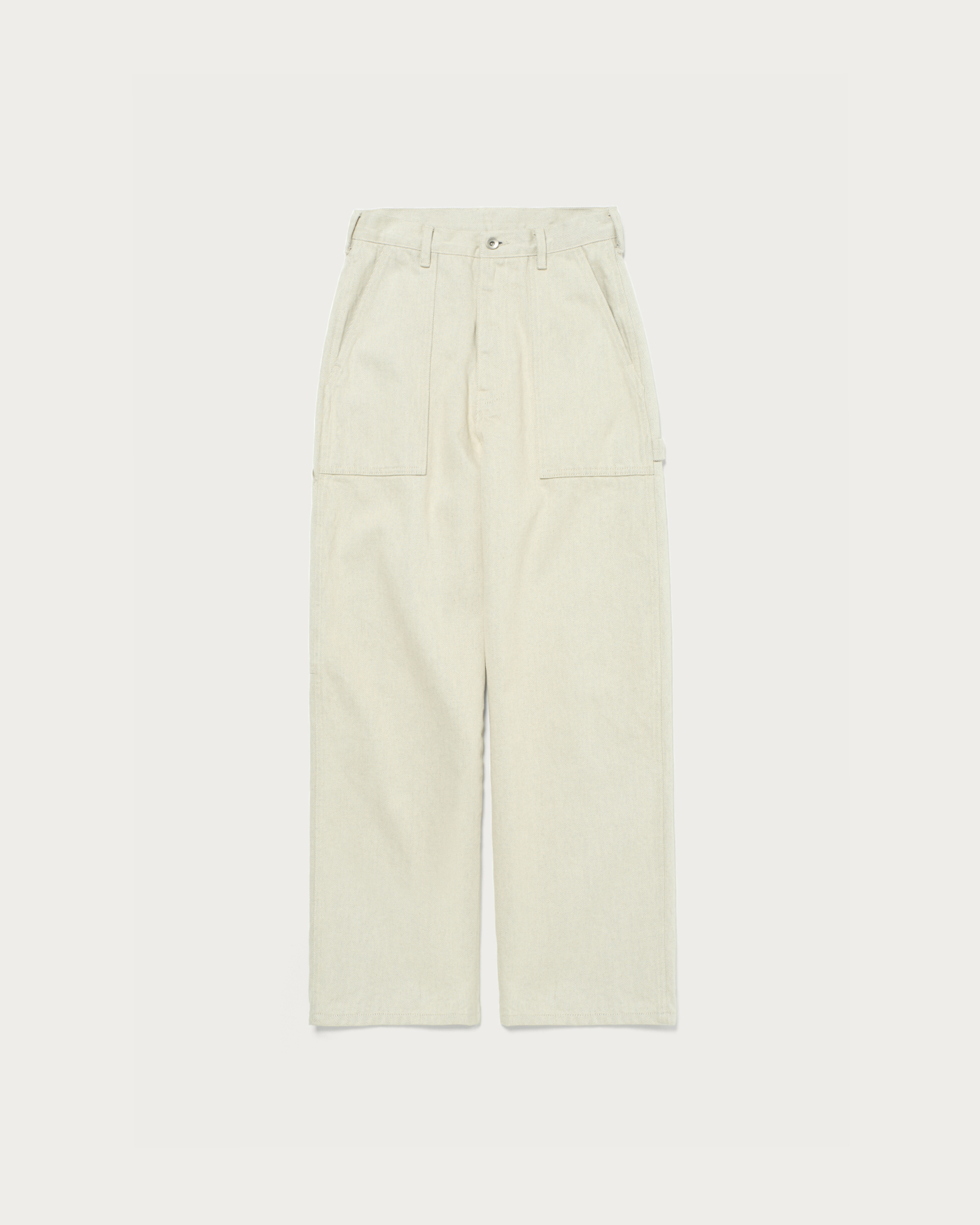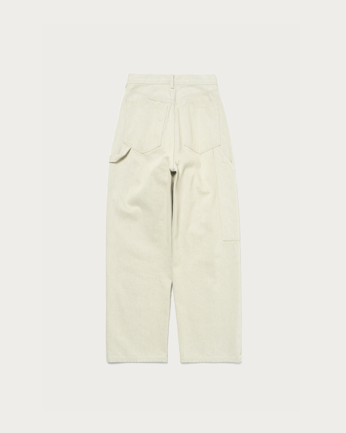 Painter pants featuring large patch pockets made from colored denim fabric. Designed with a slightly rustic silhouette, these pants are meant to be worn loosely. The lineup includes a rich mustard color and an off-white with a creamy hue, created by blending ivory with top-dyed threads. They pair perfectly with casual items like hooded knits or a mohair collarless jacket.