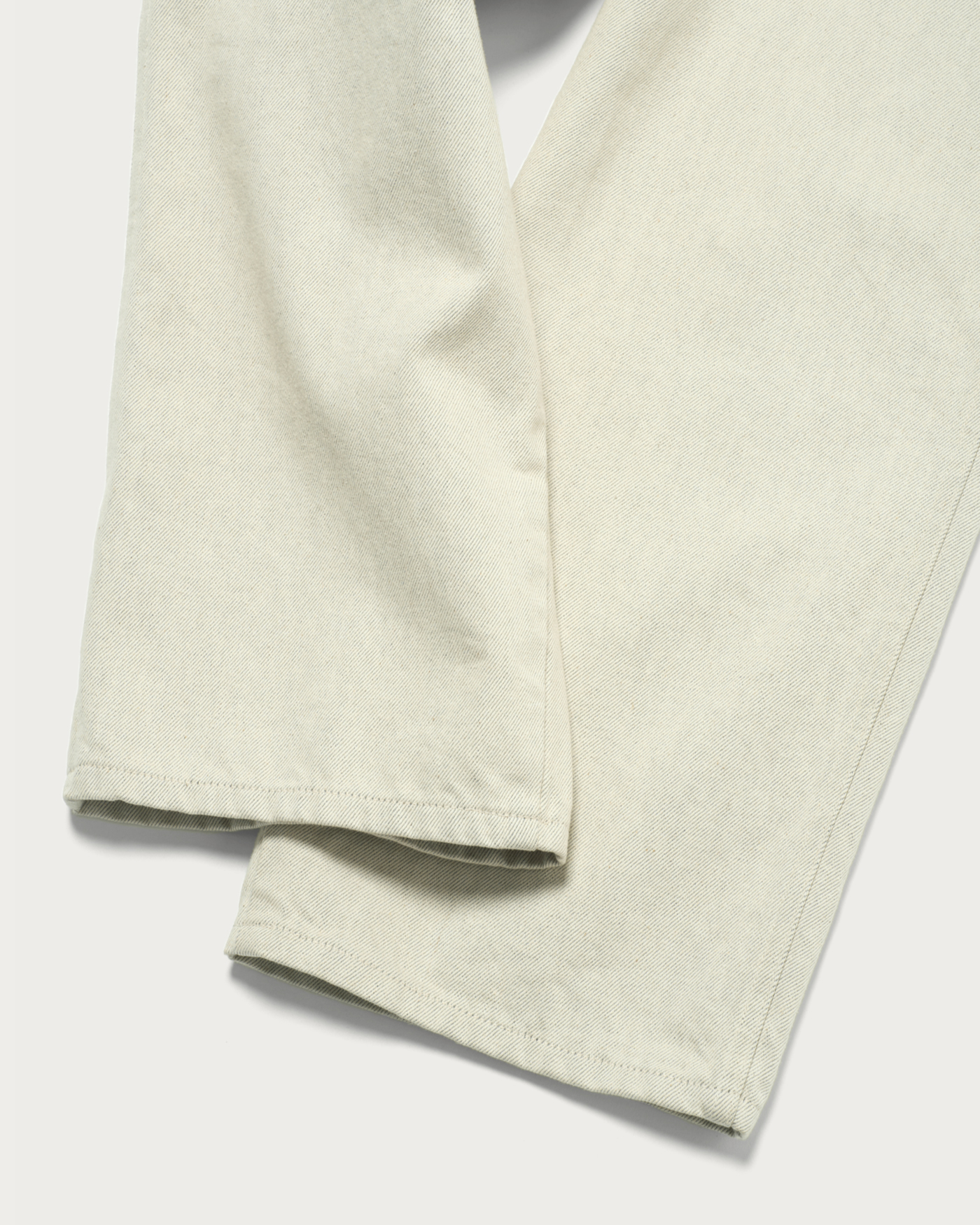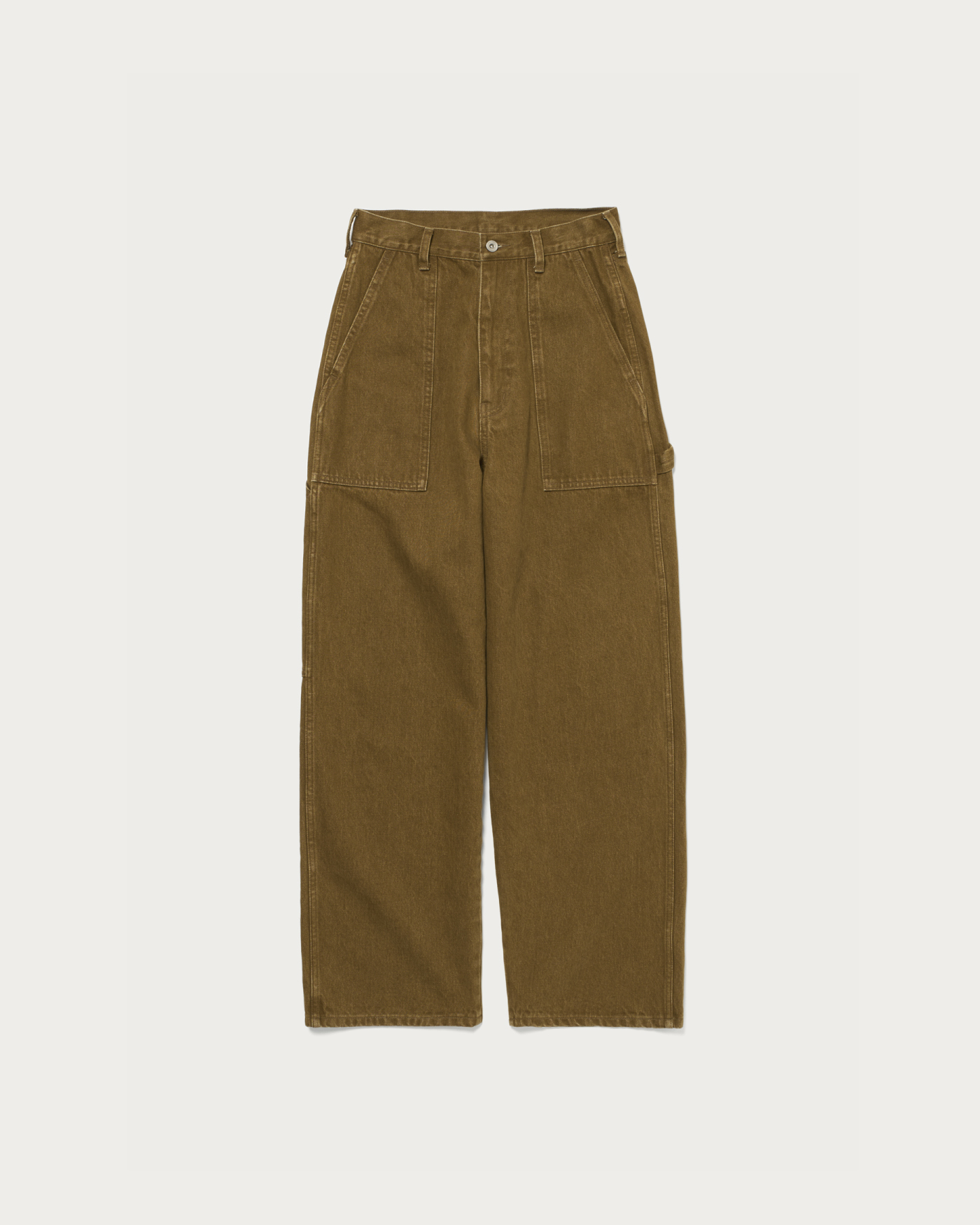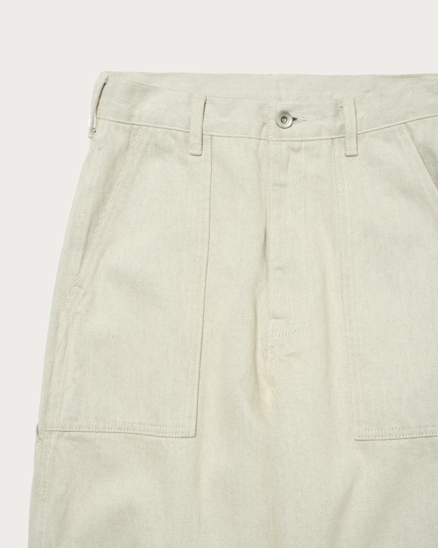 Painter pants featuring large patch pockets made from colored denim fabric. Designed with a slightly rustic silhouette, these pants are meant to be worn loosely. The lineup includes a rich mustard color and an off-white with a creamy hue, created by blending ivory with top-dyed threads. They pair perfectly with casual items like hooded knits or a mohair collarless jacket.