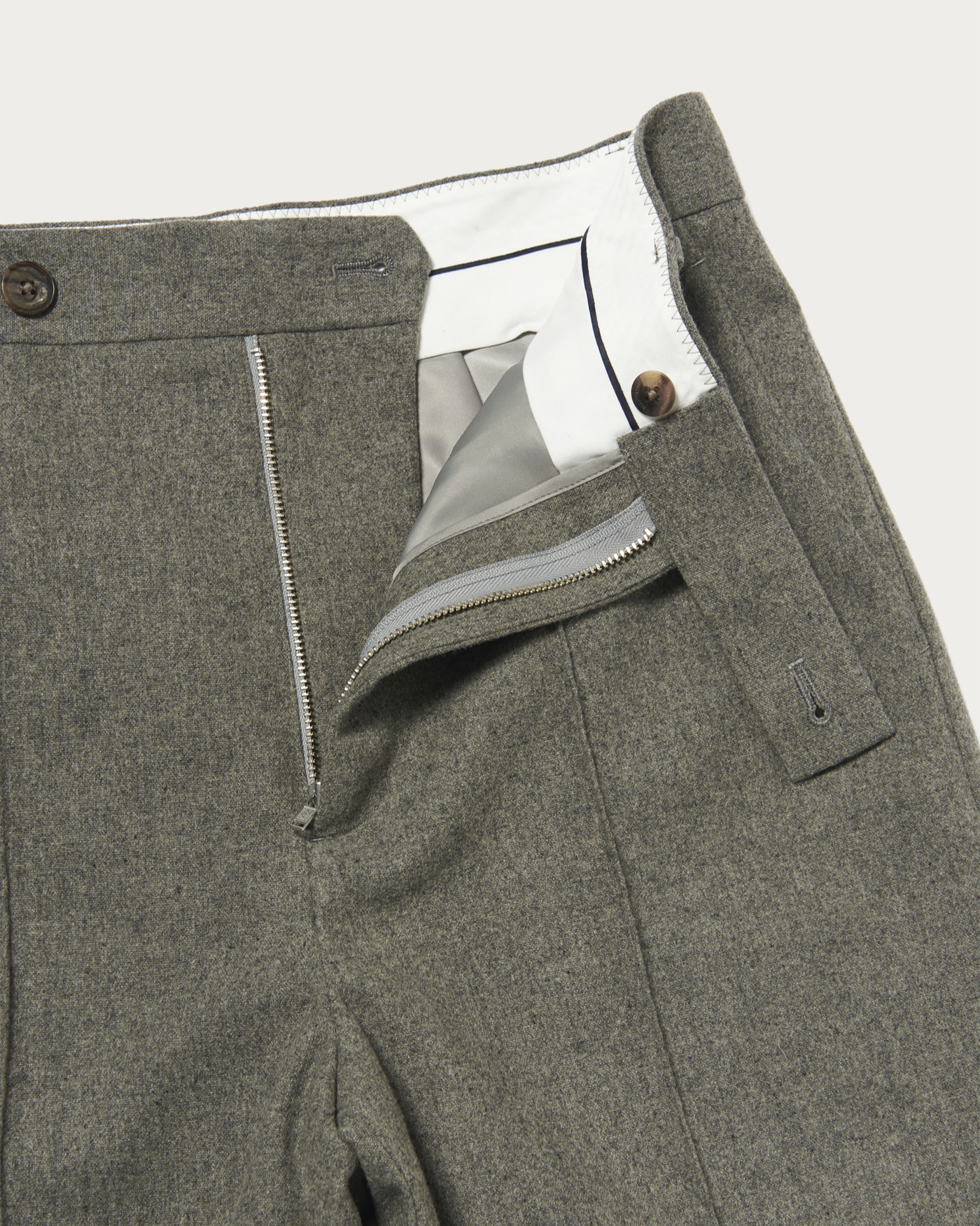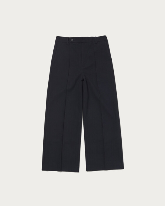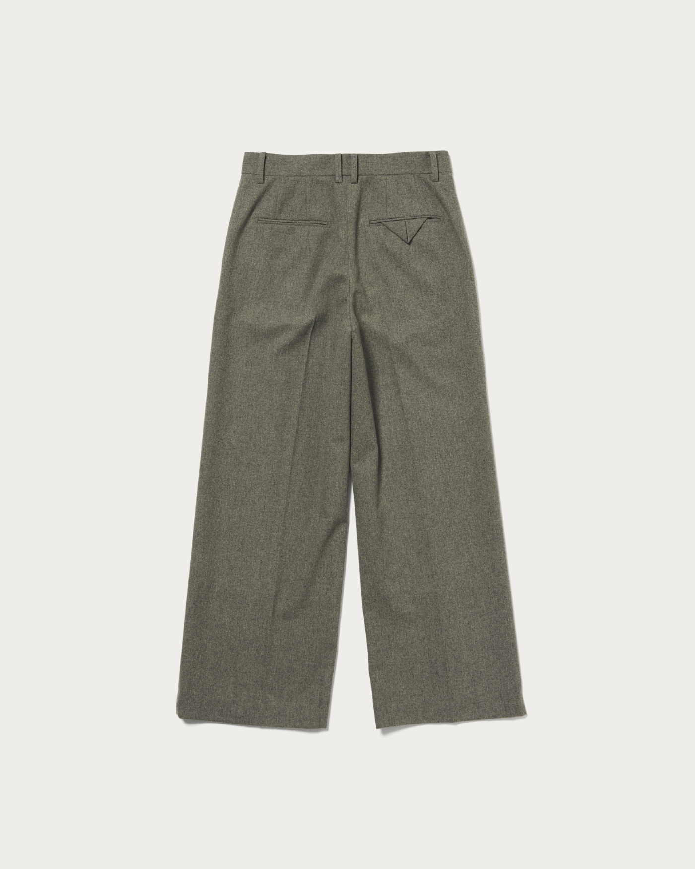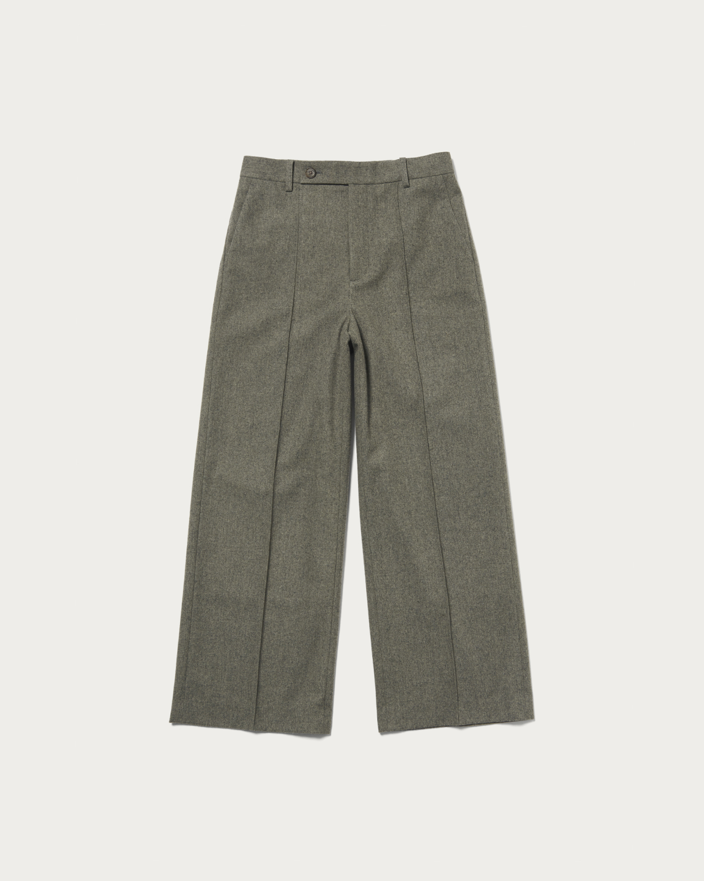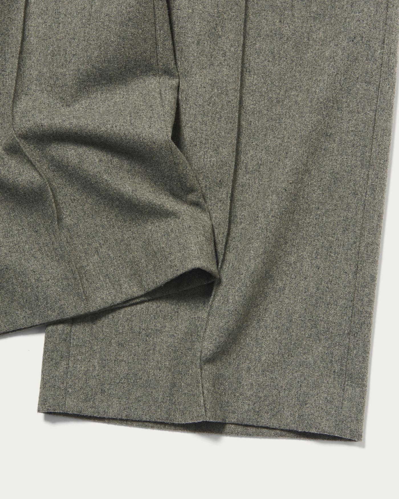 We have prepared simple pants made from wool flannel material for the first time in a while. The design intentionally omits pleats, resulting in a clean, slightly hip-hugging silhouette. The pintuck down the center is a key design feature. These basic pants, which complement any item, are a must-have addition to your wardrobe.