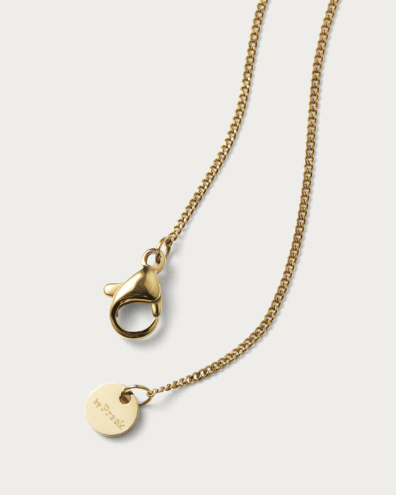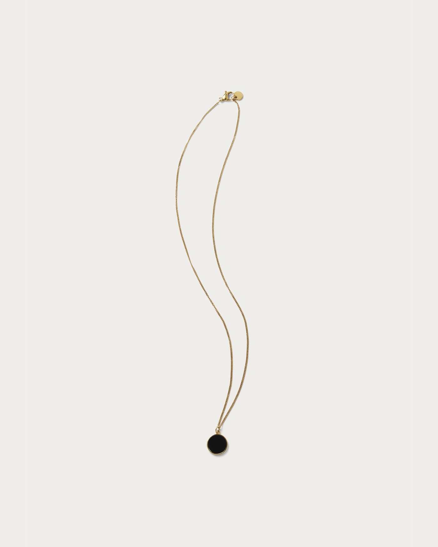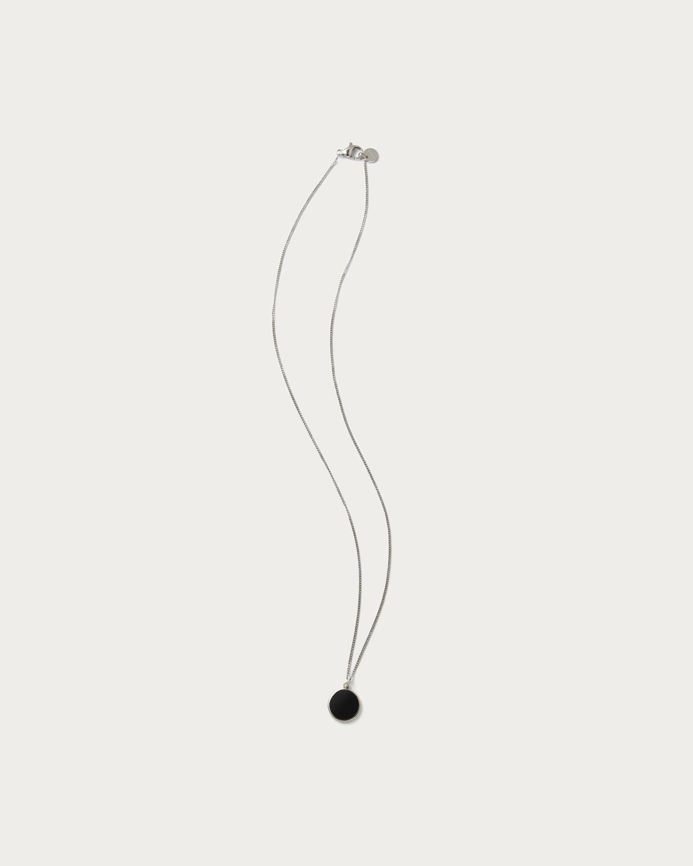 A circle charm necklace made from surgical stainless steel that is resistant to water and sweat, filled with black epoxy. It offers a moderate presence and a sophisticated impression even when worn alone. It pairs well with knitwear and can be worn directly on the skin without being overly sweet, making it easy to match with both official and casual scenes.