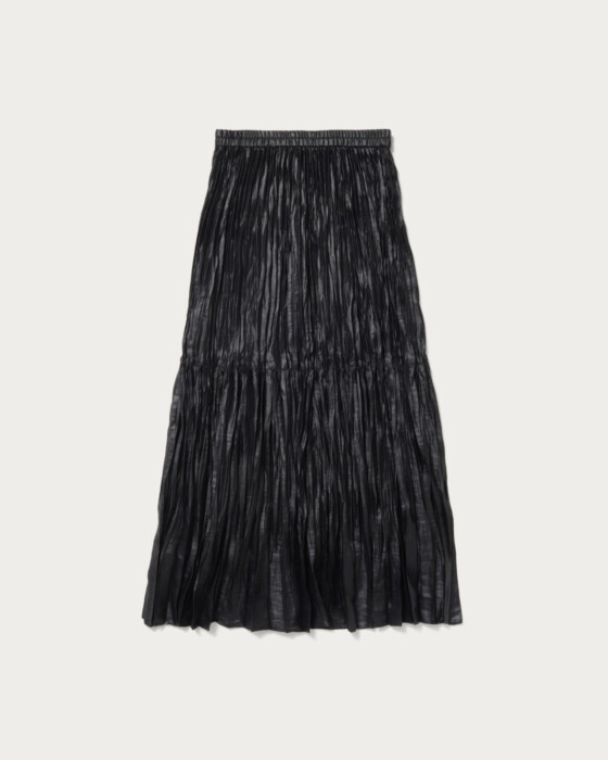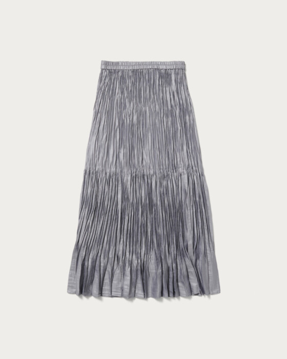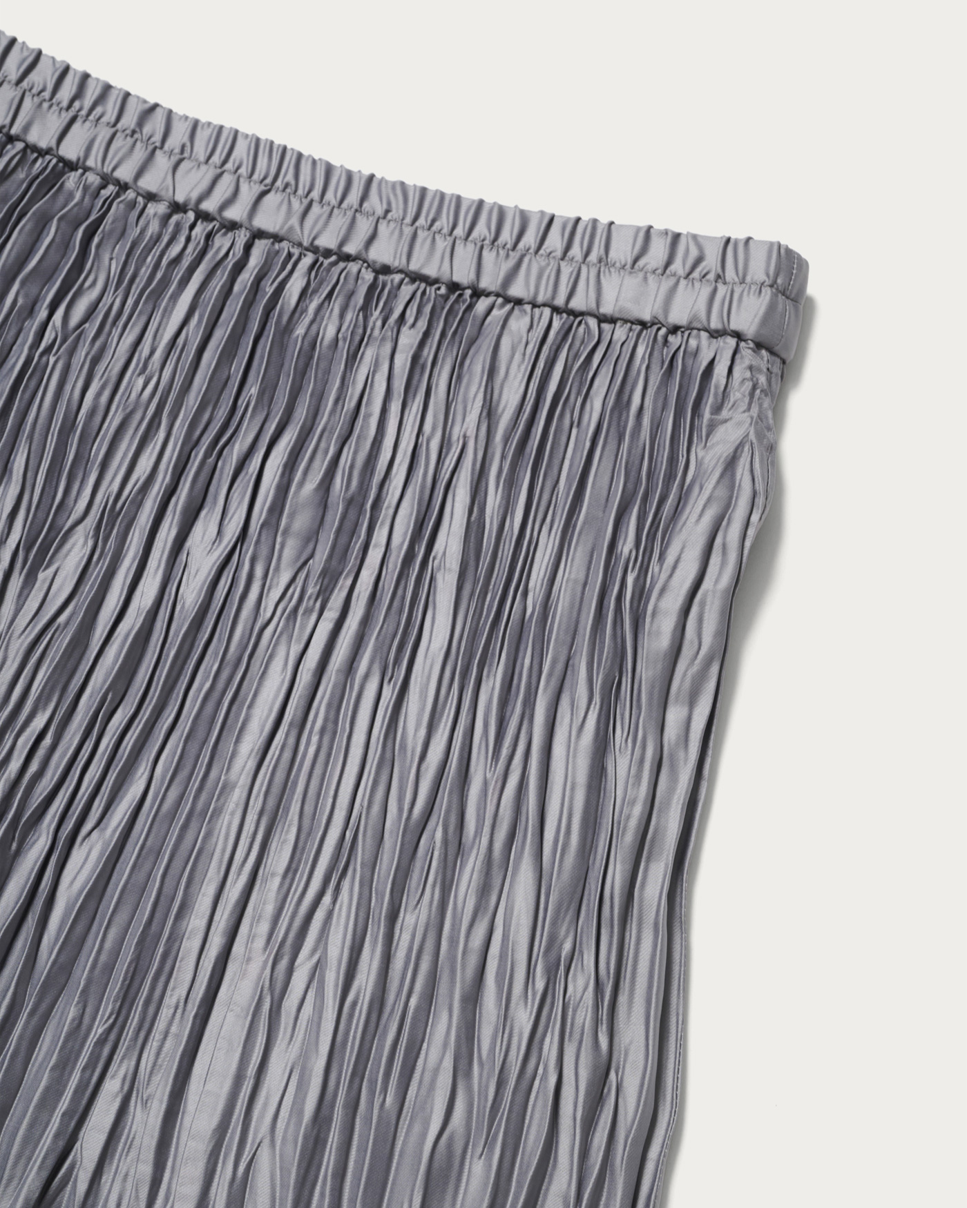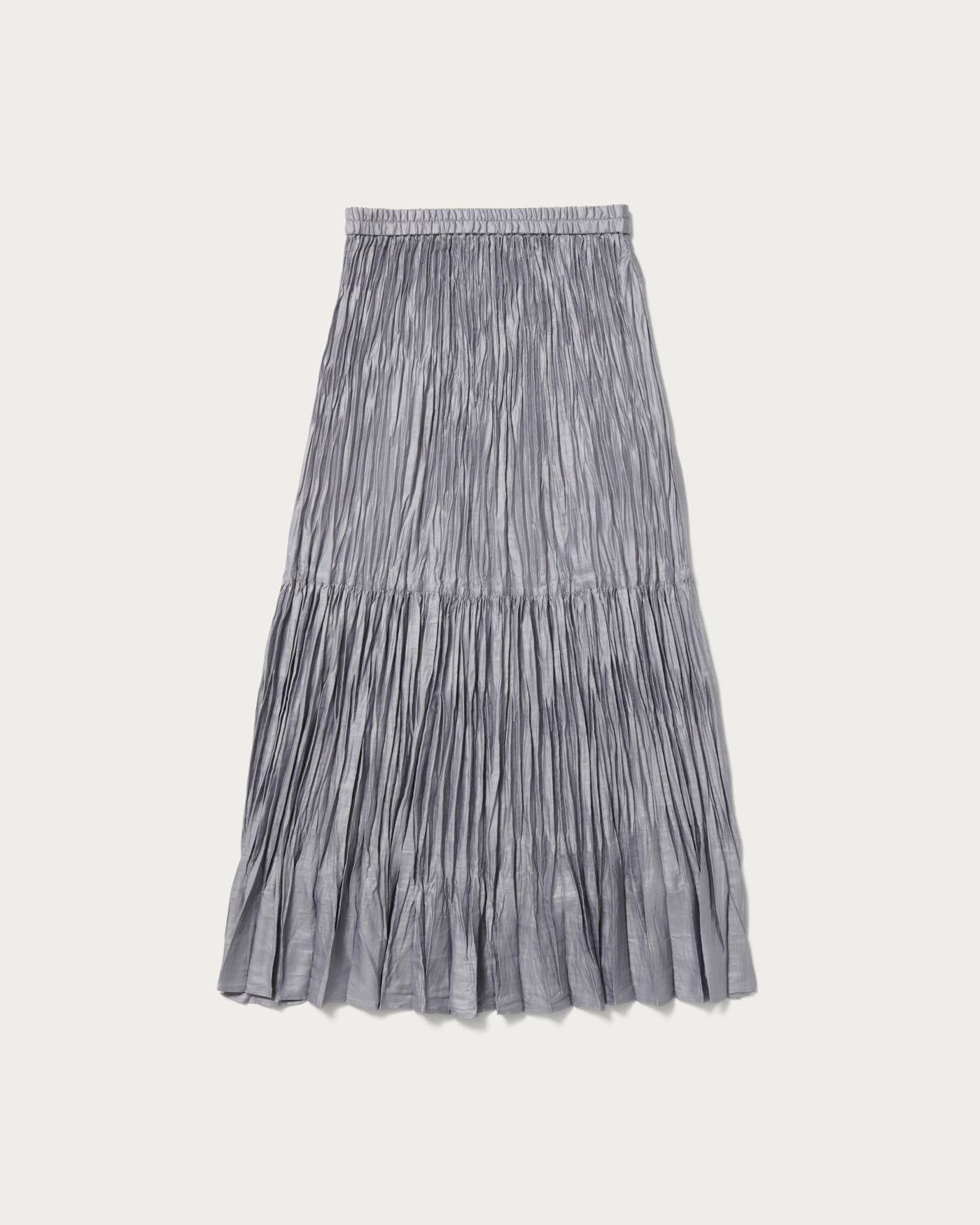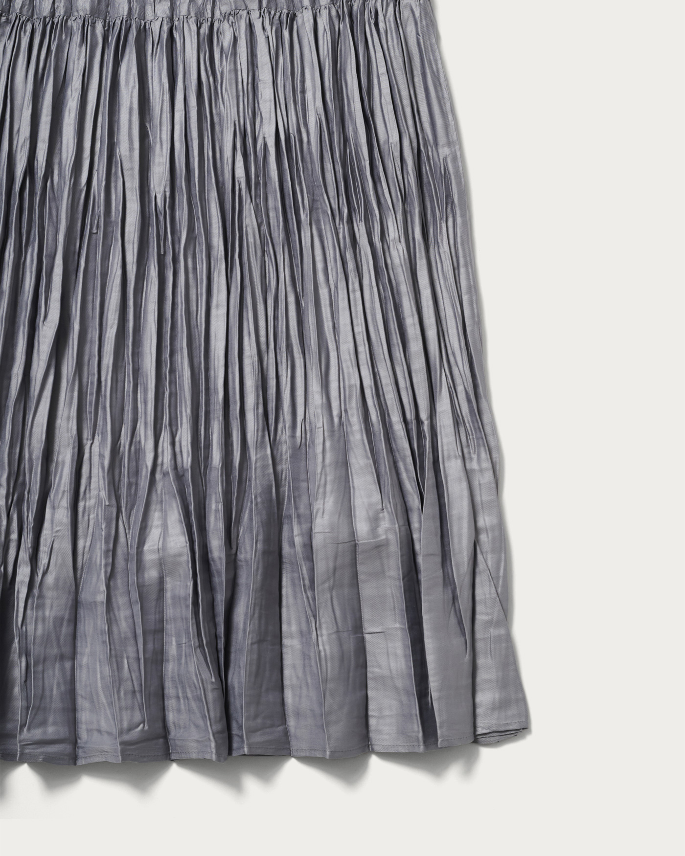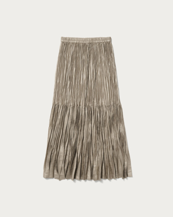 A random pleated skirt made from taffeta material with an impressive elegant sheen. By keeping the hem volume minimal, we've crafted a design that's easy to incorporate into casual outfits. The comfortable elastic waistband is another delightful feature for everyday wear. Enjoy the contrast of materials by pairing it with a wool coat, or match it with boots for a quintessential autumn-winter look. The beige color is a new addition to the lineup.