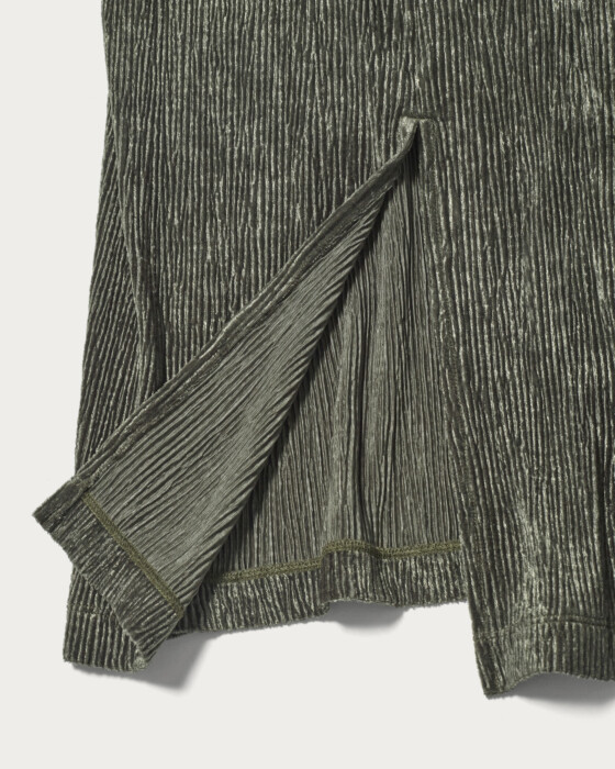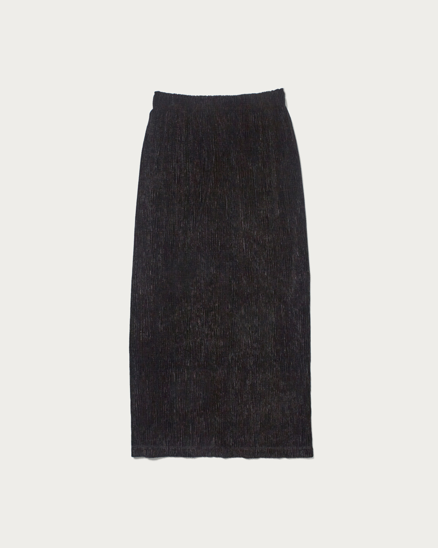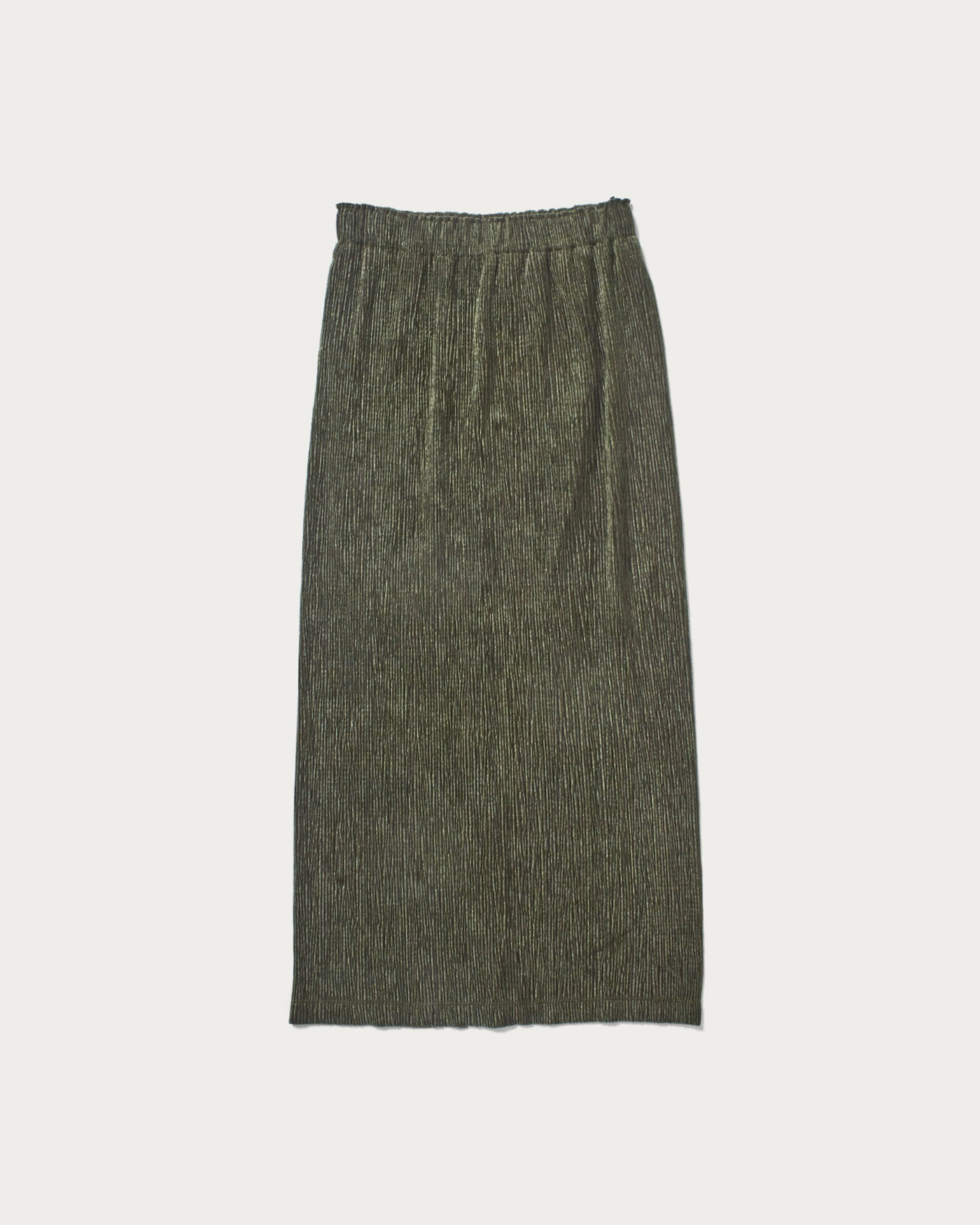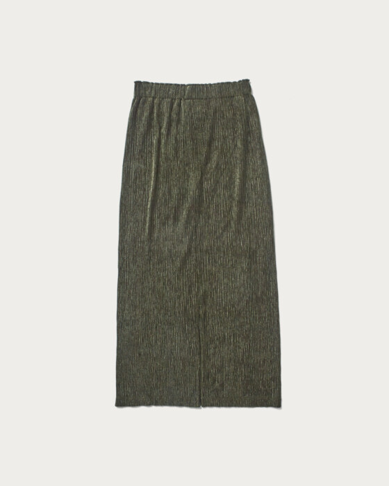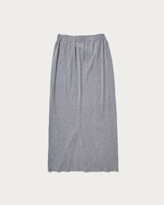 A piece that catches the eye with its delicate pleats and subtly glossy texture. The elastic easy waist design adds a touch of relaxation to its elegance. The deep back slit ensures ease of movement, while the narrow silhouette exudes a sophisticated mood, achieving a stylishly effortless look. Available in four colors: timeless black, light gray, chic dark brown, and cobalt for a pop of accent. This piece is also conveniently hand-washable at home, making it a delightful addition to your daily wardrobe.