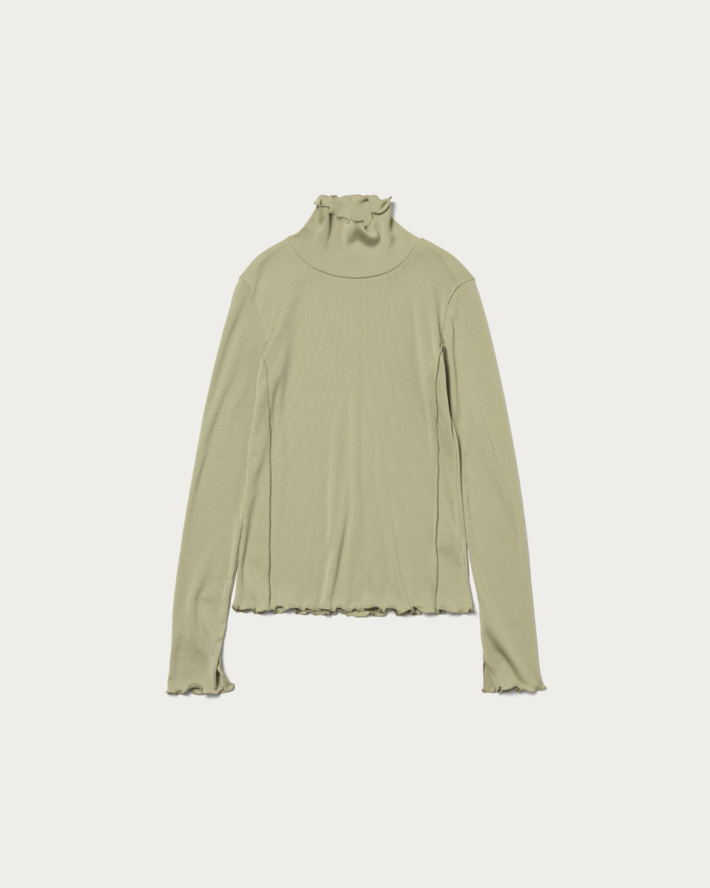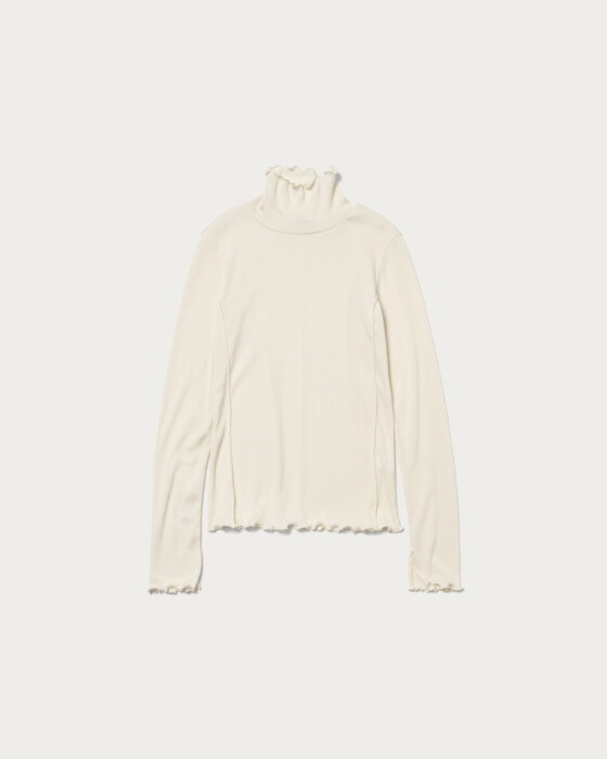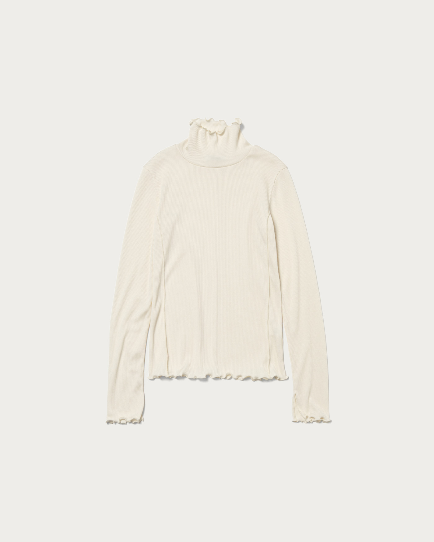 The slim-fit bodice is finished with tonal merrow stitching for a sophisticated look. The turtleneck and slightly longer sleeves make it a standout inner layer for fall and winter. The material is a bright plating ribbed knit with an elegant sheen, moderate thickness, and a smooth texture. It pairs perfectly with feminine outfits like dresses and jackets, as well as casual items like sweatshirts. This versatile piece works well in any setting or style, so consider getting it in multiple colors.