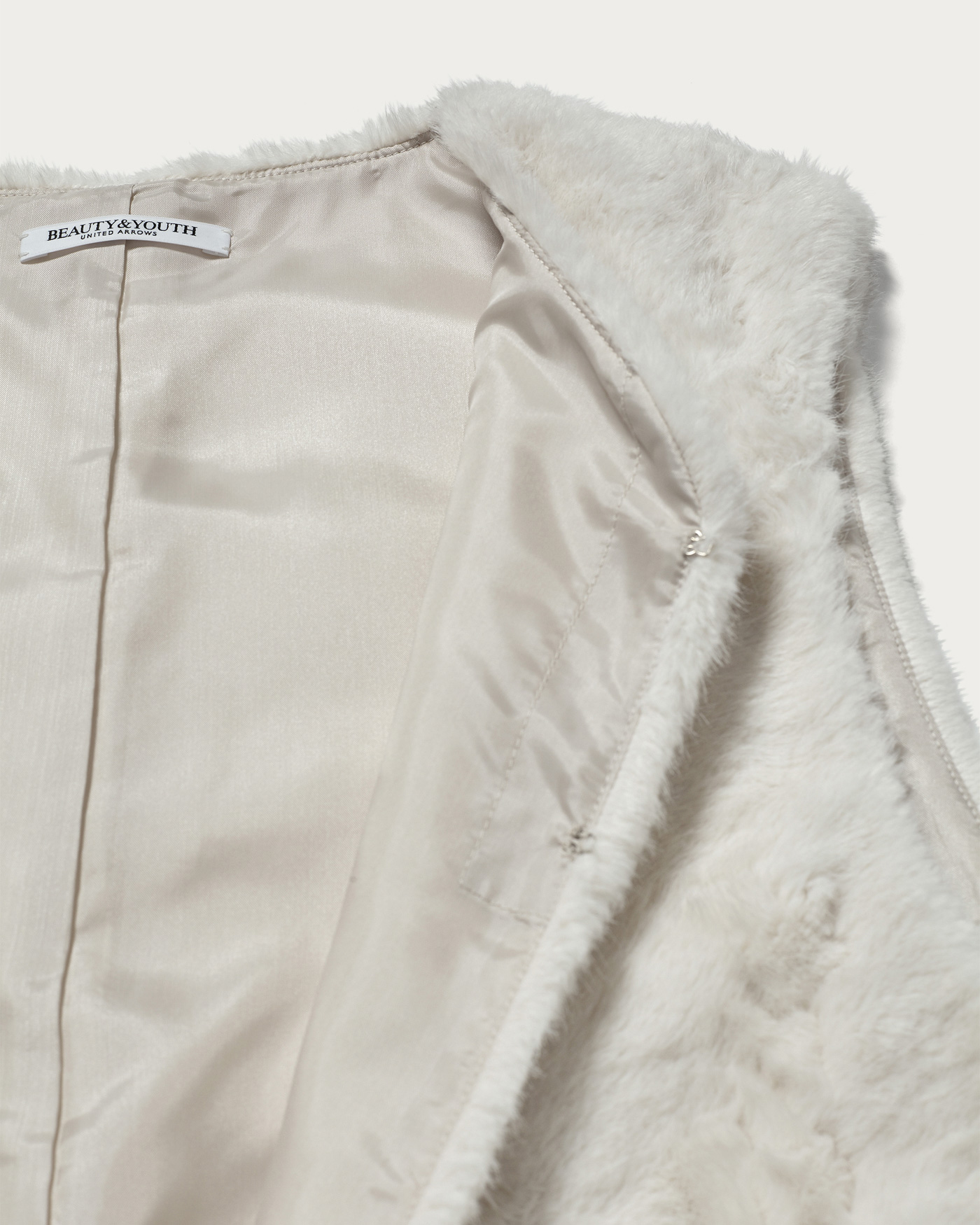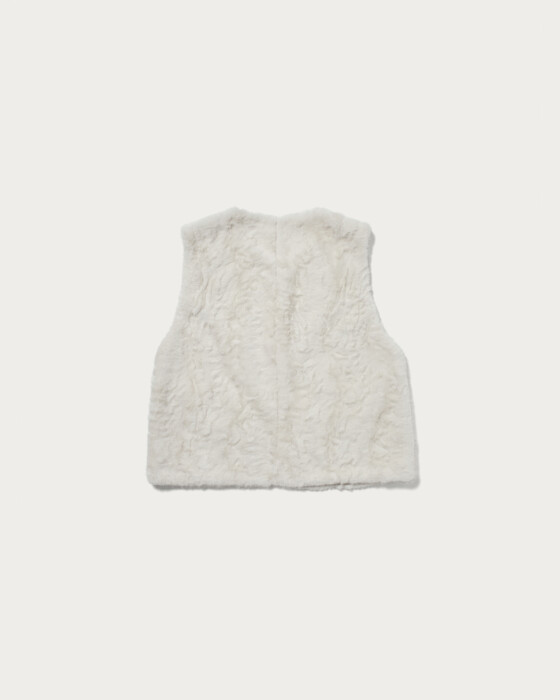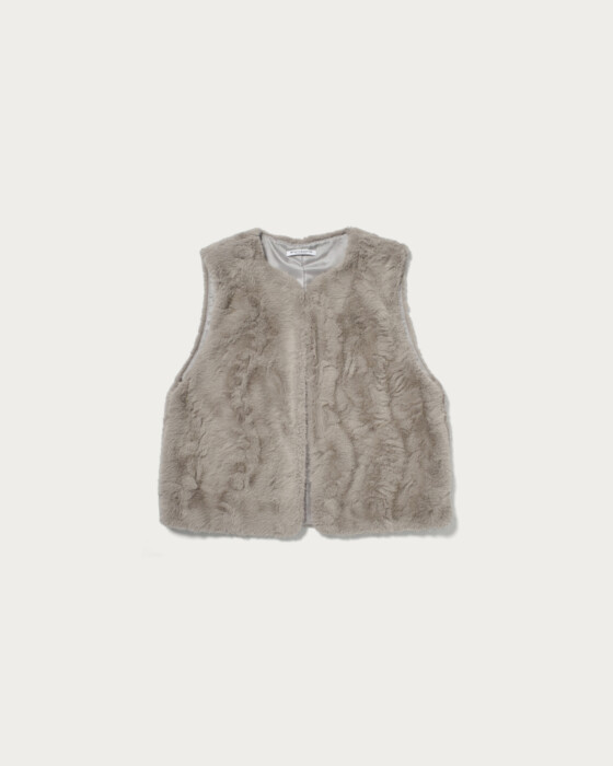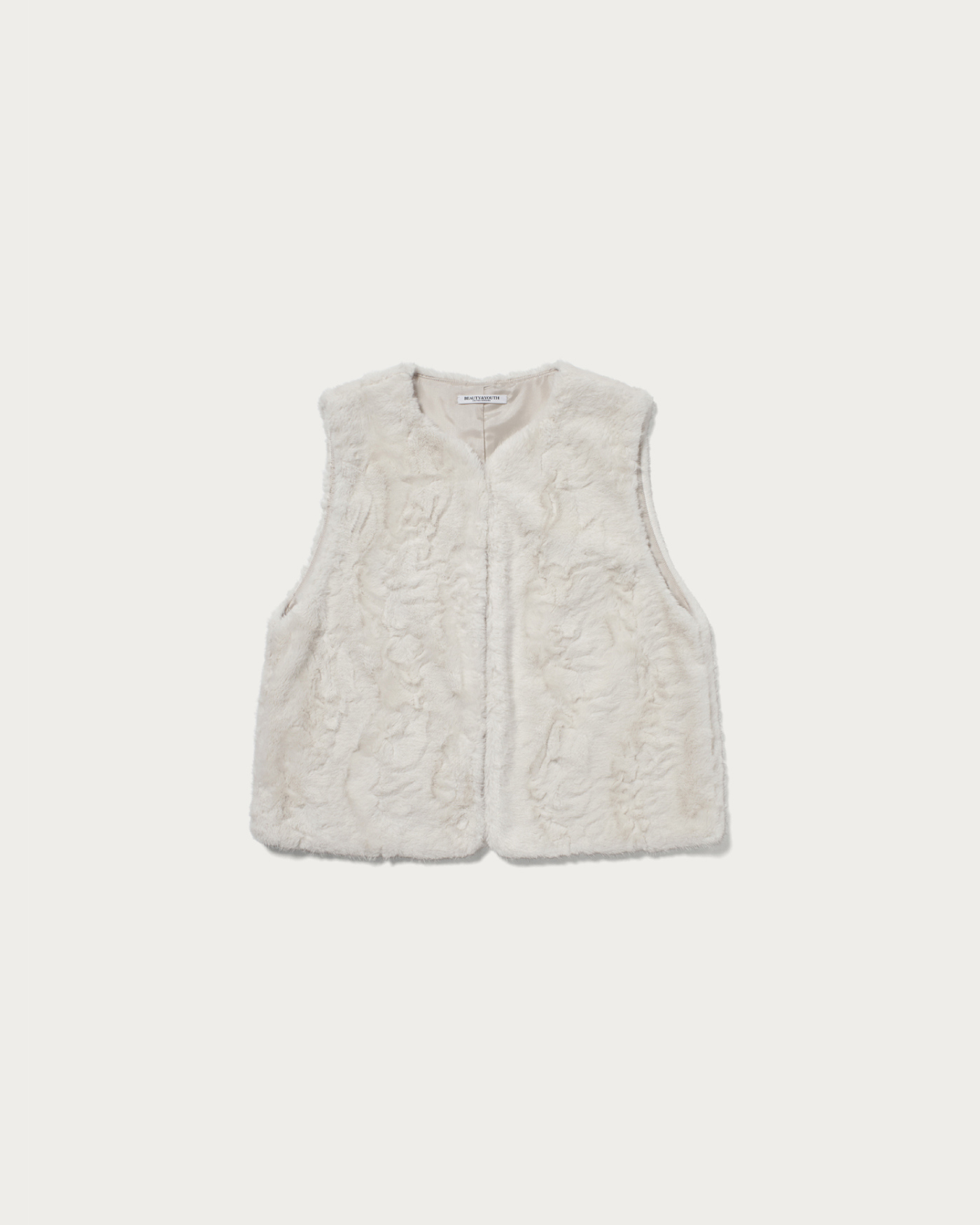 The faux fur vest, which was well-received last season for enhancing the seasonal mood with its fluffy texture, is back. This time, we've used a polyester material with a slightly wavy pattern, and the design features a simple, relaxed silhouette that can be easily draped over your outfit. We recommend a casual styling by layering it over an oversized football T-shirt.