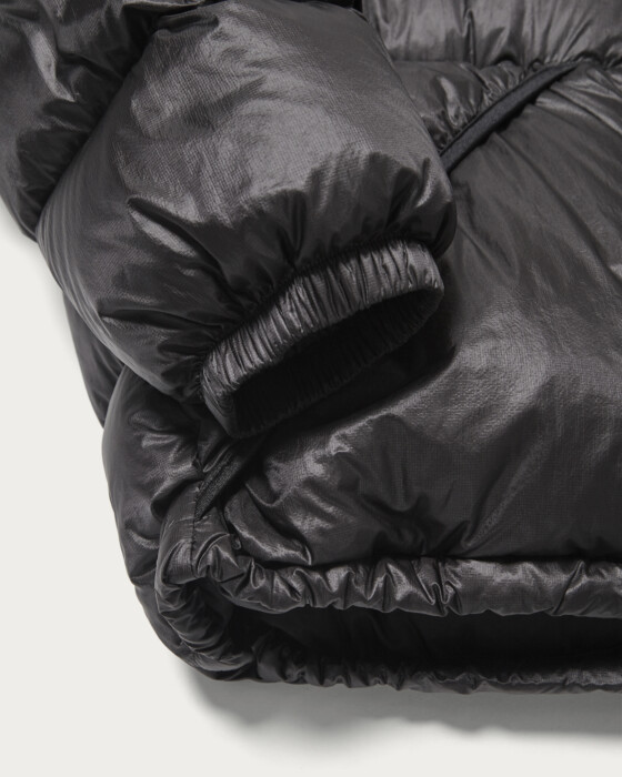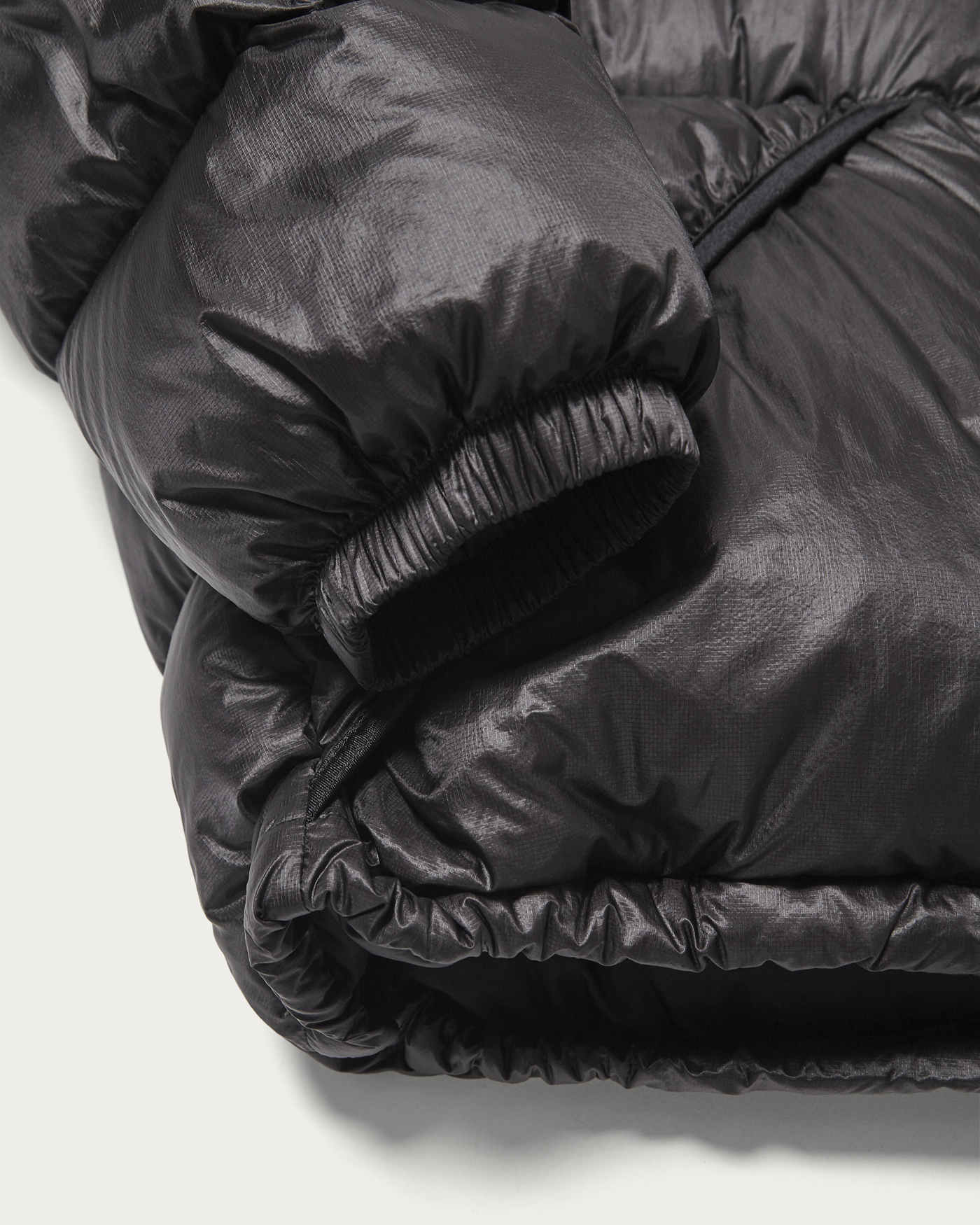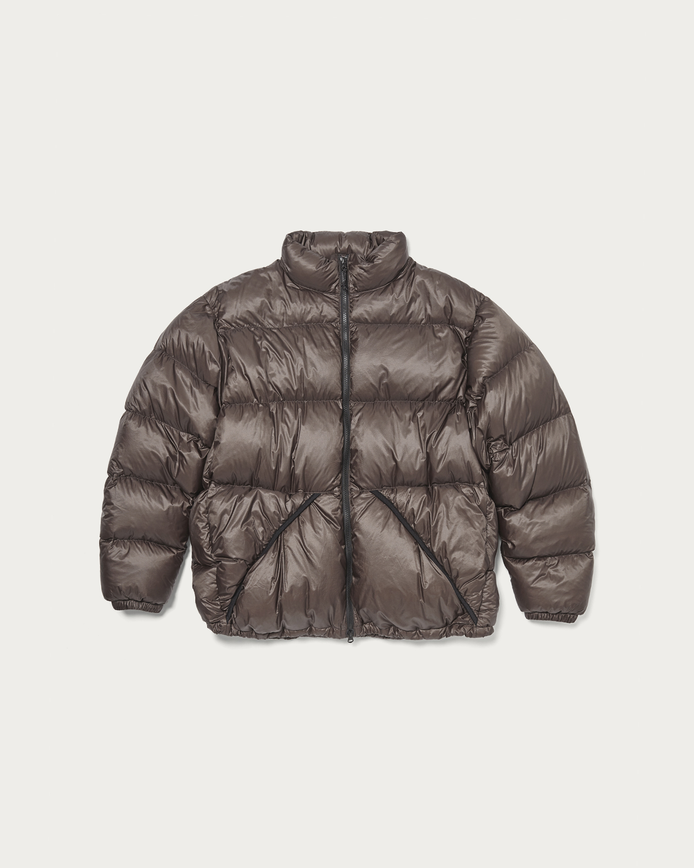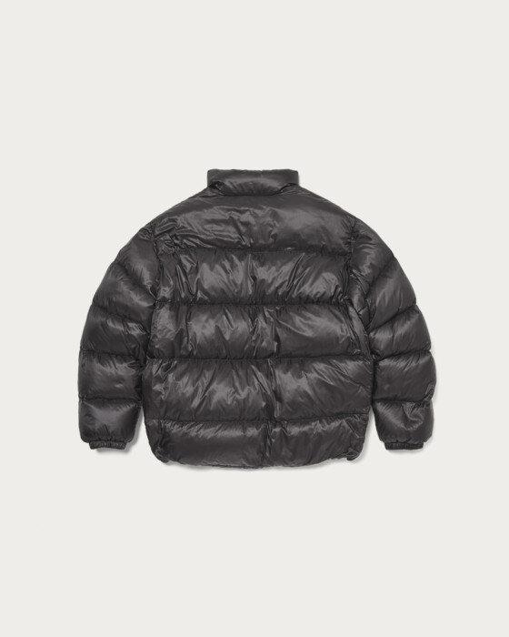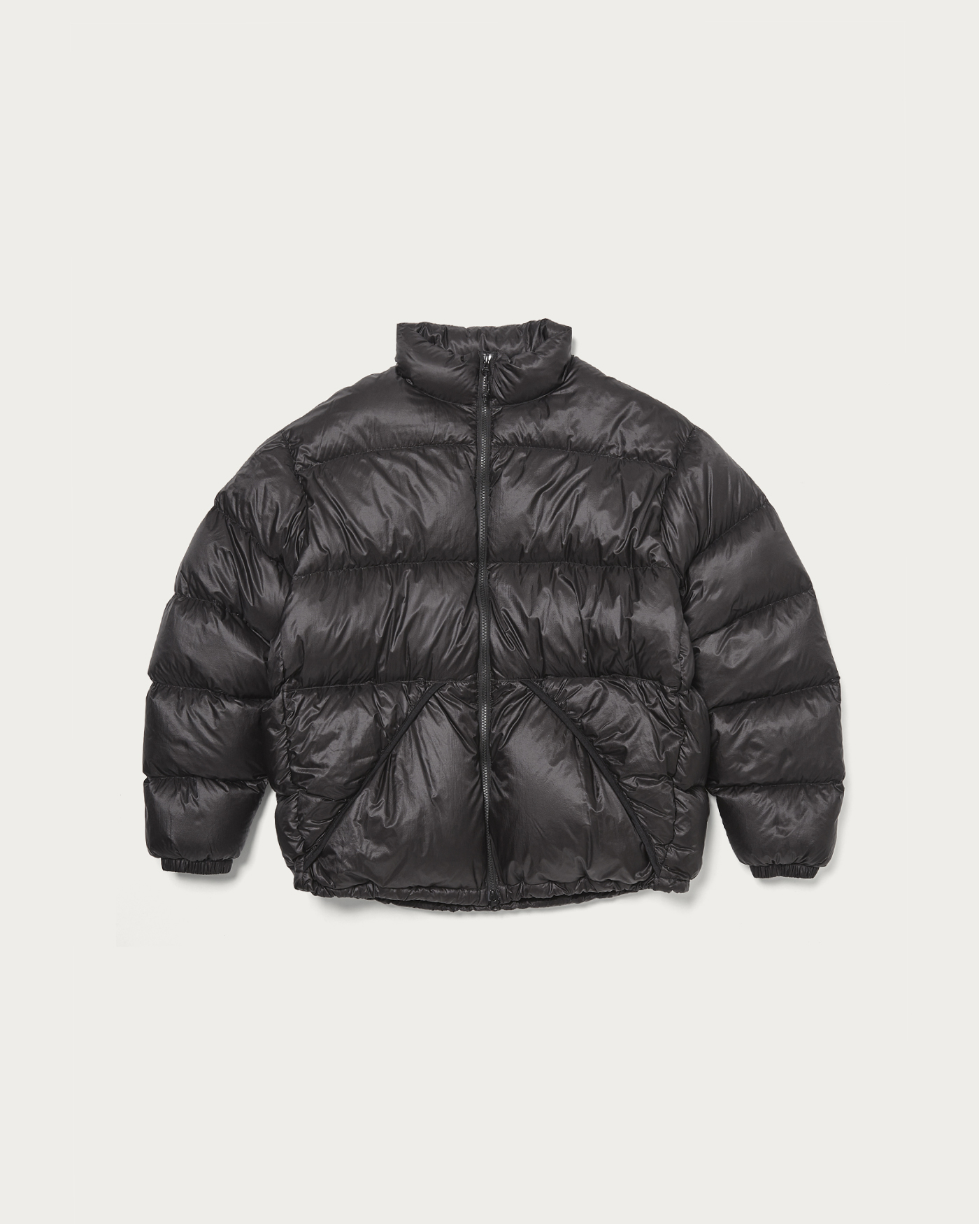 A high-density woven 10-denier ultra-fine recycled nylon ripstop. It features the supple and soft texture characteristic of nylon. The filling uses recycled down from Allied. This down jacket has a moderately relaxed oversized silhouette. It is designed with sizing that makes layering easy, allowing you to coordinate without worrying about inner items. This is a unisex item that can be worn by anyone.