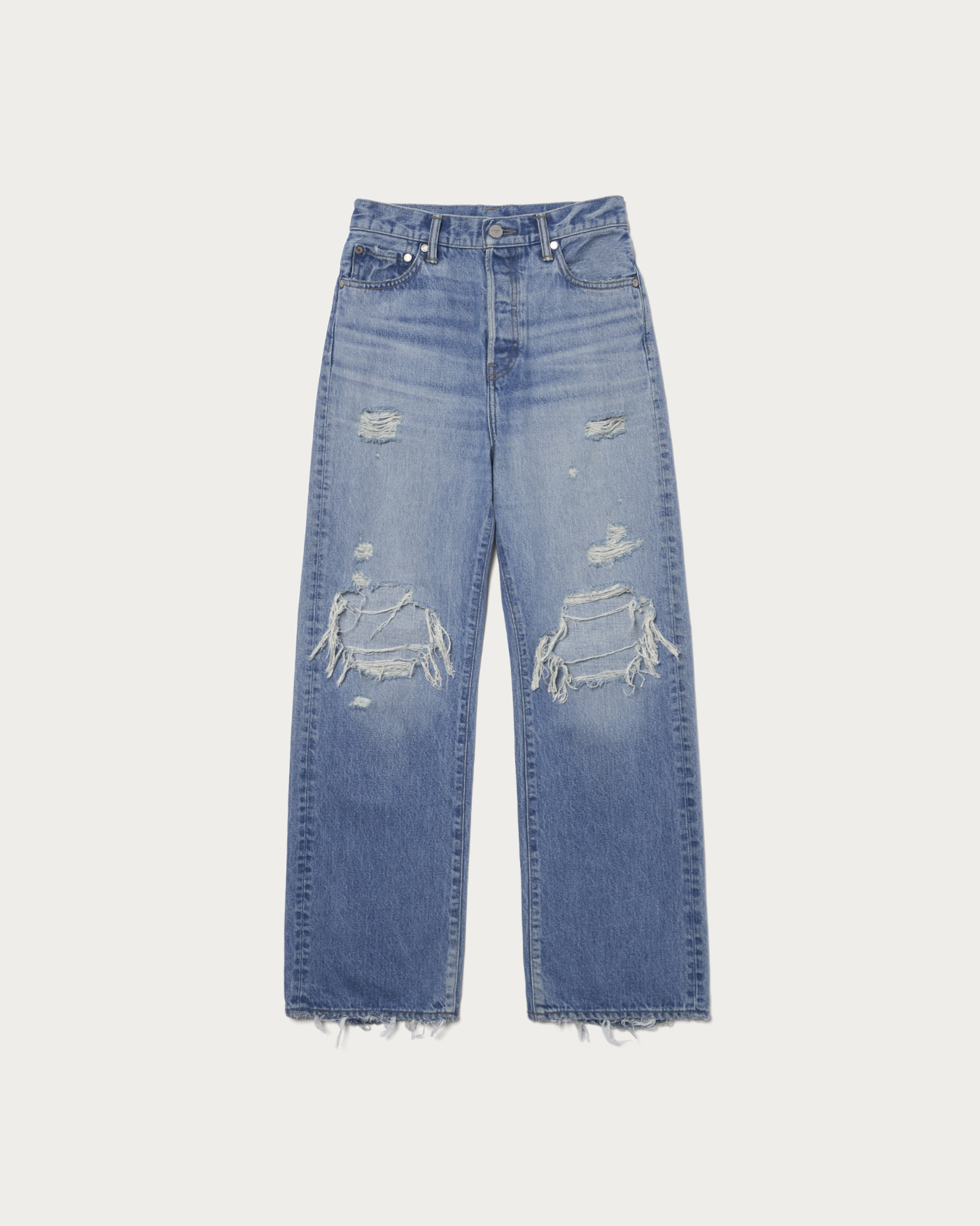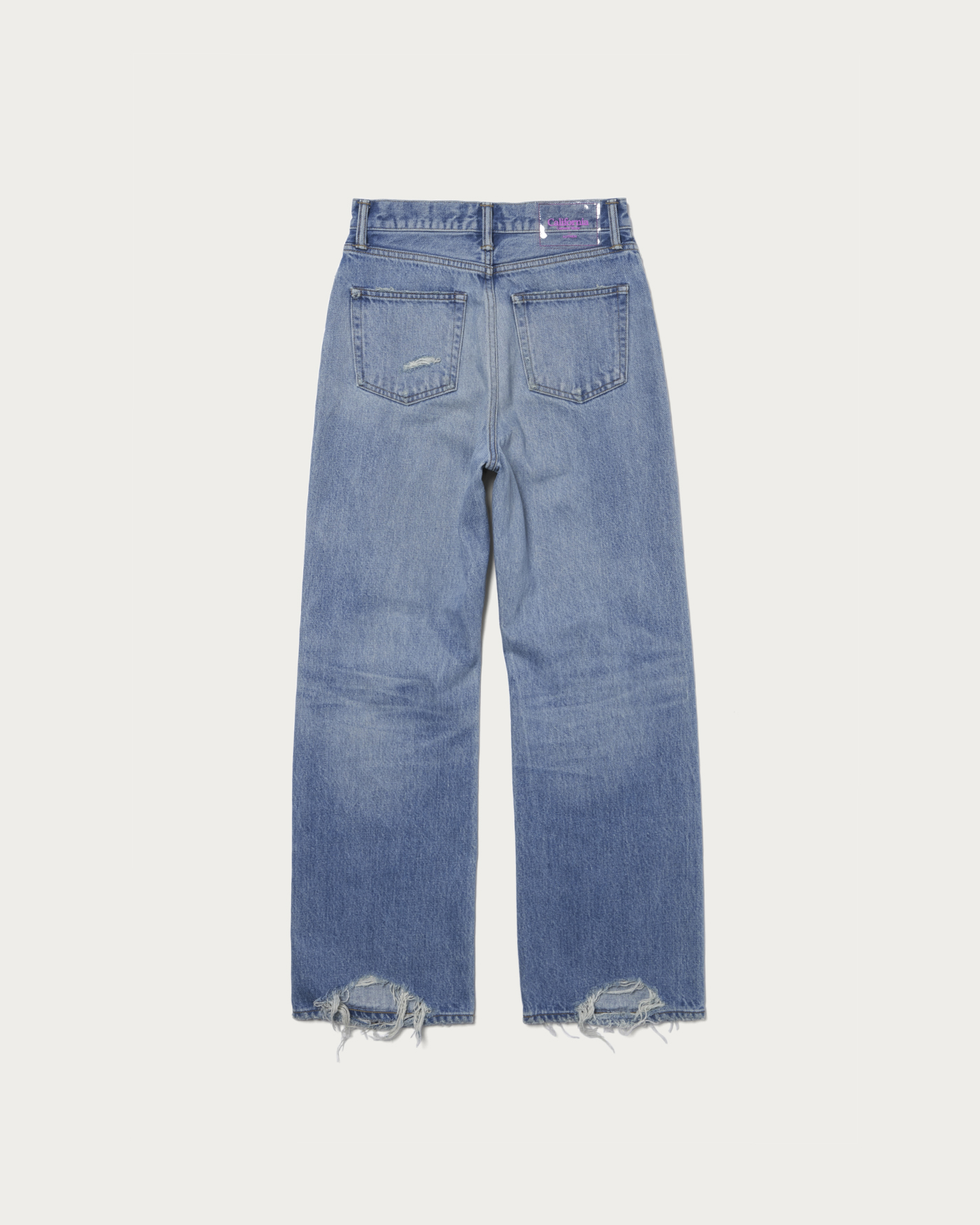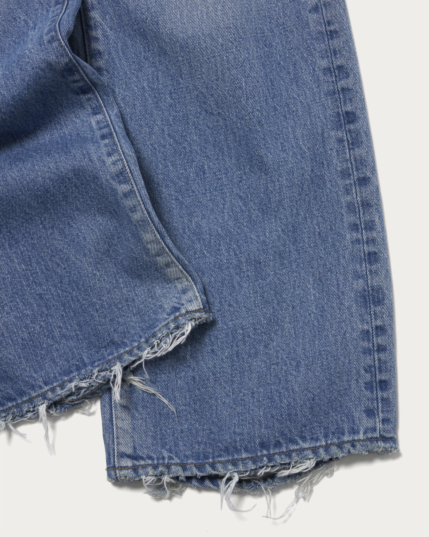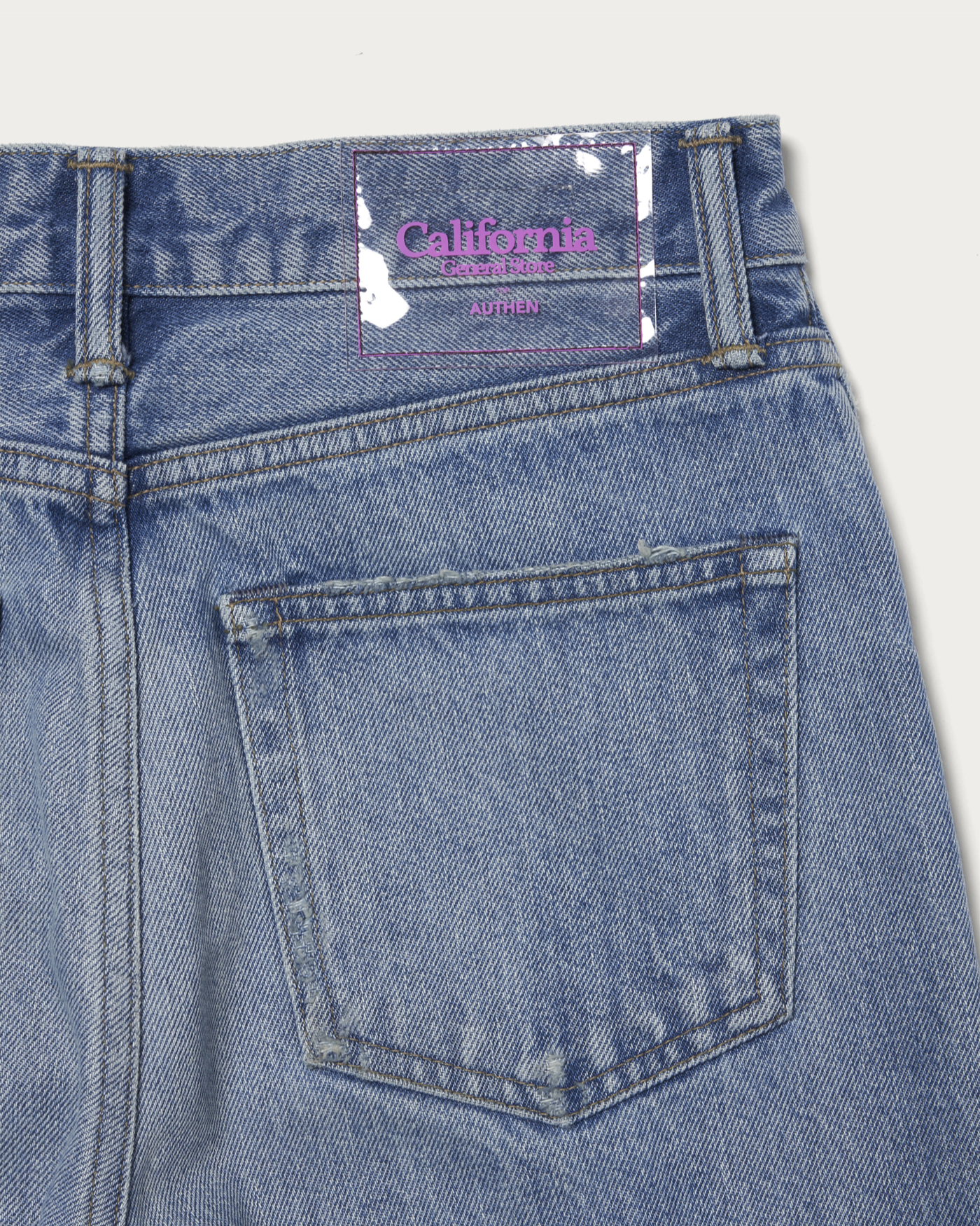 Here's the English translation of the provided Japanese text:"While being high-rise, the design does not tightly cinch the waist, allowing it to settle slightly below the natural waistline for a relaxed mood balance. The flare below the knee is set to a subtle, exquisite flare, emphasizing a more natural fit. The material used is 13oz recycled denim made from recycled yarn by Kurabo Co., Ltd. This high-quality upcycled denim is entirely managed in Japan, from spinning to weaving. It expresses a realistic used look like vintage clothing, making it a versatile piece for styling. The signature patch features a CGS exclusive patch with pink print on a transparent vinyl material."
