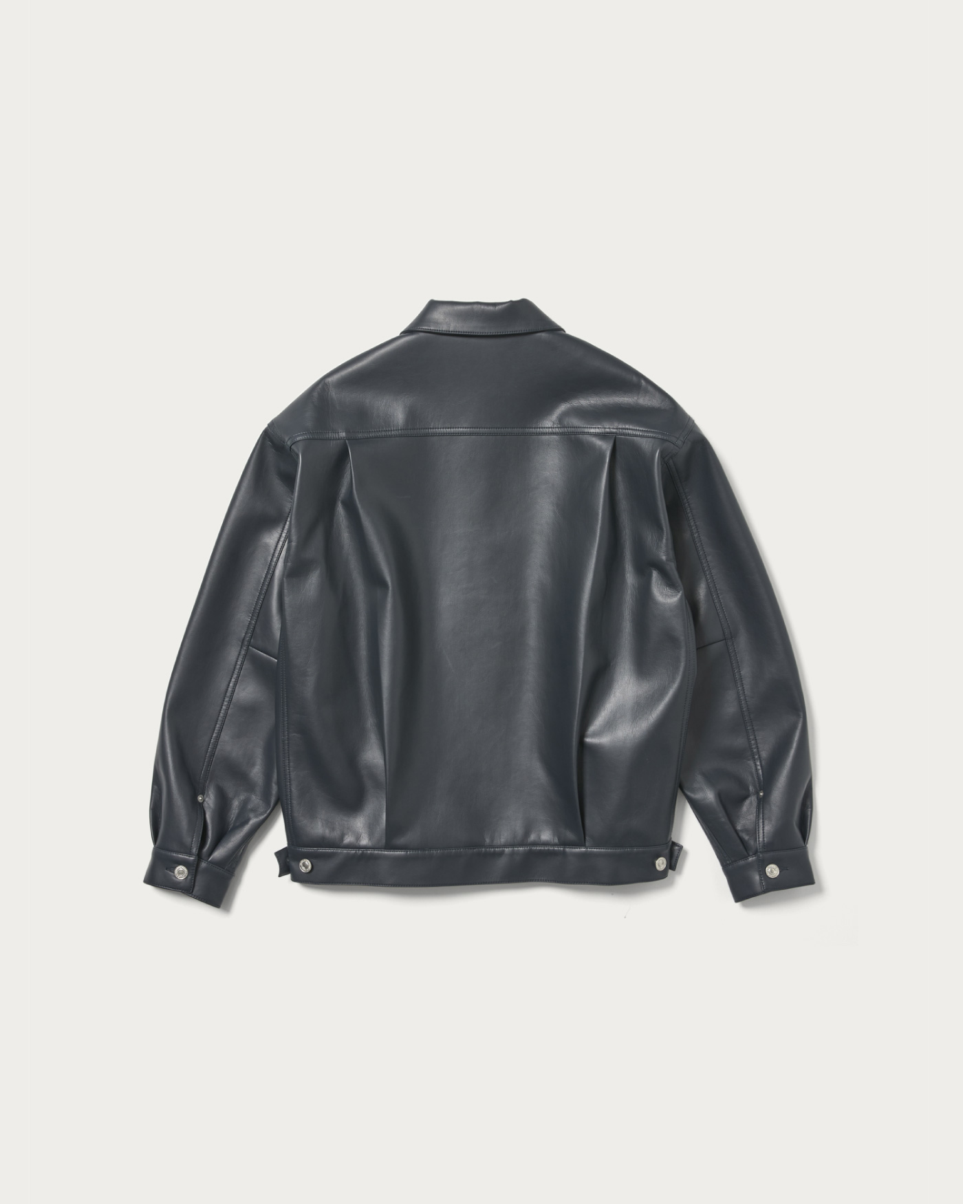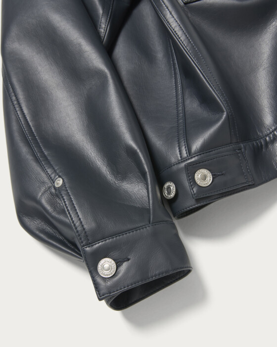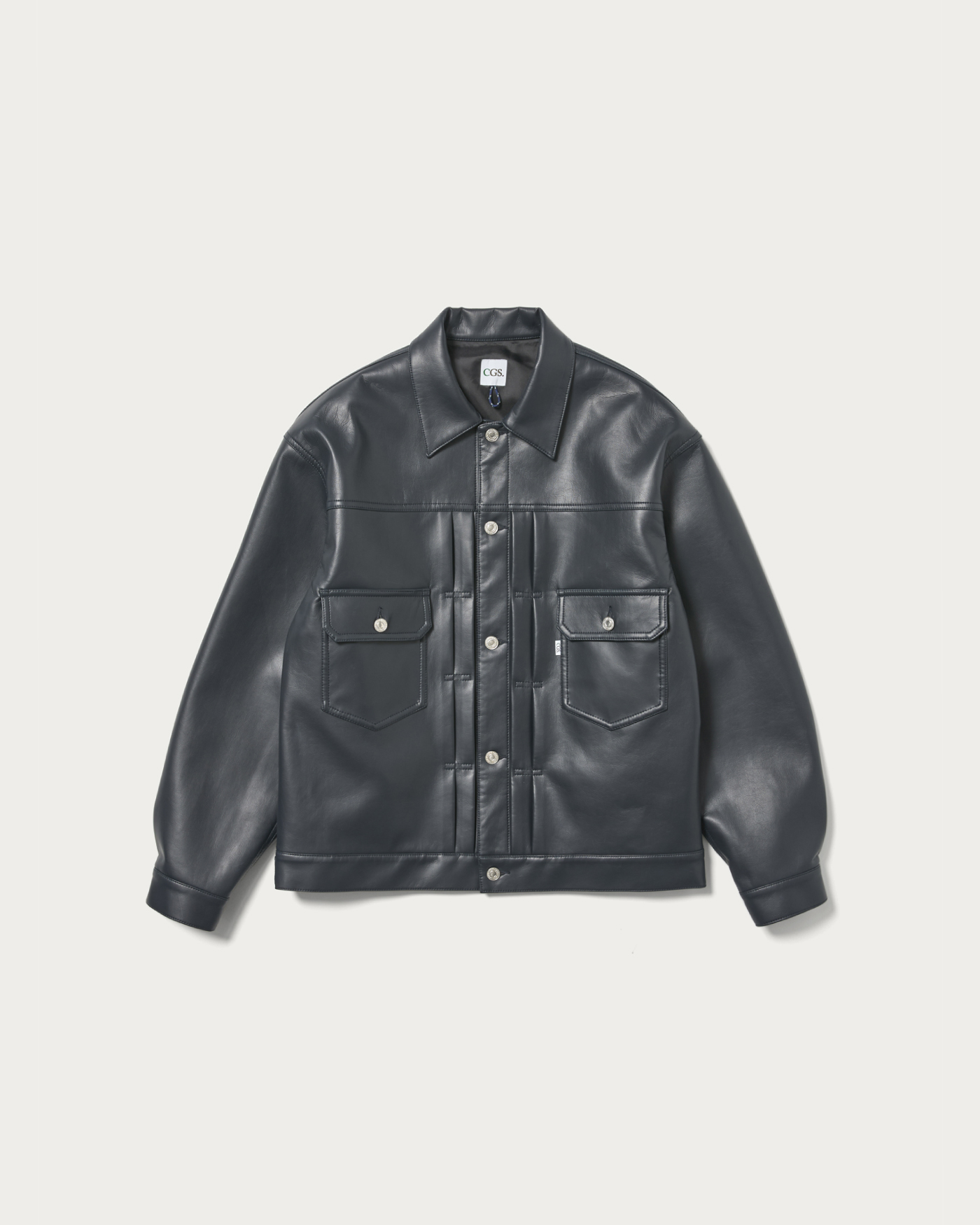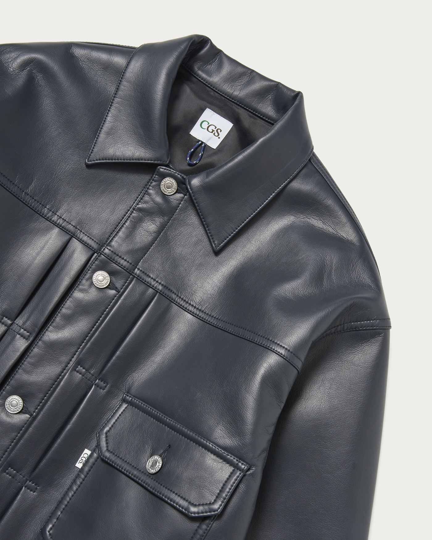 〈CGS.〉 has released a classic denim jacket made from leather-like material. The material is a custom order of synthetic leather produced by Italy's LEATHERTEX company in China. It features a smooth and elegant texture, with a key highlight being its exquisite navy color. The jacket is designed with an oversized silhouette and is fully lined. It is unisex, offering a unique presence and adding a special ambiance to your outfit.