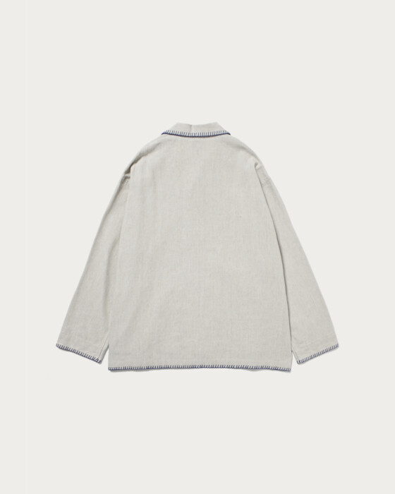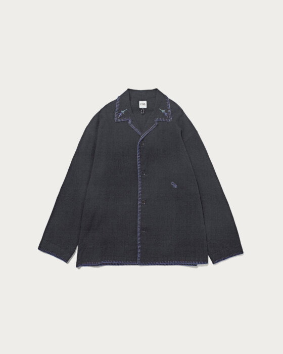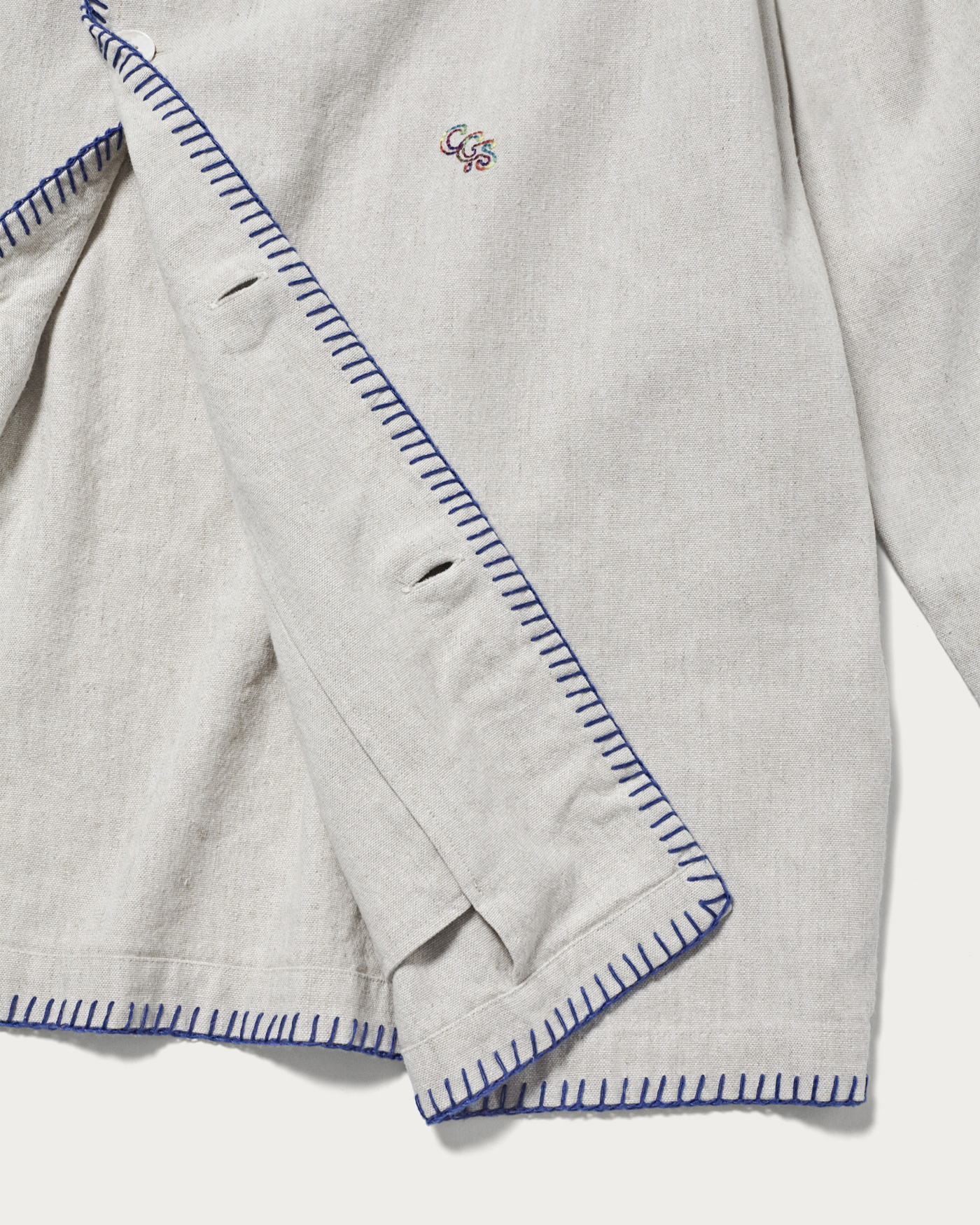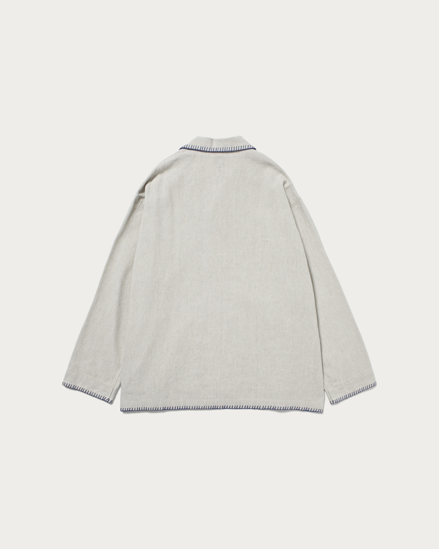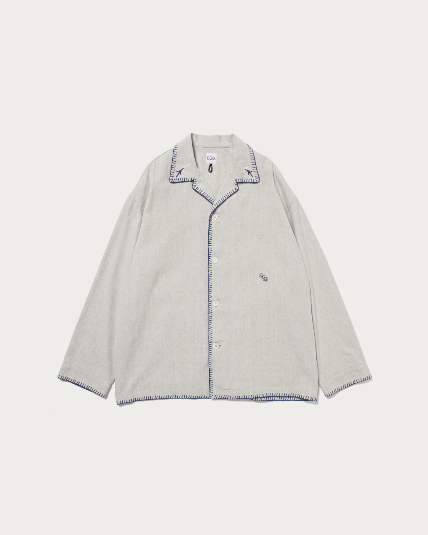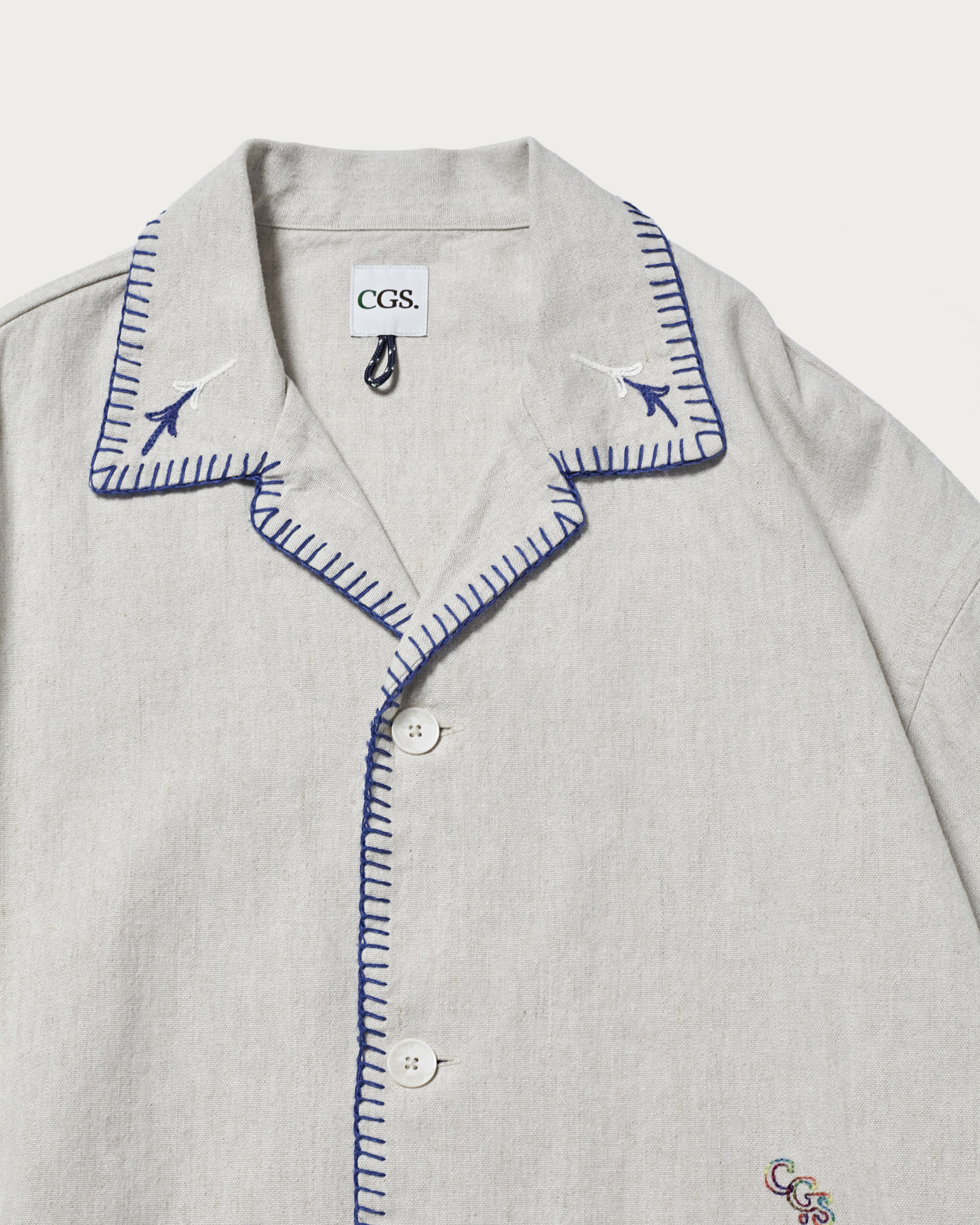 An open-collar shirt made from a slightly thick linen and cotton blend plain weave fabric. It features a silhouette that perfectly balances fashion and relaxation with a comfortable fit. The addition of embroidery gives it a playful touch, making it a unique piece. Designed to be unisex, it exudes a distinctive presence and adds a special flair to any outfit.