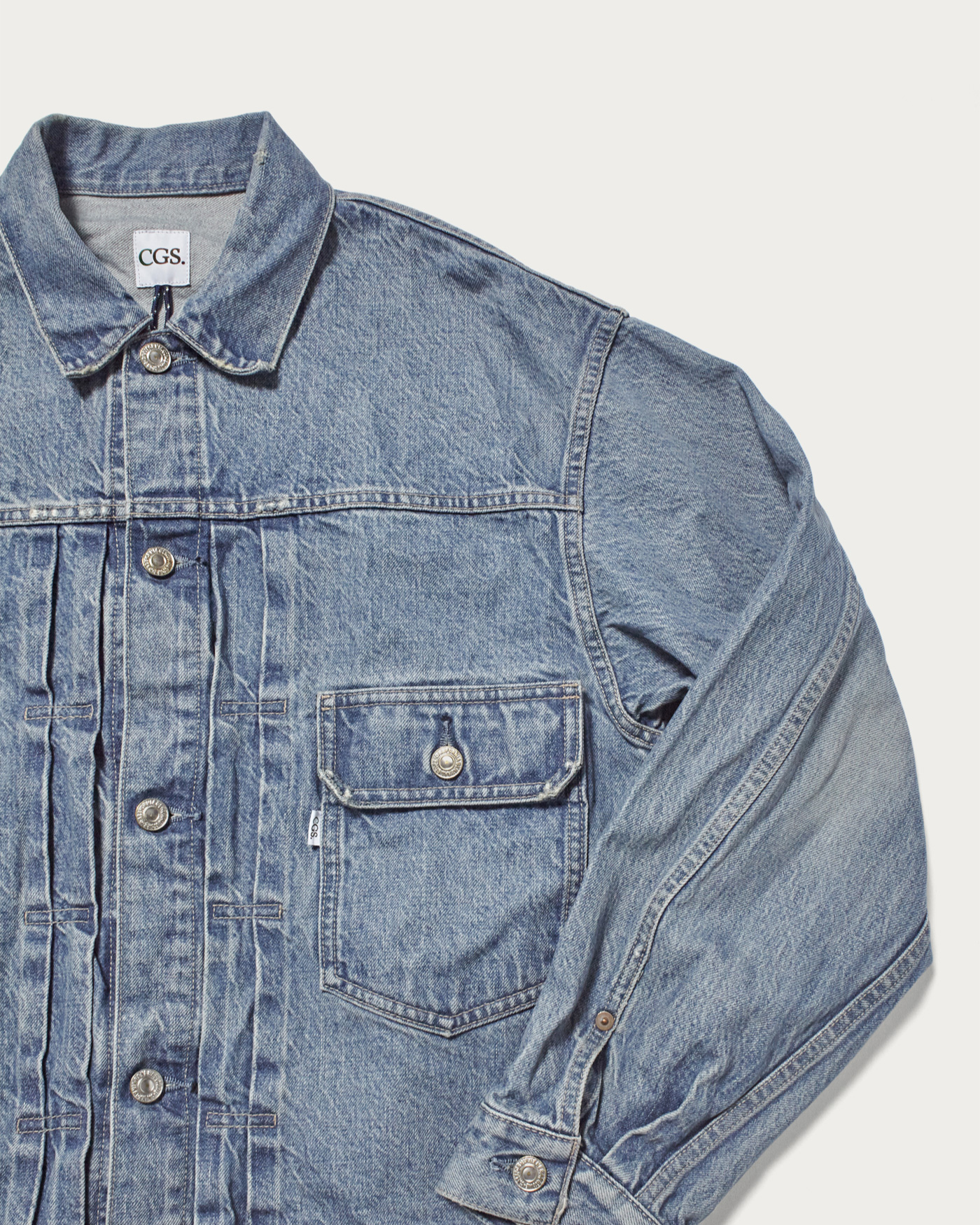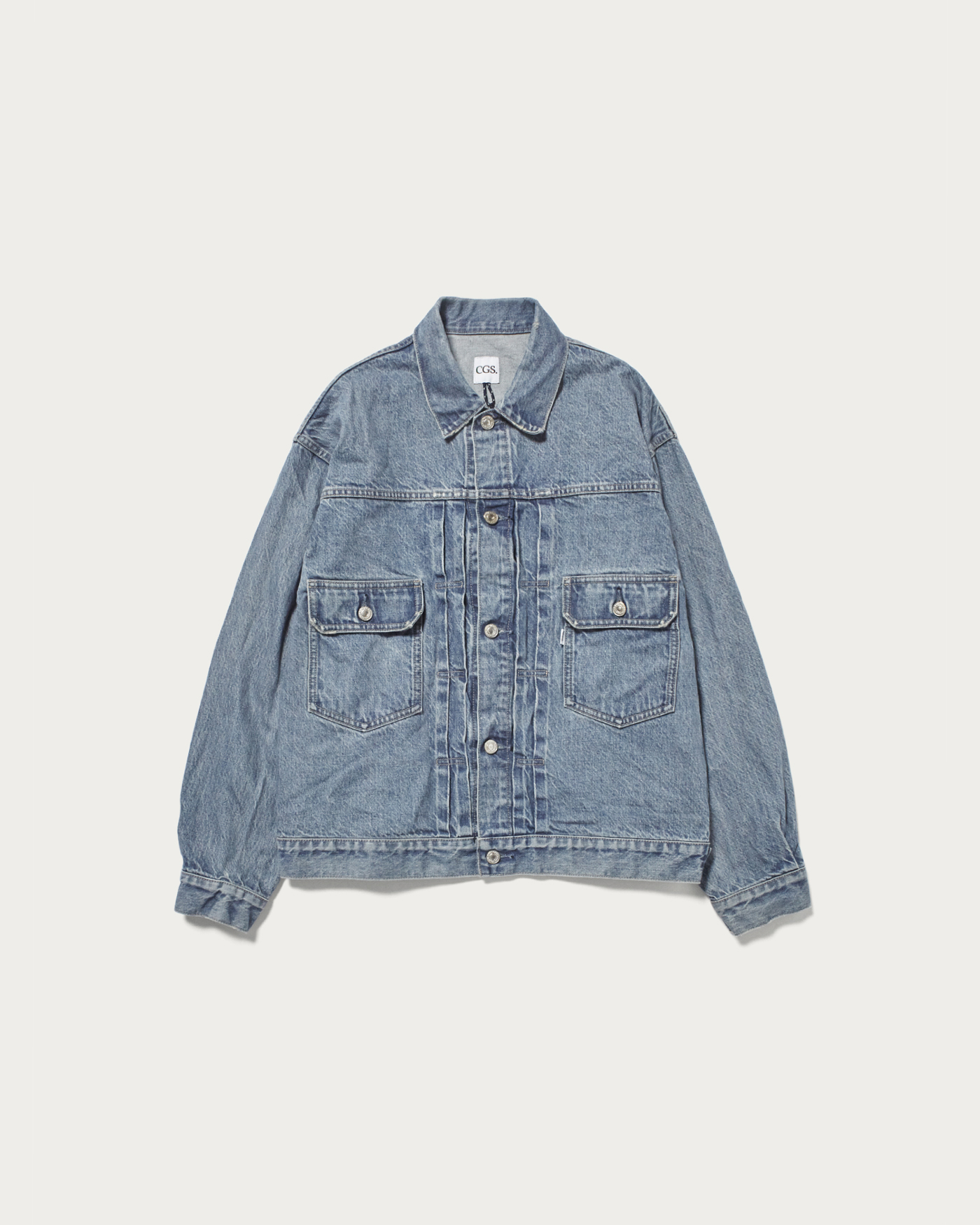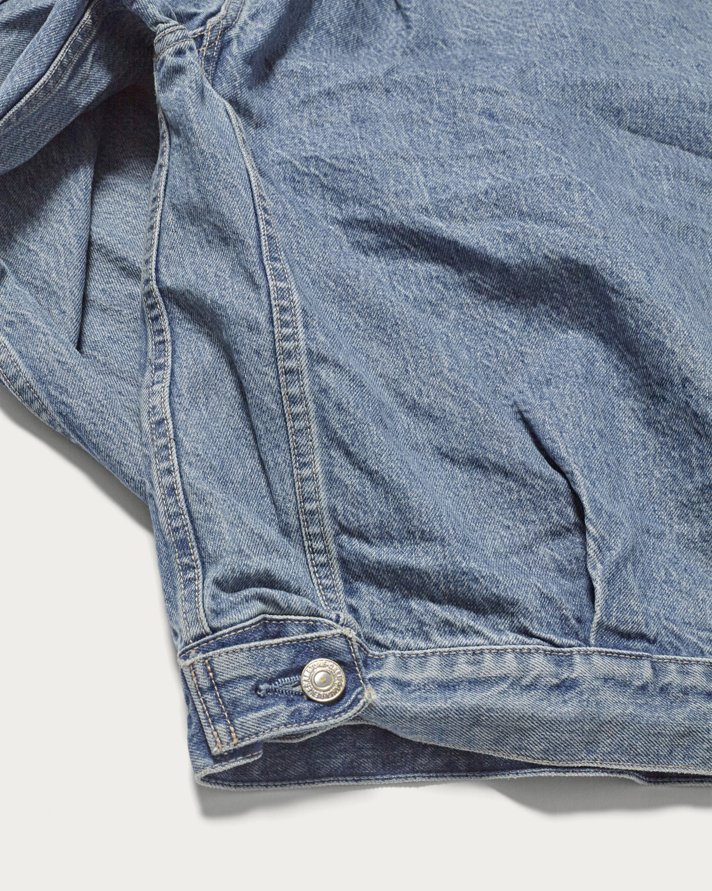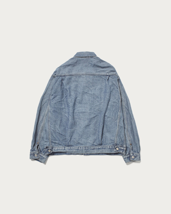 Denim jacket made from 13oz Kaihara denim using organic cotton. Inspired by 1960s vintage, it features an oversized silhouette for a relaxed fit. This special item is produced in limited quantities with a focus on a worn-in, used look. Every aspect, from fabric to sewing and processing, is meticulously crafted, making it a "MADE IN JAPAN" piece.