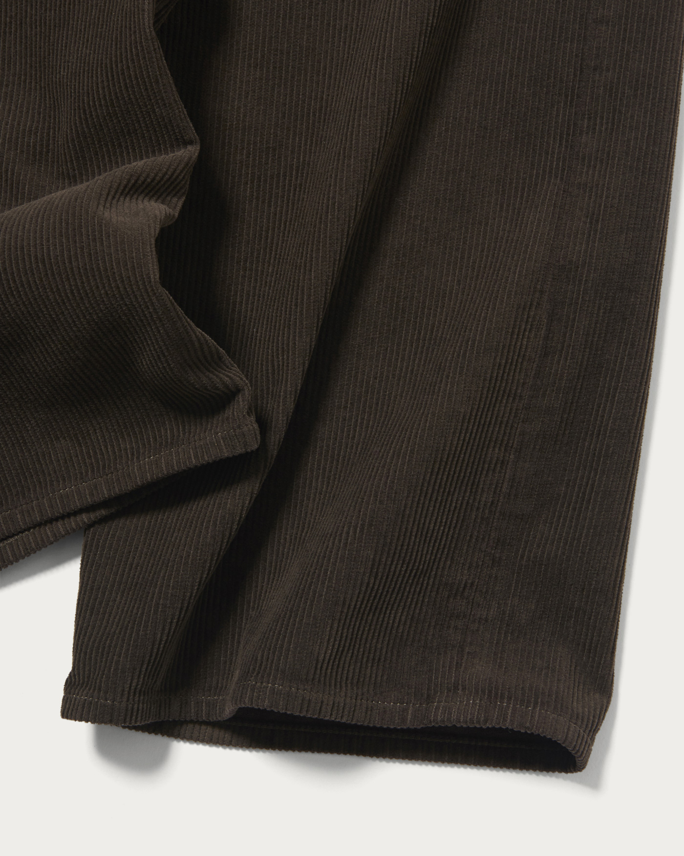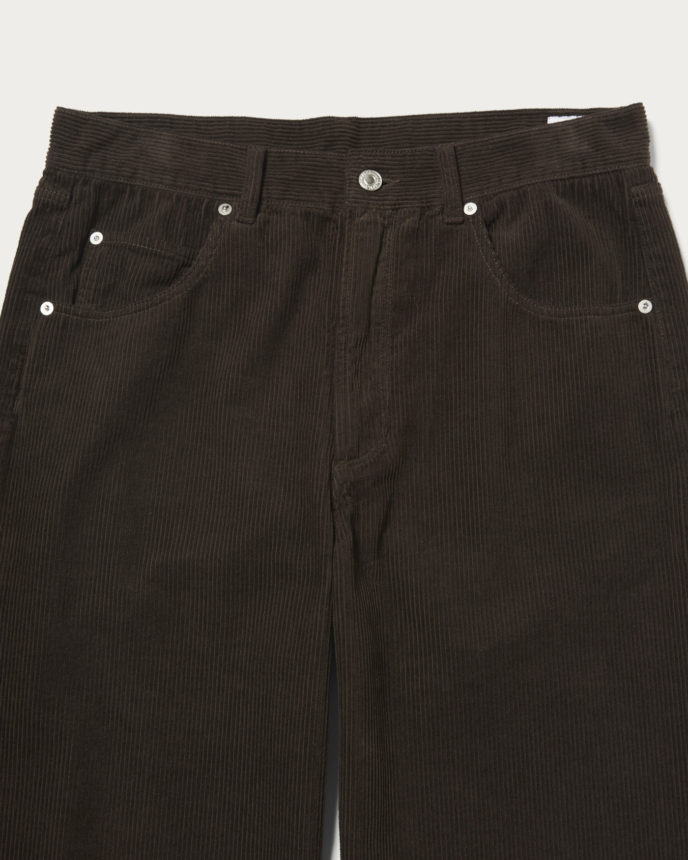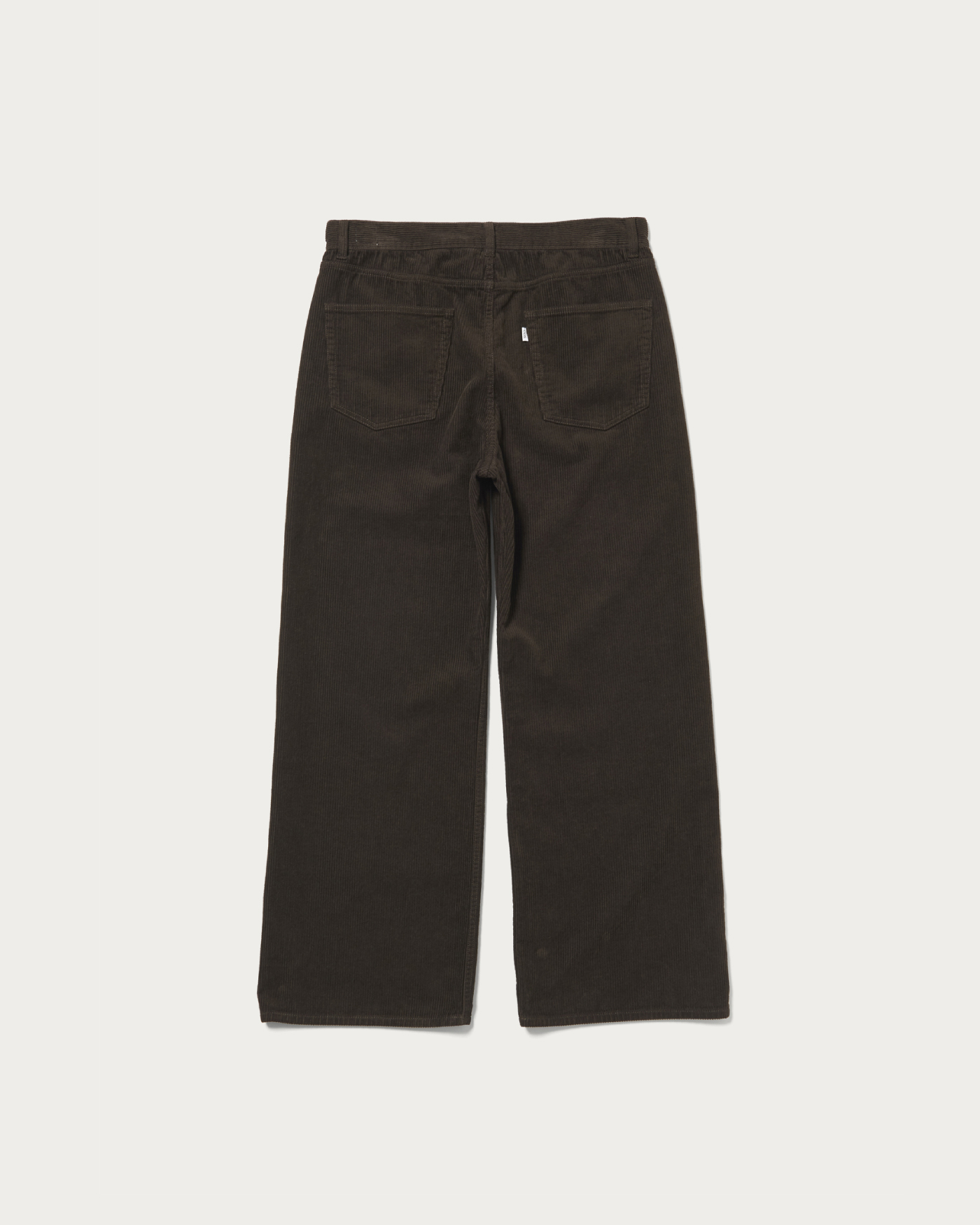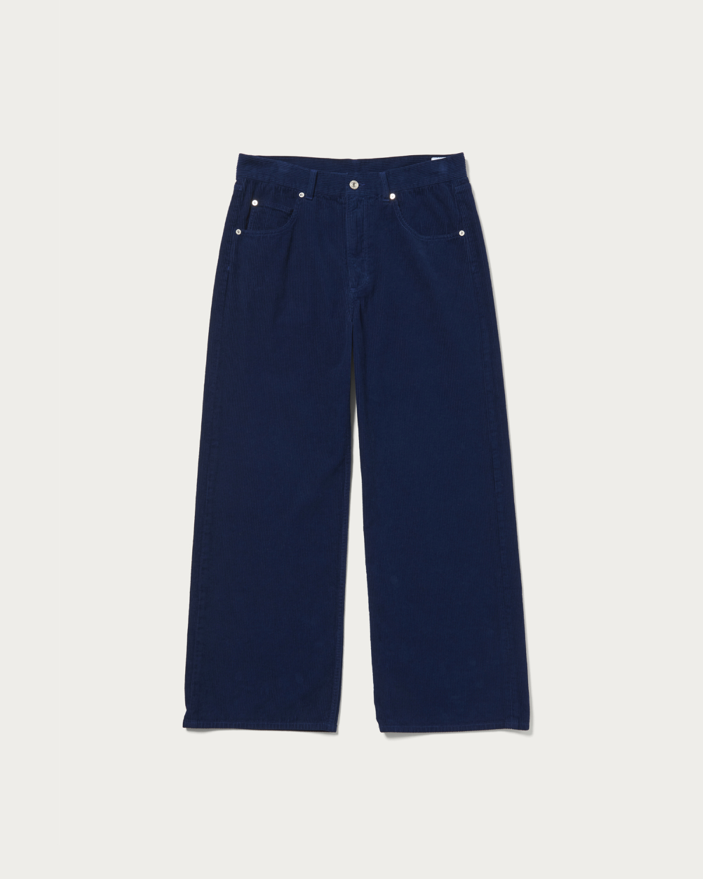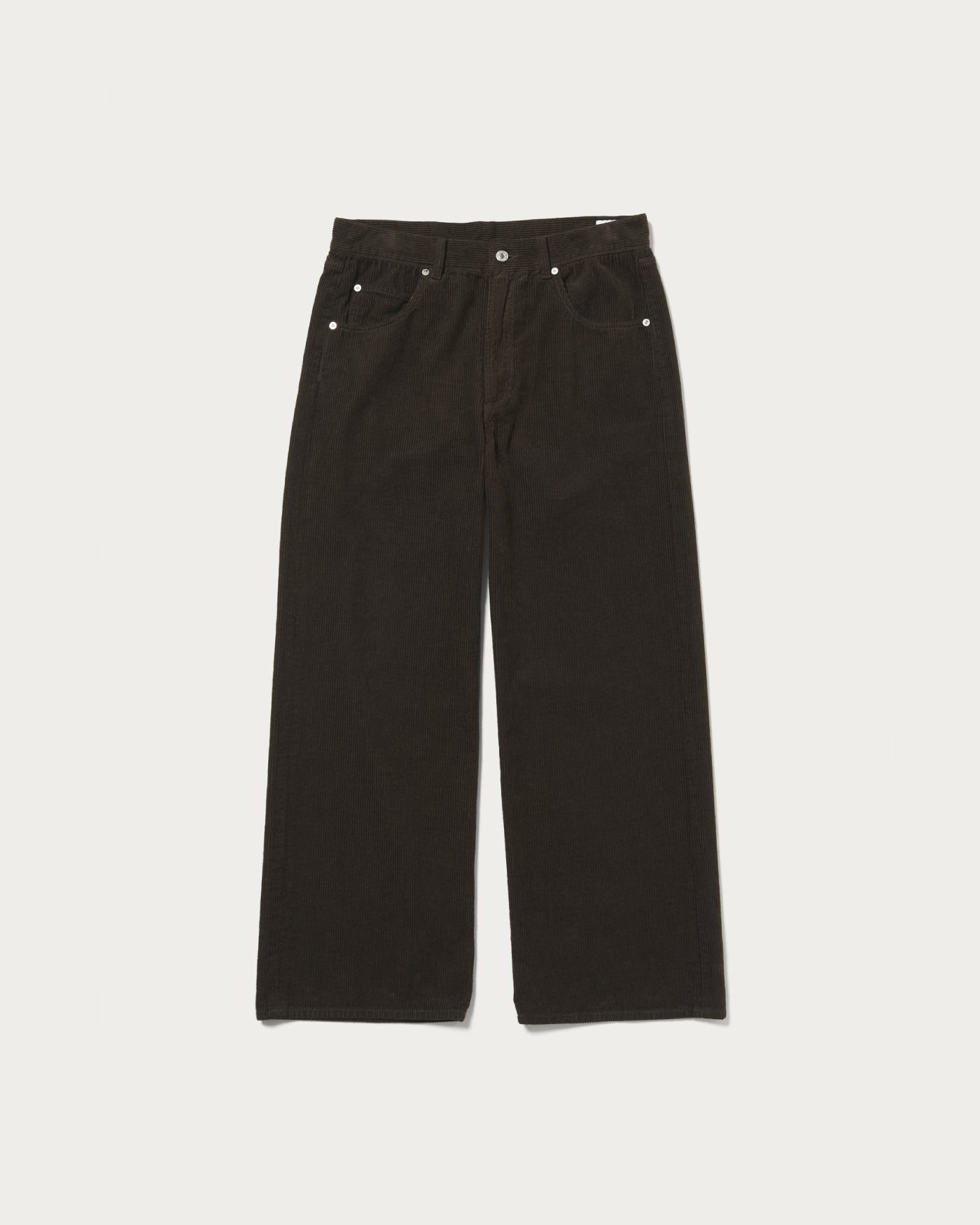 These baggy pants feature a wide silhouette crafted from thick-wale cotton corduroy, offering a perfect balance that avoids being overly loose. A key highlight is the slightly flared appearance due to the consistent width from the knee to the hem. Versatile and easy to style, these pants are a great addition to various outfits.
