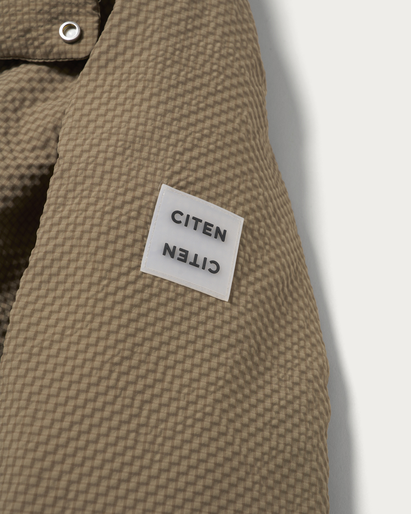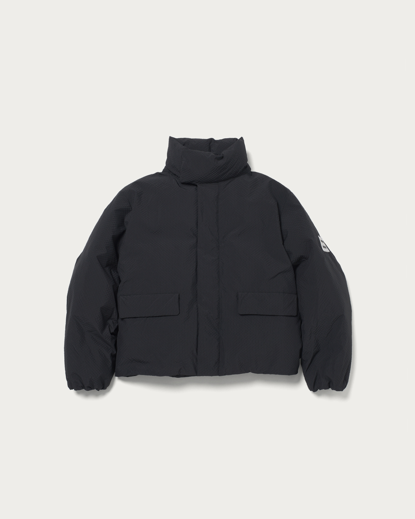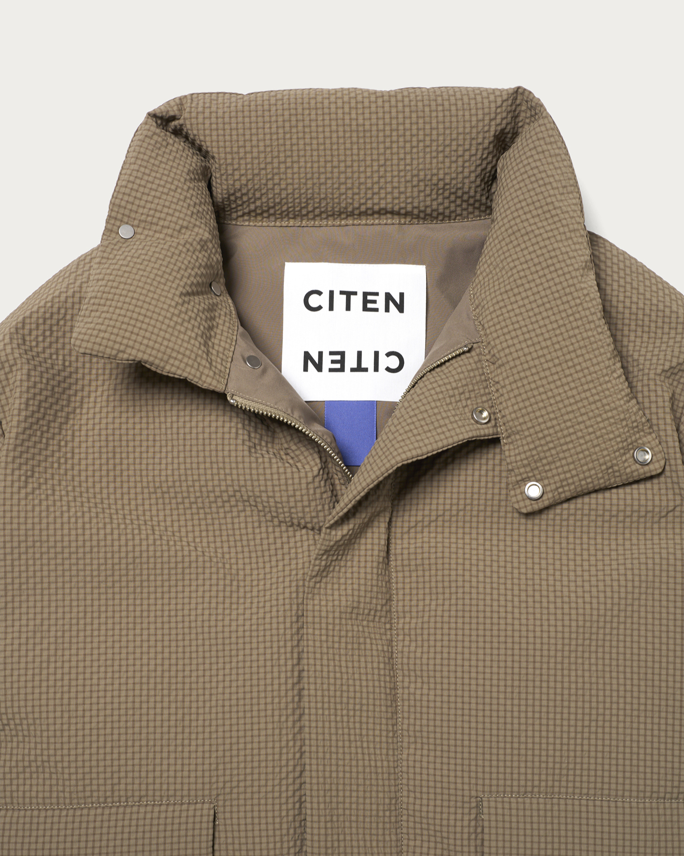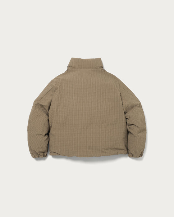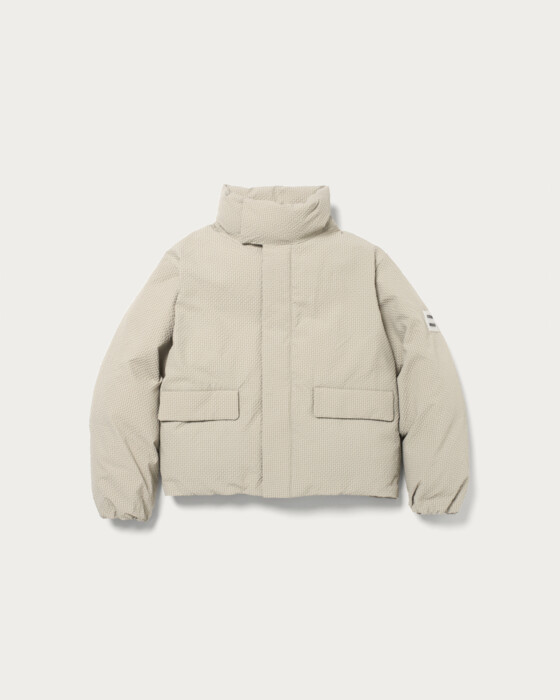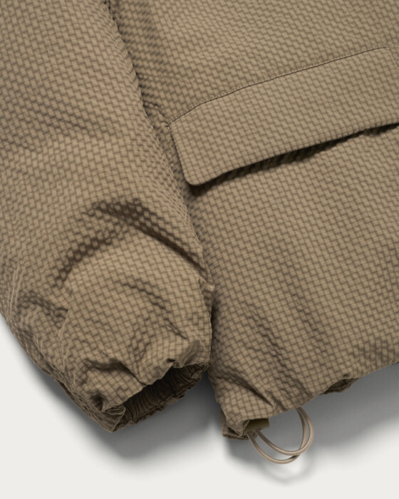 An outerwear piece featuring a fluffy, lightweight filling and a light outer fabric, making the entire garment lightweight and stress-free to wear. The subtle mini-check pattern is an eye-catching detail. With a stitchless, minimal design, the three-dimensional sleeve shape and not-too-long length are carefully crafted to create a modern style just by wearing it. The hem can be cinched with a drawstring, allowing you to enjoy changes in silhouette. This clean and minimal design is a quintessential piece that embodies CITEN's signature style.