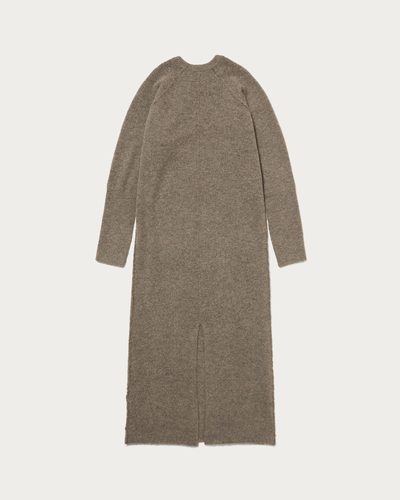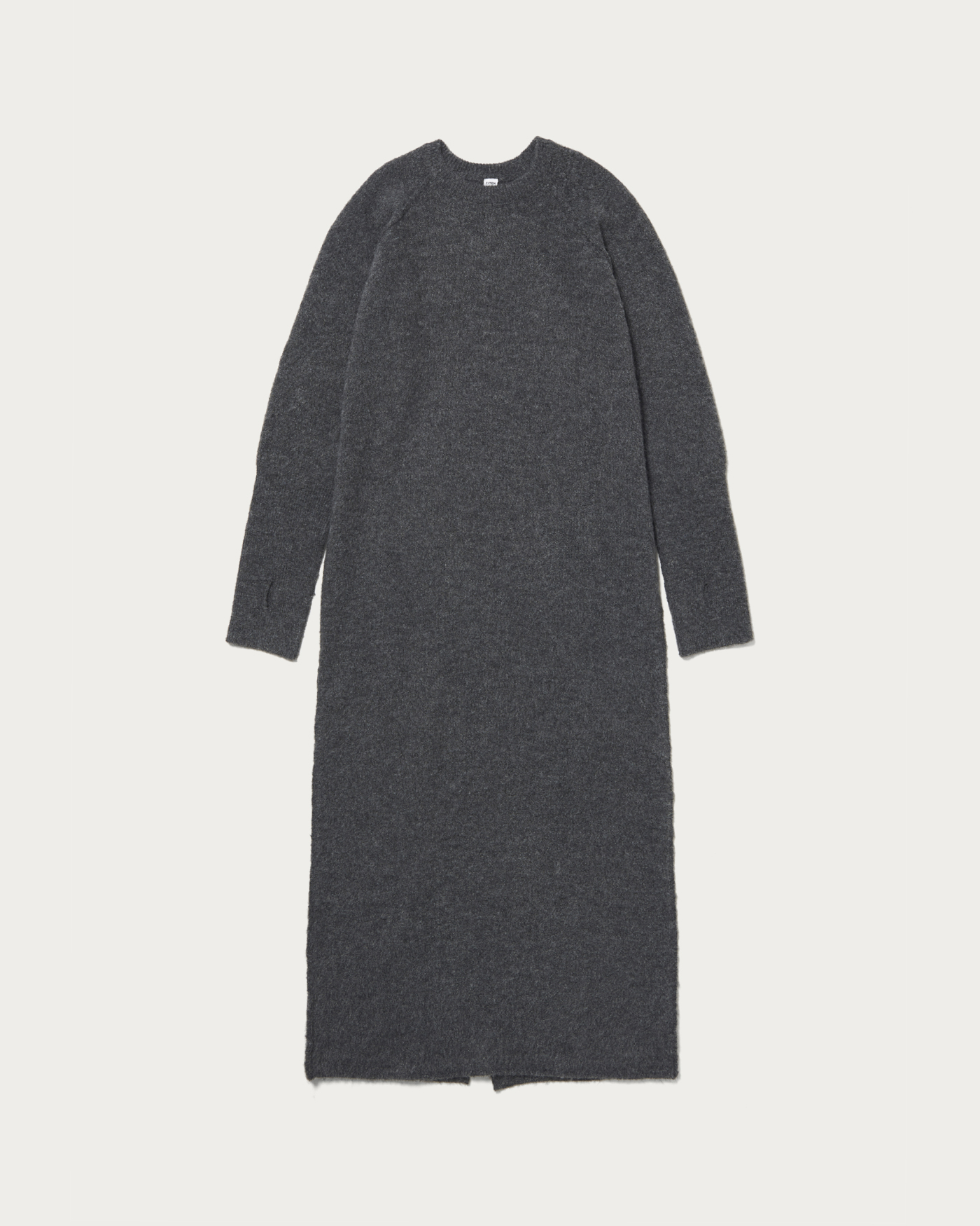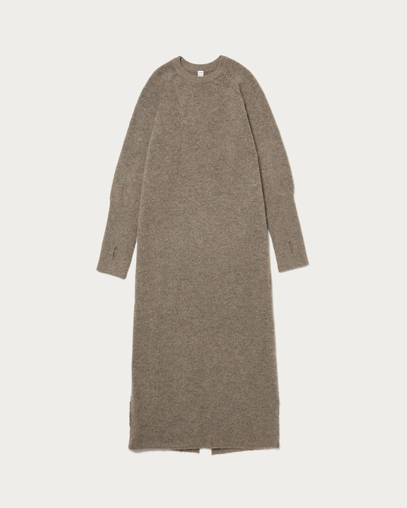 A knit dress with a feminine charm. This piece features a narrow silhouette that enhances your style and provides a slimming effect. Attention has been paid to the balance of details, such as the neckline and sleeve silhouette. The sleeves are crafted with a combination of knit patterns to add texture and character. Additionally, the cuffs are designed with thumbholes, adding a touch of mature casual style.