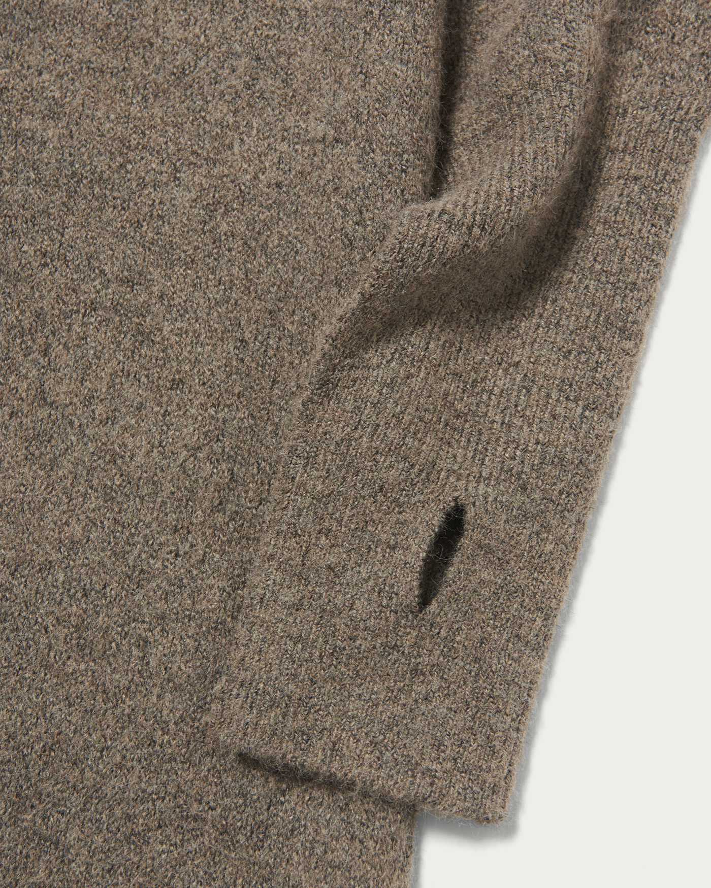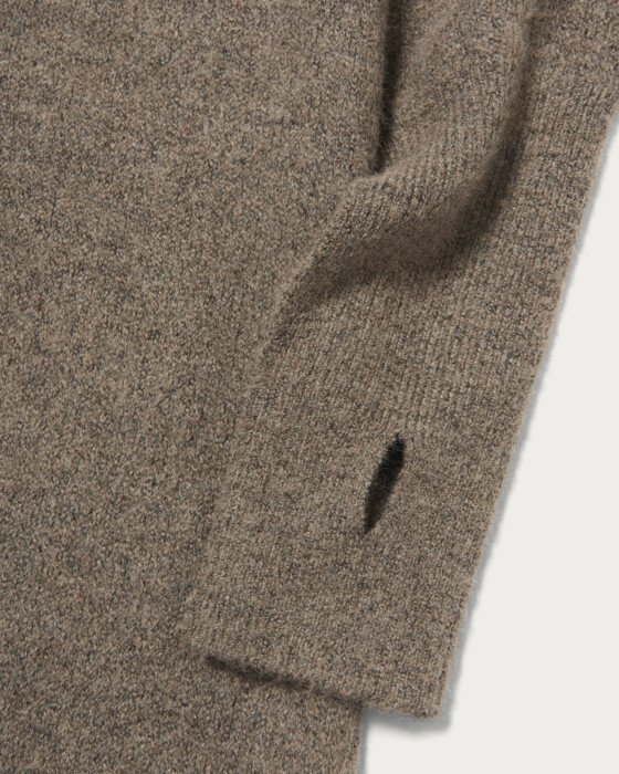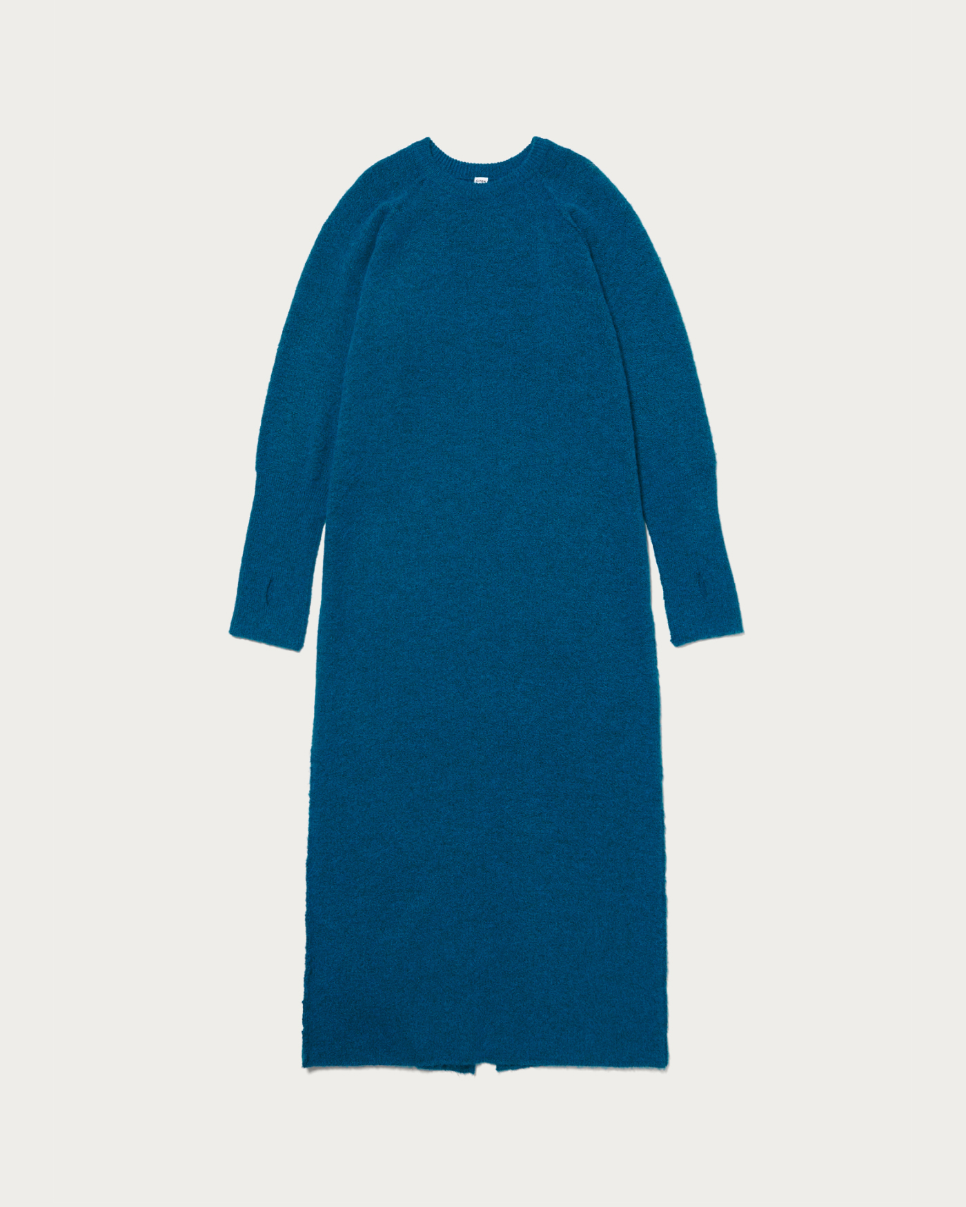 A knit dress with a feminine charm. This piece features a narrow silhouette that enhances your style and provides a slimming effect. Attention has been paid to the balance of details, such as the neckline and sleeve silhouette. The sleeves are crafted with a combination of knit patterns to add texture and character. Additionally, the cuffs are designed with thumbholes, adding a touch of mature casual style.