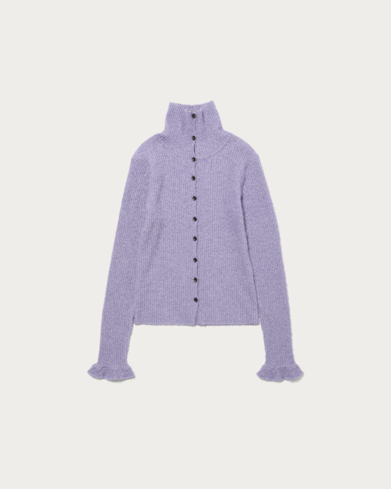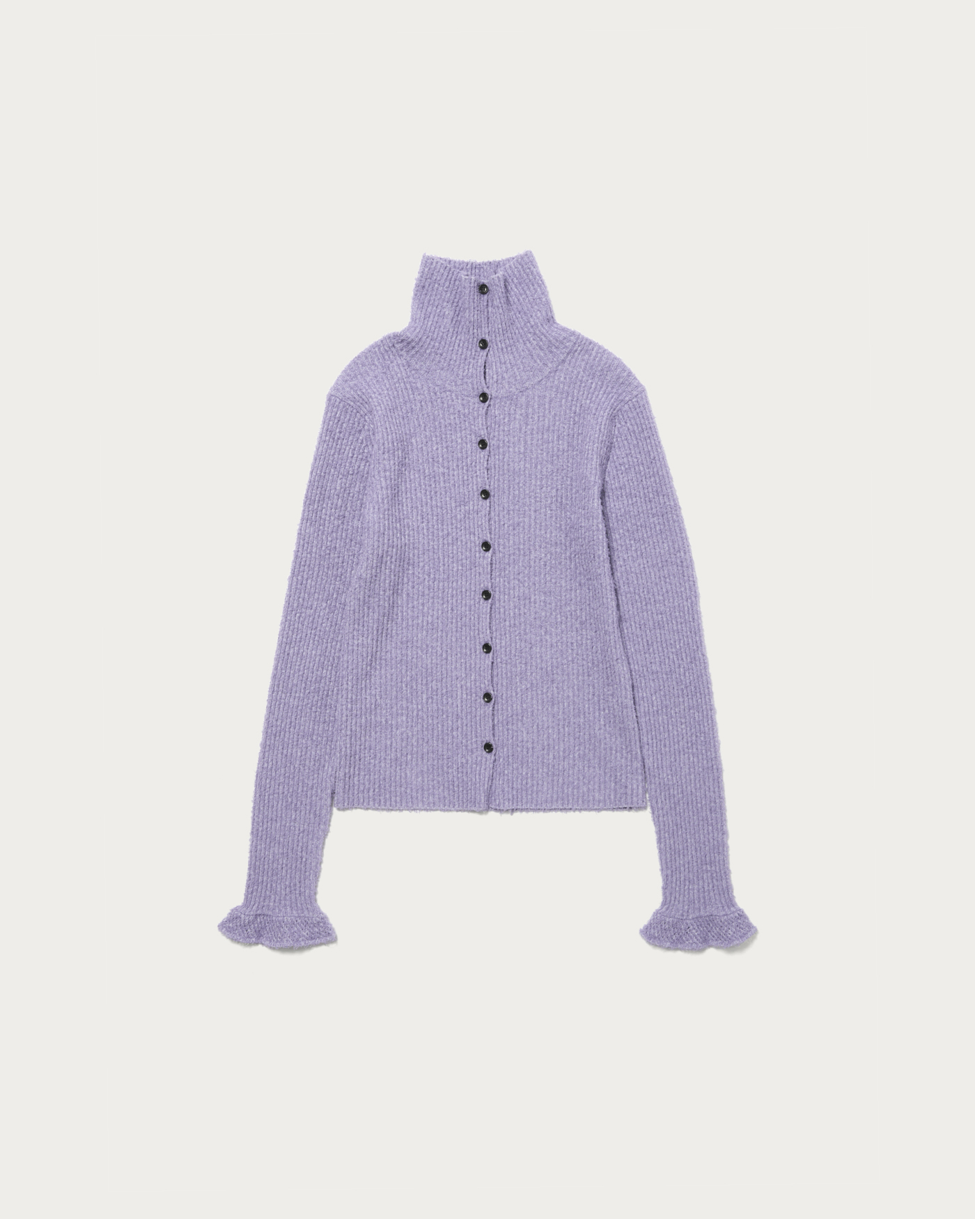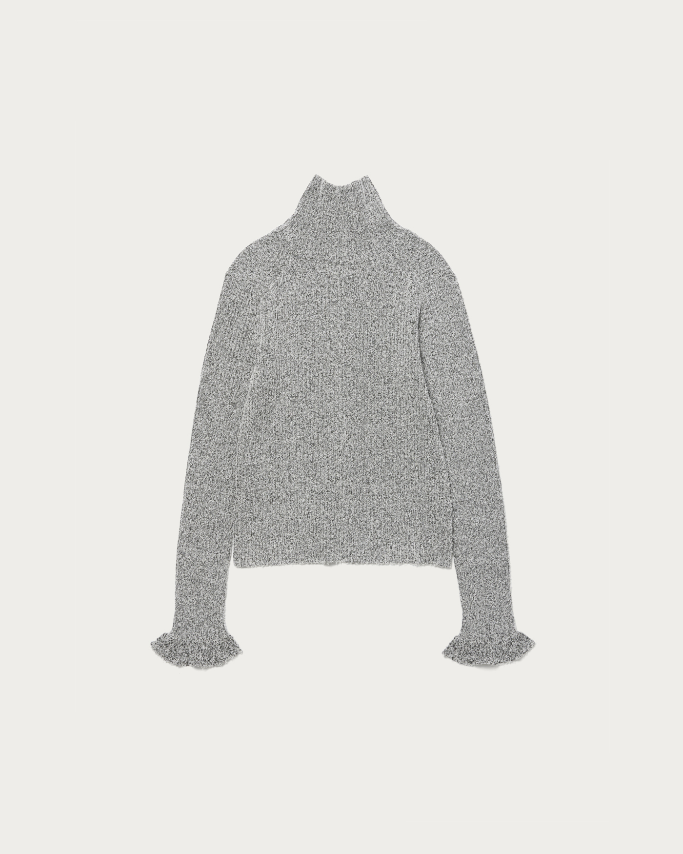 A turtleneck knit with a textured surface and melange-like colors that give off a moderately casual impression. You can wear it as a turtleneck by standing up the collar, or unbutton it and fold it down to create a collar, and it can also be worn in a front-to-back 2-way style, allowing you to enjoy various ways of wearing it. The subtle frill at the cuffs adds a discreet point of interest. The rib is knitted with uniquely shaped "hige" yarn, giving it a three-dimensional look and a moderate thickness. Both colors have a melange appearance, so even a tight silhouette maintains a casual vibe.