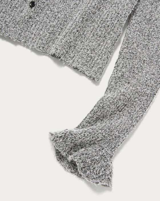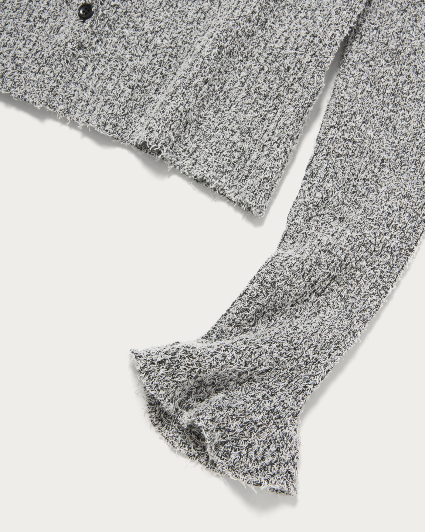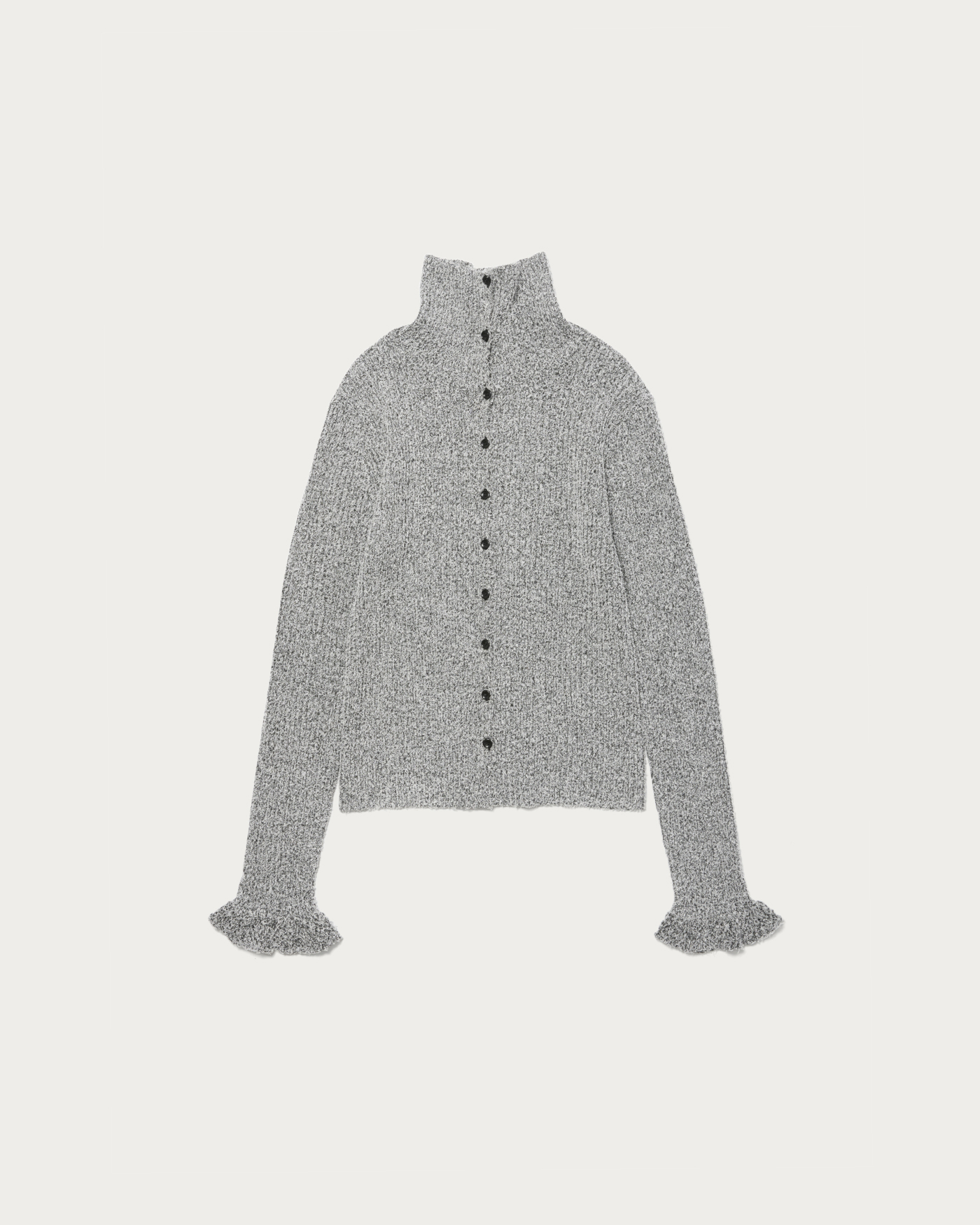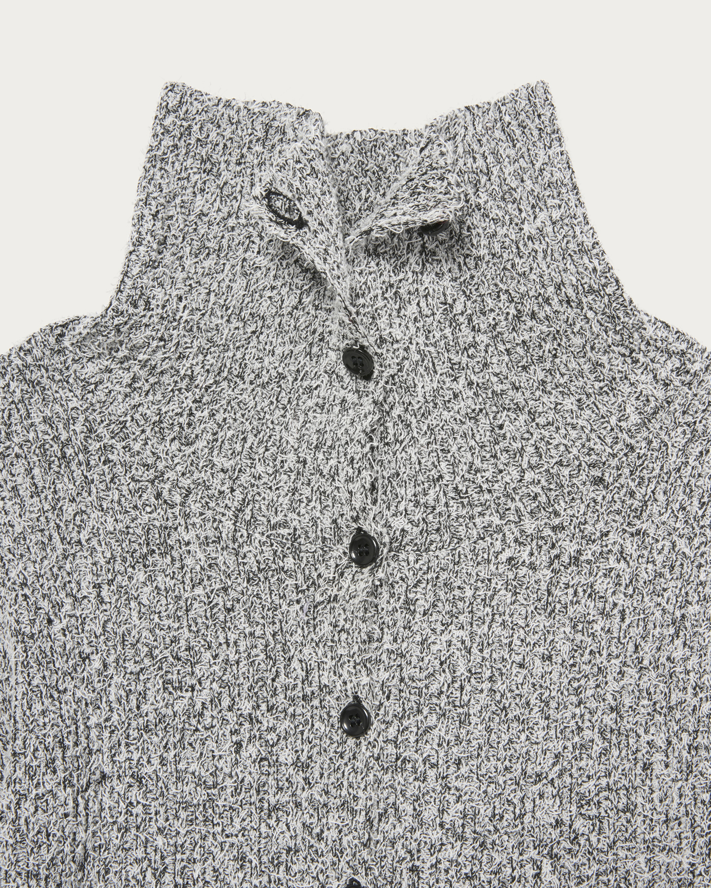 A turtleneck knit with a textured surface and melange-like colors that give off a moderately casual impression. You can wear it as a turtleneck by standing up the collar, or unbutton it and fold it down to create a collar, and it can also be worn in a front-to-back 2-way style, allowing you to enjoy various ways of wearing it. The subtle frill at the cuffs adds a discreet point of interest. The rib is knitted with uniquely shaped "hige" yarn, giving it a three-dimensional look and a moderate thickness. Both colors have a melange appearance, so even a tight silhouette maintains a casual vibe.