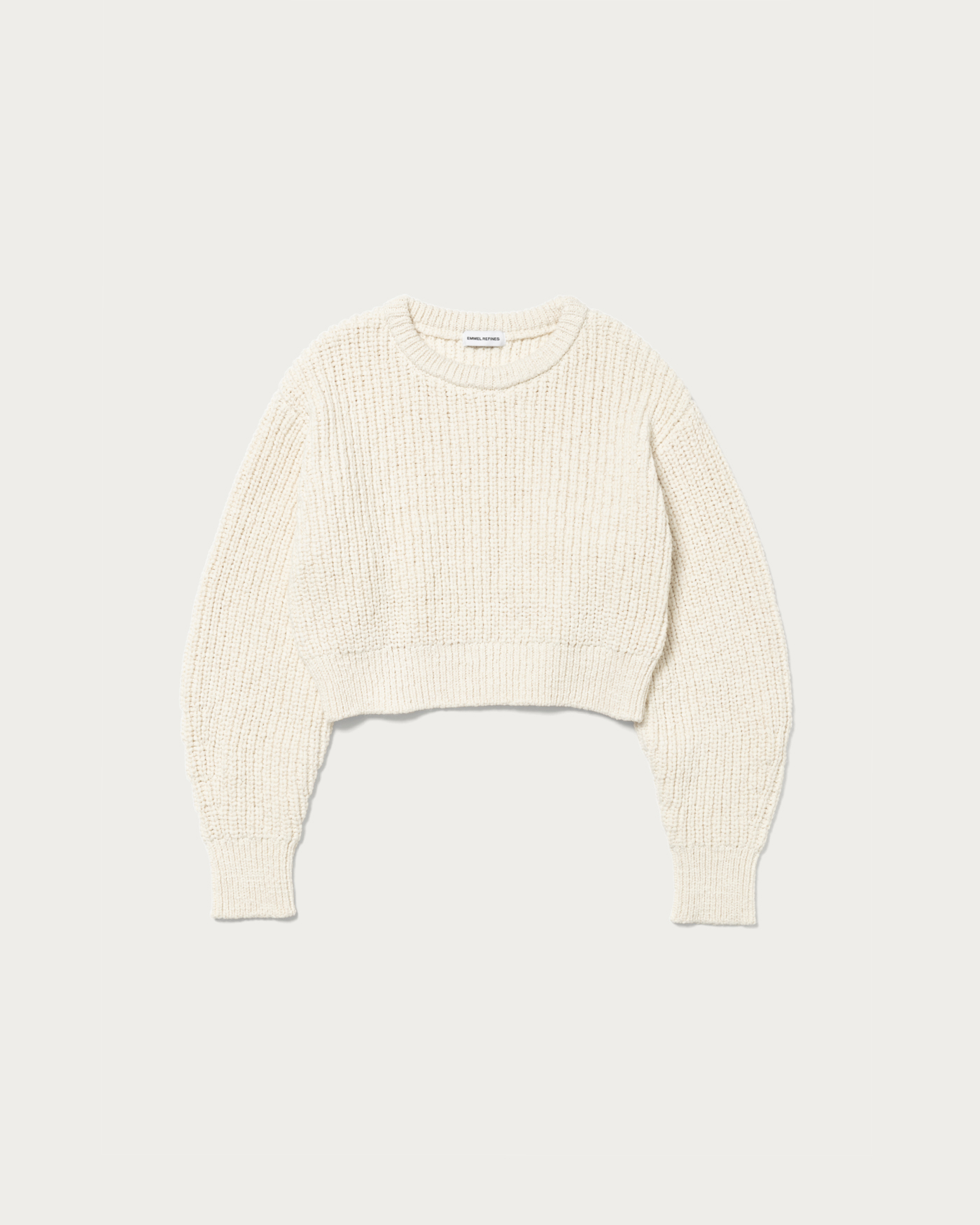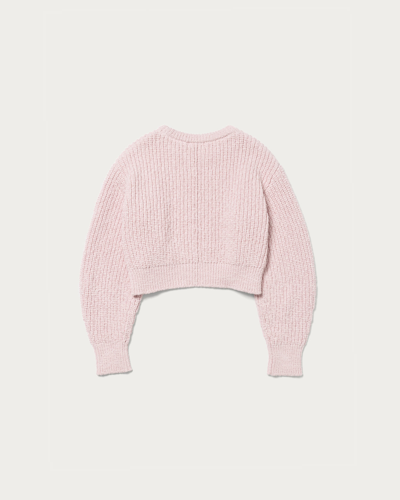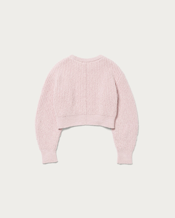The key feature of this knit with a ribbed texture is its slightly rounded shape. The ribbed neck adds a casual touch to the overall look. Its short length and voluminous sleeves make it an easy piece to coordinate with various outfits. The soft colors are also appealing.