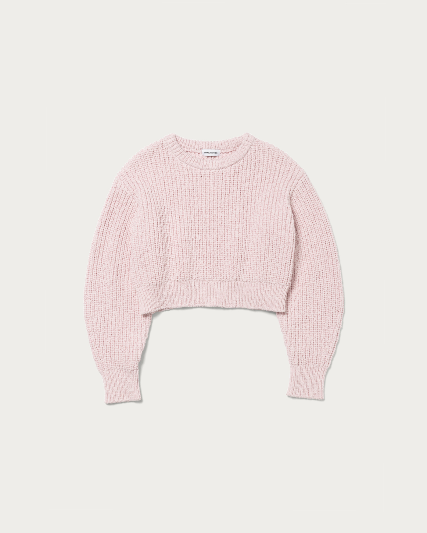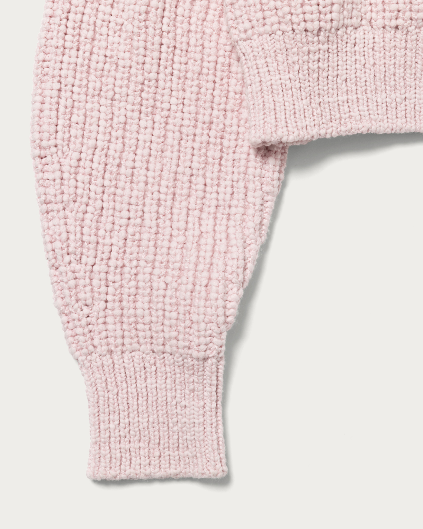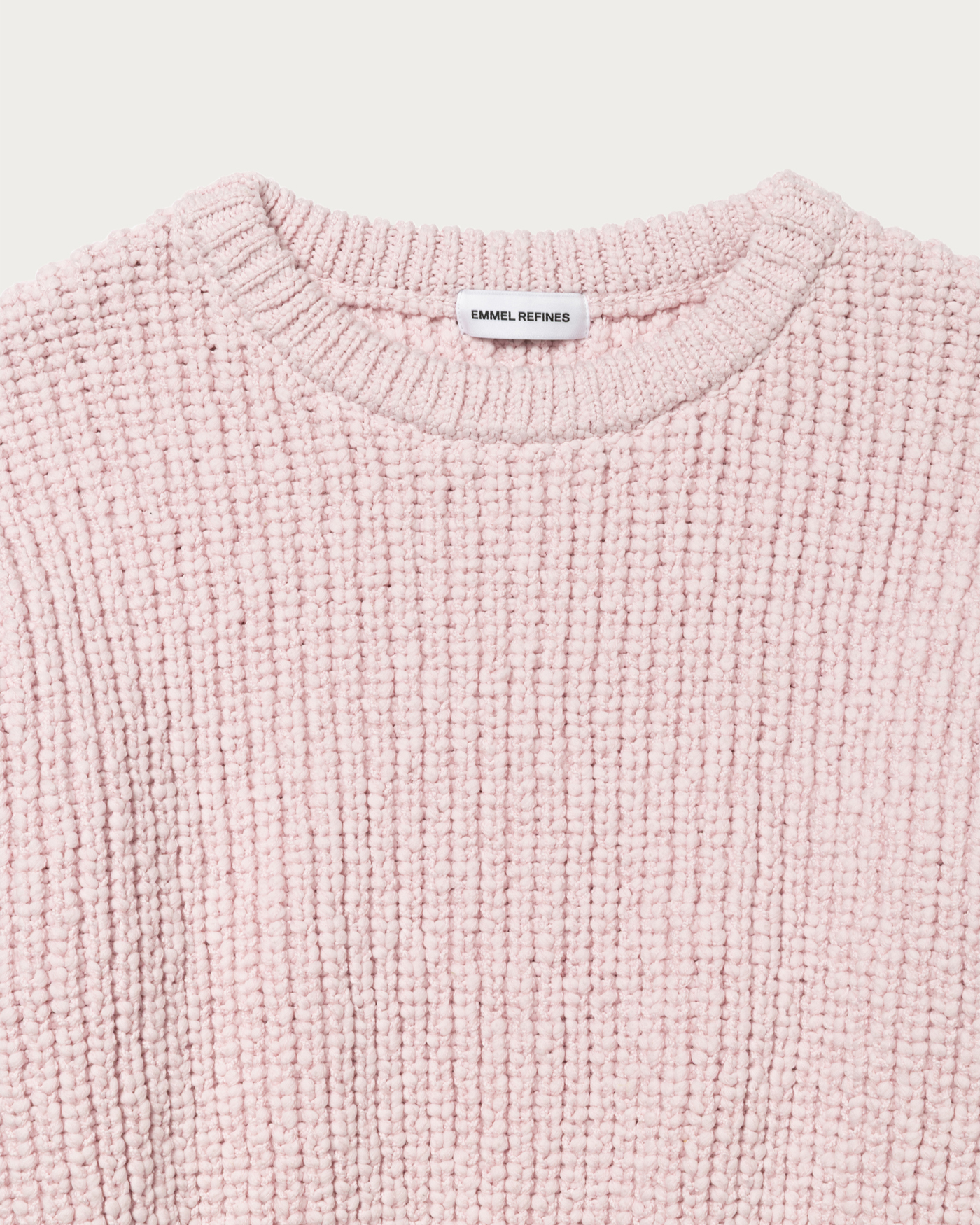 The key feature of this knit with a ribbed texture is its slightly rounded shape. The ribbed neck adds a casual touch to the overall look. Its short length and voluminous sleeves make it an easy piece to coordinate with various outfits. The soft colors are also appealing.
