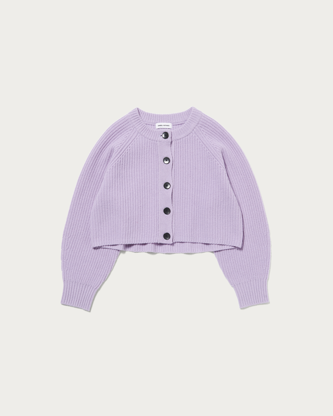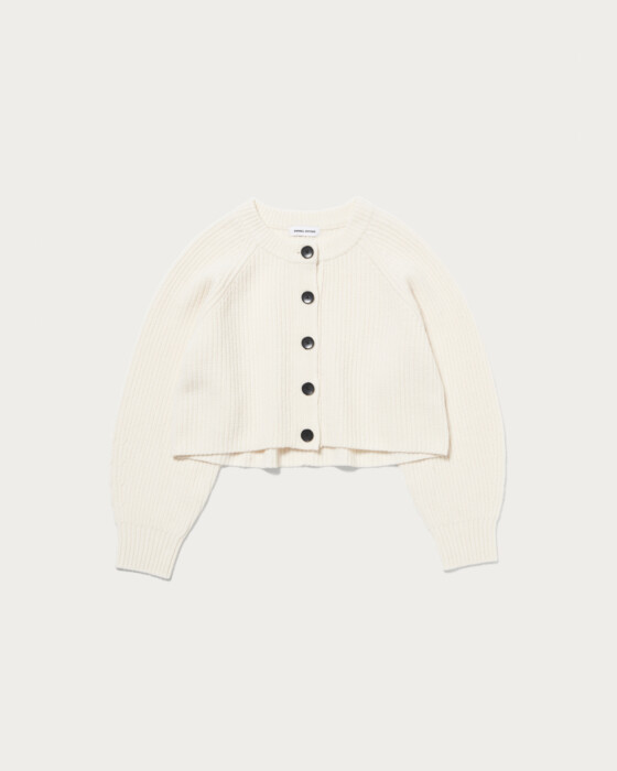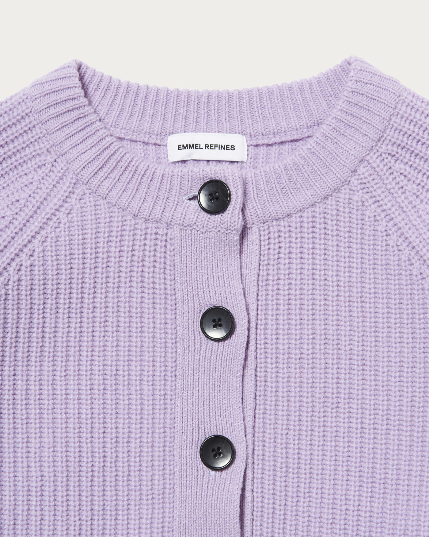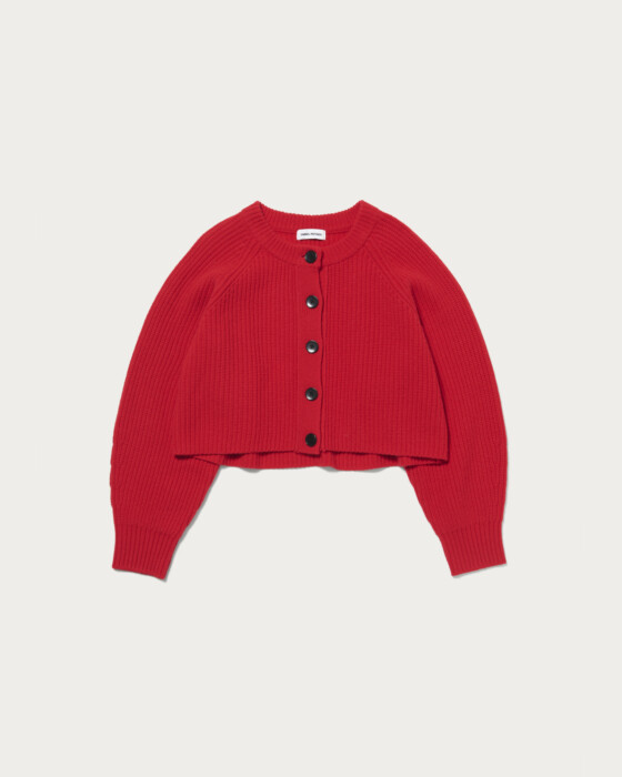 The cardigan features large buttons on the front as a key point, characterized by its compact length and voluminous sleeves. Made with a plush knit, it serves as a great outerwear alternative from autumn onwards. With the catchy colors typical of EMMEL REFINES, this piece adds a vibrant touch to your winter wardrobe.