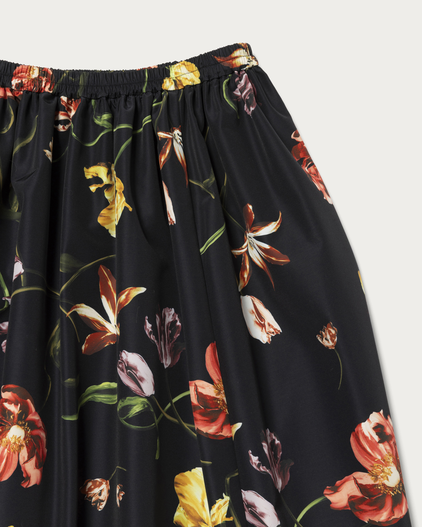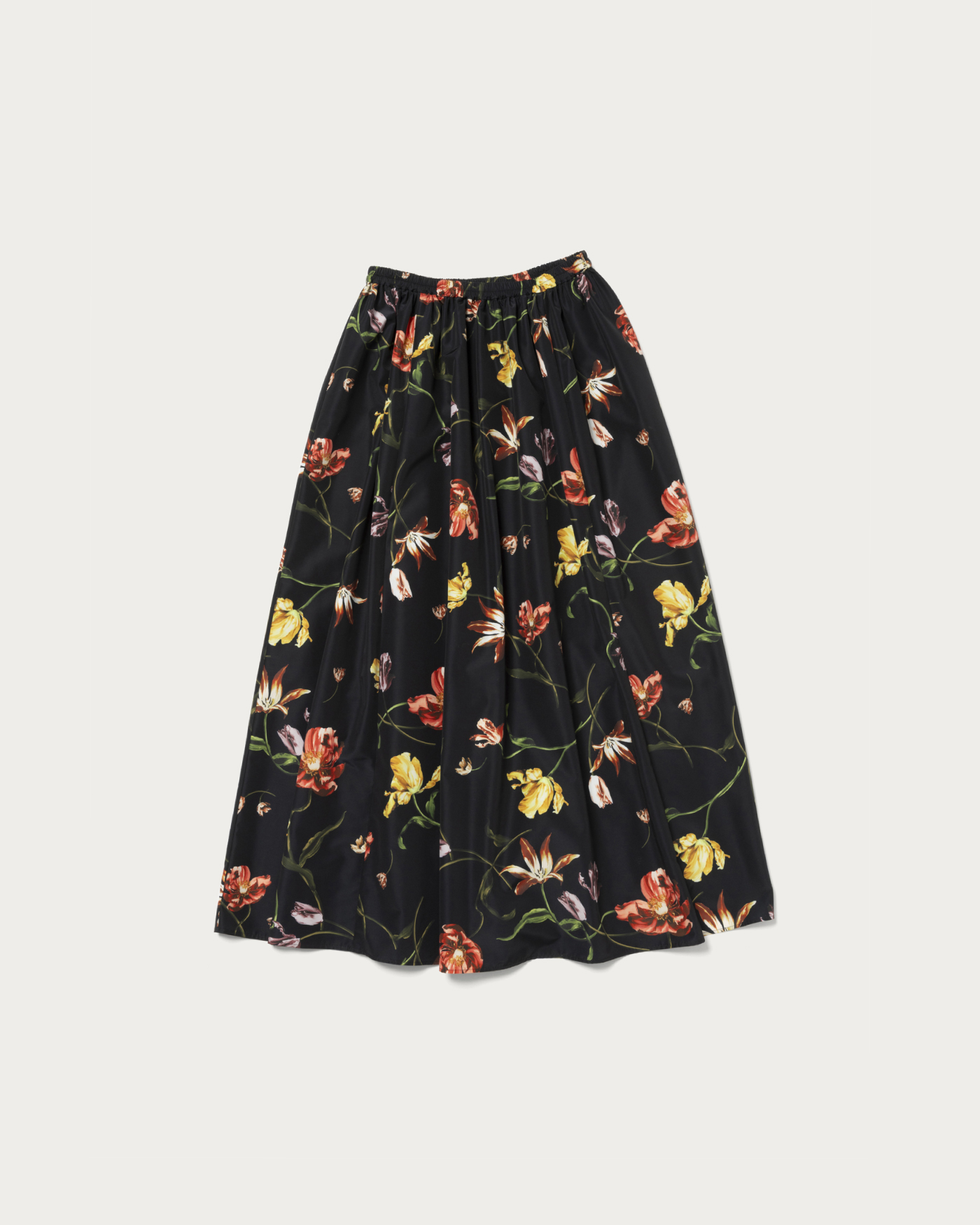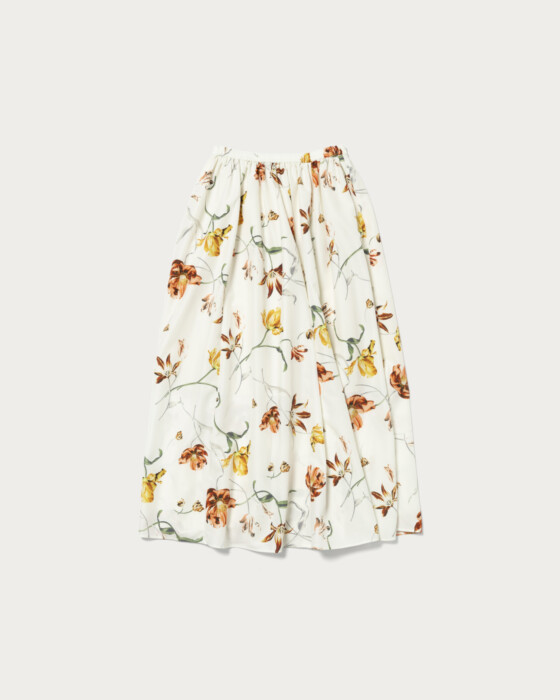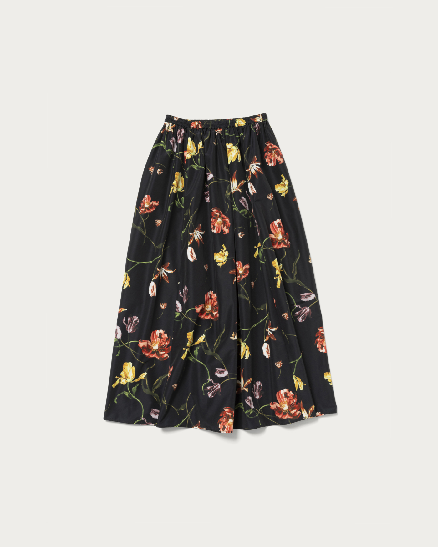 New release of the popular floral print skirt. We've prepared it with an autumn-inspired floral pattern. Designed with a silhouette that has plenty of volume towards the hem, this piece will be the star of your outfit. The elastic waistband adds comfort, making it a delightful feature.
