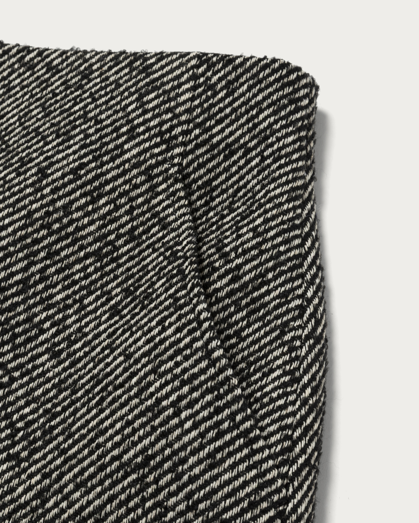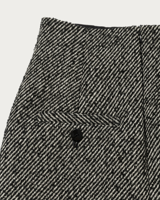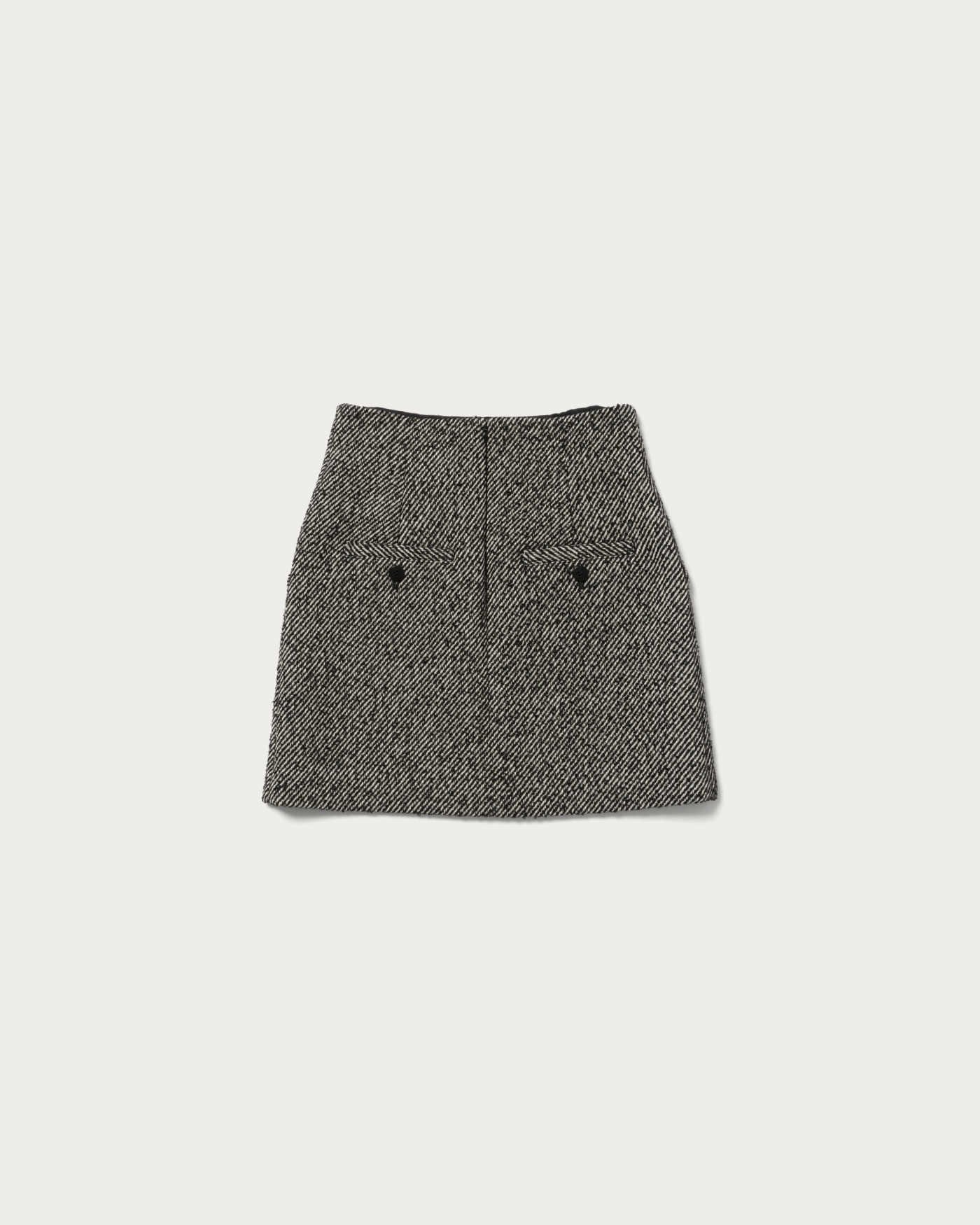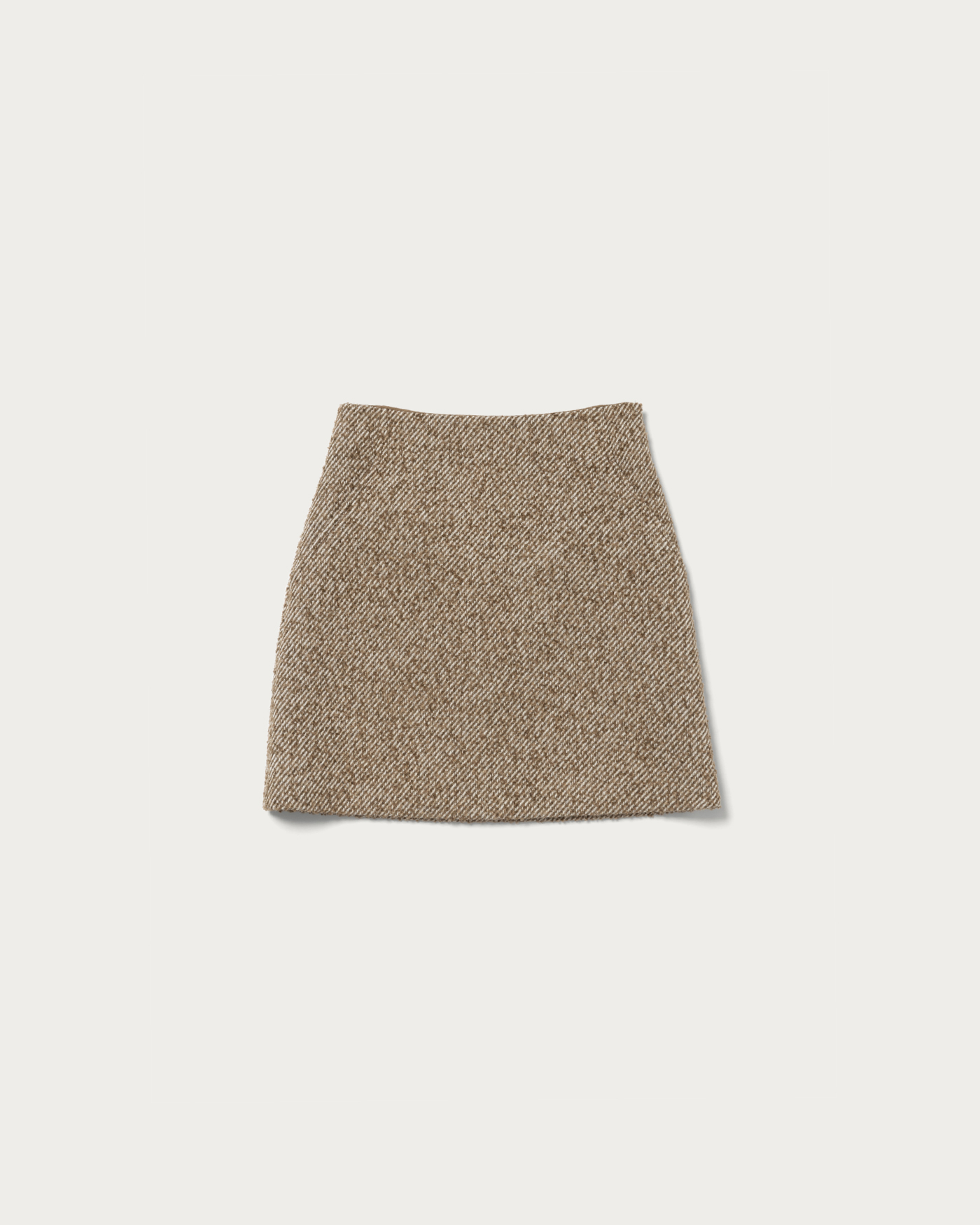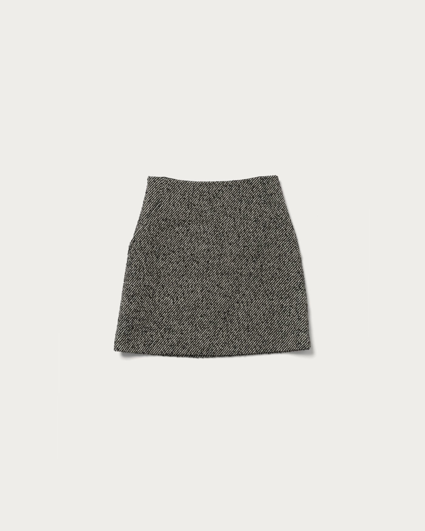 A beltless mini skirt with a minimalistic design. It features a slightly trapezoidal silhouette and uses a tweed-like bonded material, giving it a fresh form with just the right amount of firmness. The tweed-like fabric, woven with ring-shaped threads, allows you to enjoy the seasonal mood, while the spongy material is bonded for added texture. The twill weave adds a touch of sophistication without being overly formal, making it perfect for casual wear.