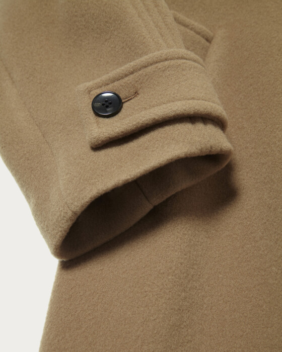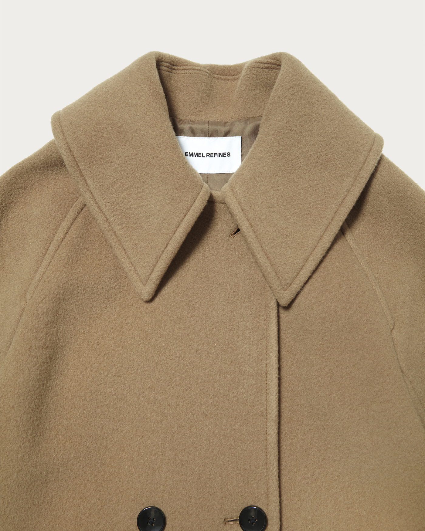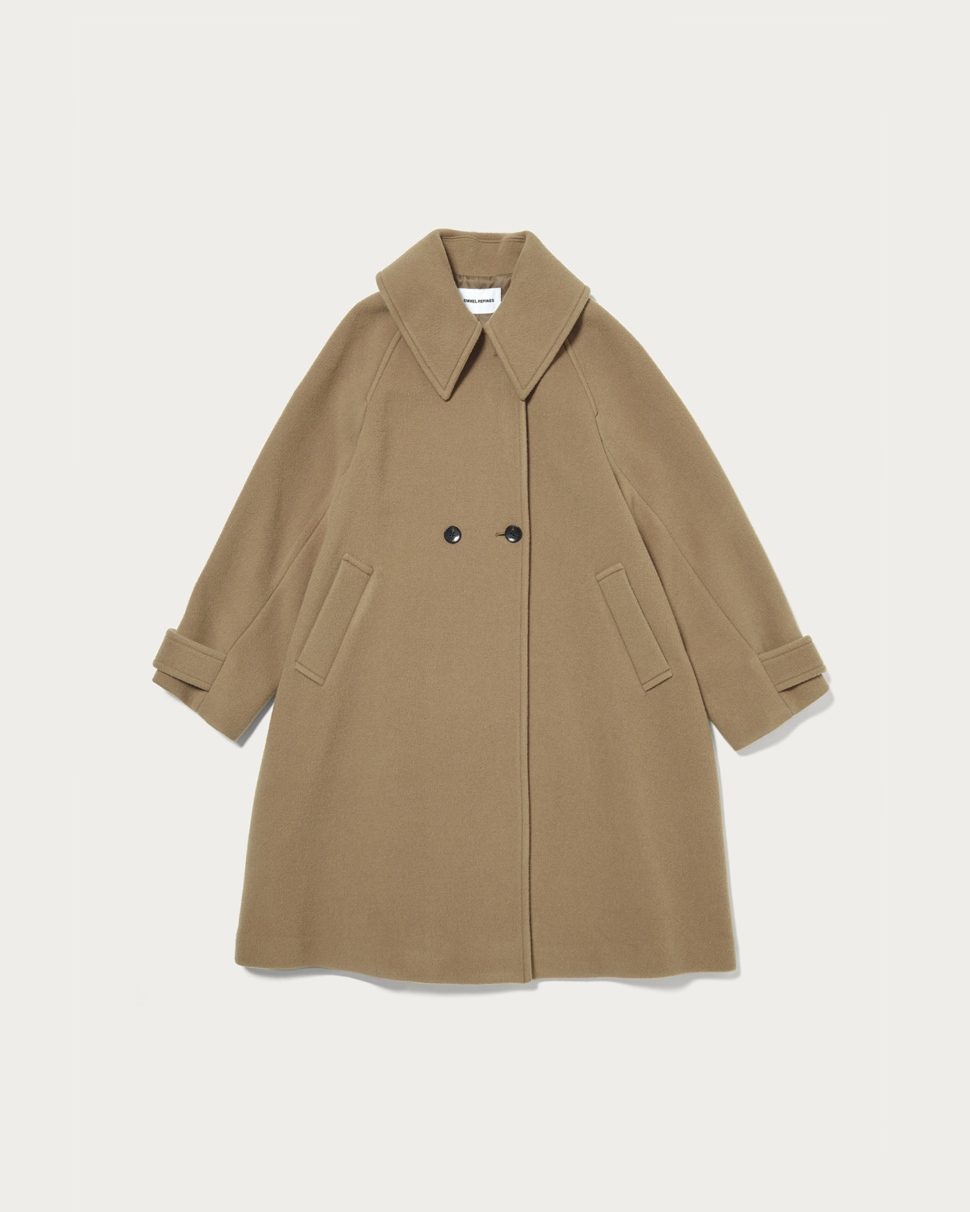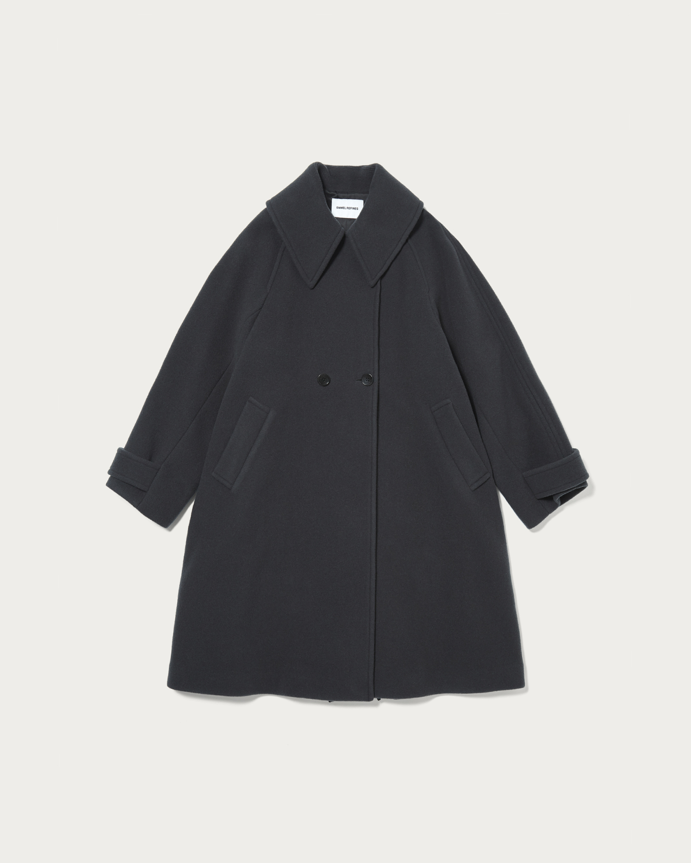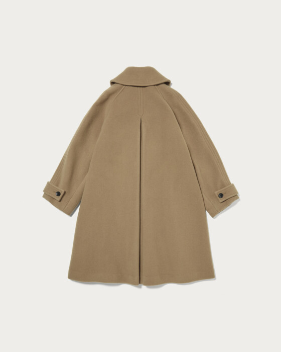A mid-length coat with a flared tent silhouette that exudes charm. The large collar adds a touch of classical and modern flair. Whether buttoned up or left open, the collar serves as a focal point around the face. Made from a wool and nylon fabric that offers volume without being too heavy.