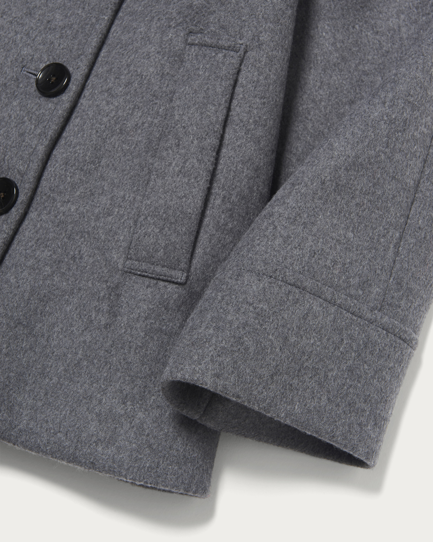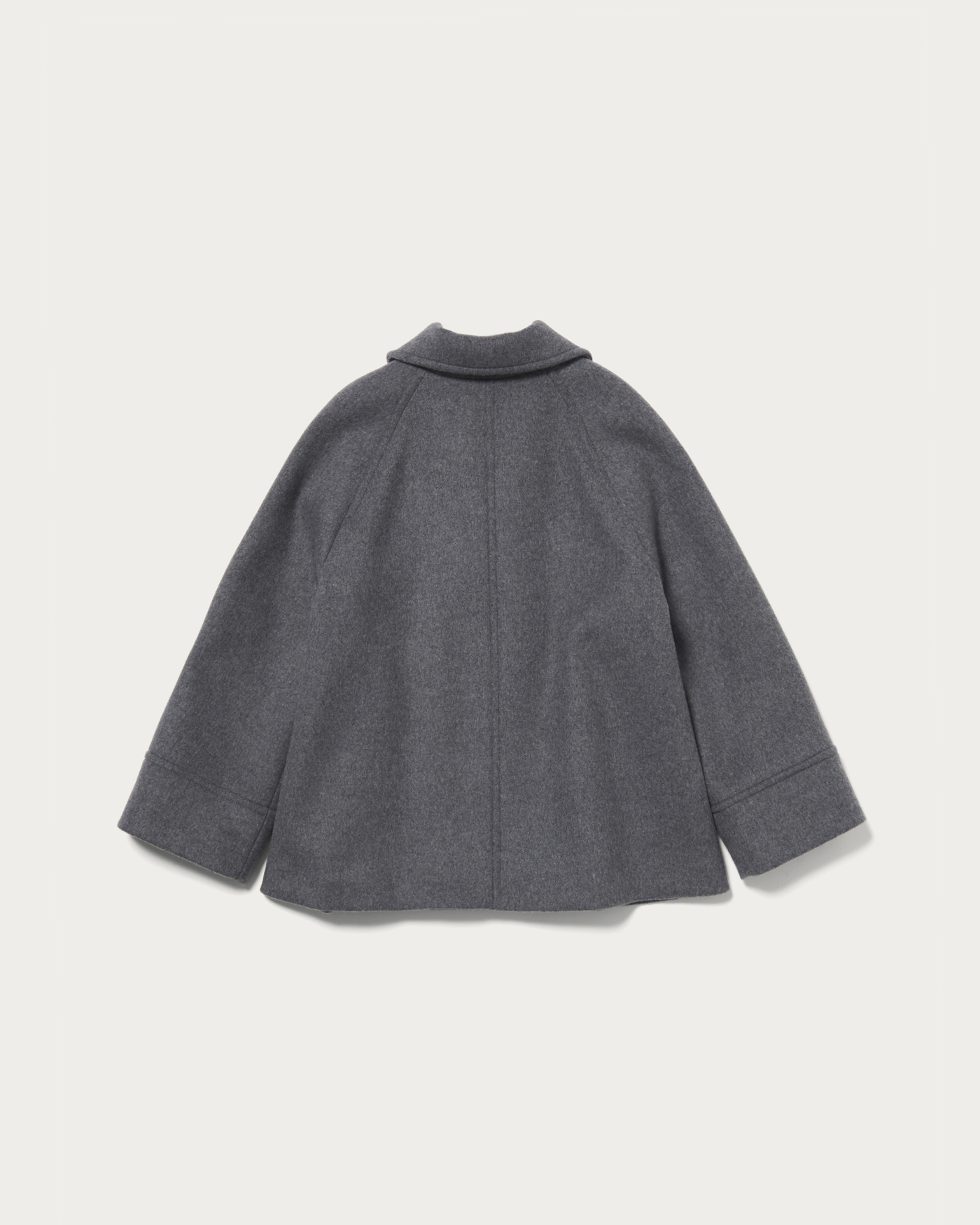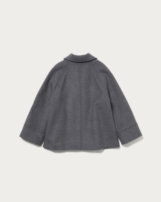 We have crafted a trendy pea coat in a mid-length design. The large buttons and stitch details add a modern touch. The back style features raglan sleeves, providing a comfortable fit with just the right amount of room around the shoulders. Made from a melton fabric with a moderate firmness, it offers a sharp and sophisticated look.