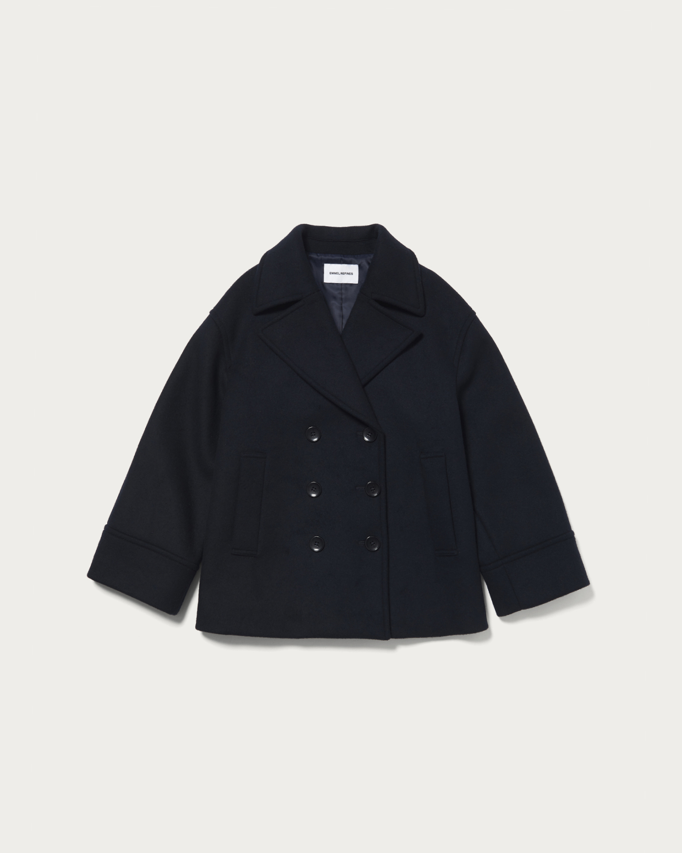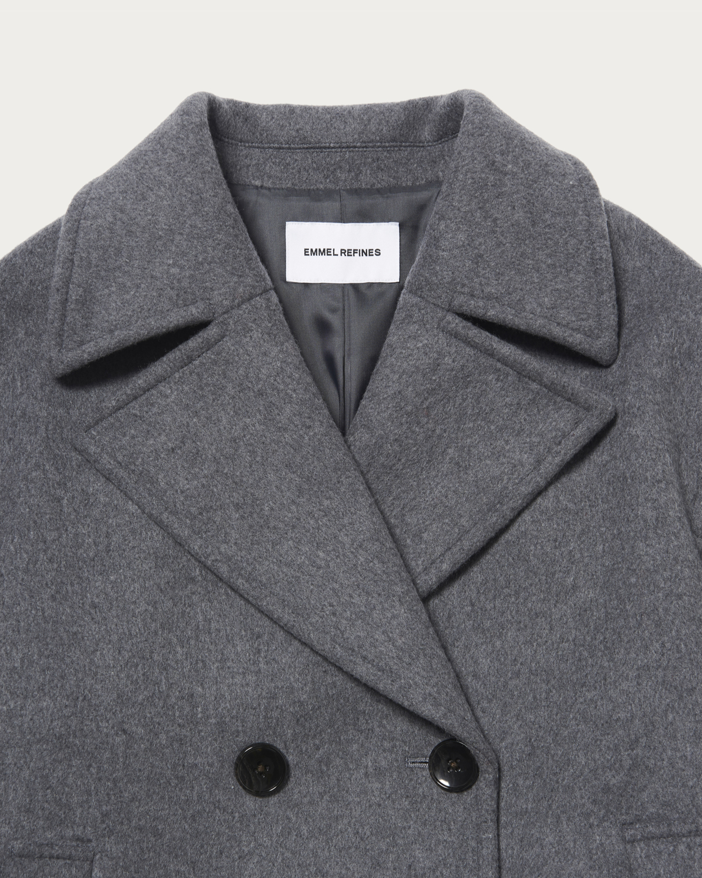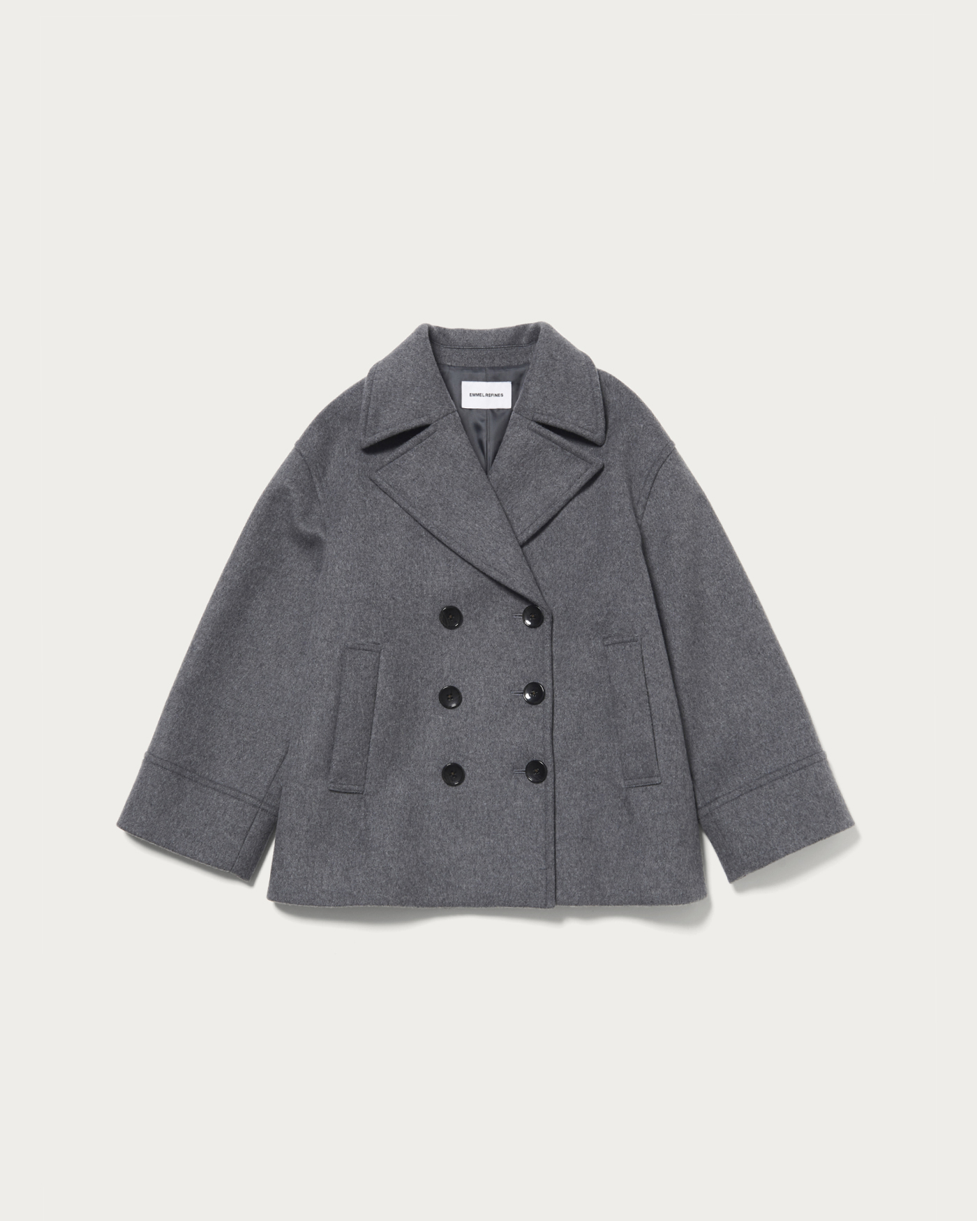 We have crafted a trendy pea coat in a mid-length design. The large buttons and stitch details add a modern touch. The back style features raglan sleeves, providing a comfortable fit with just the right amount of room around the shoulders. Made from a melton fabric with a moderate firmness, it offers a sharp and sophisticated look.