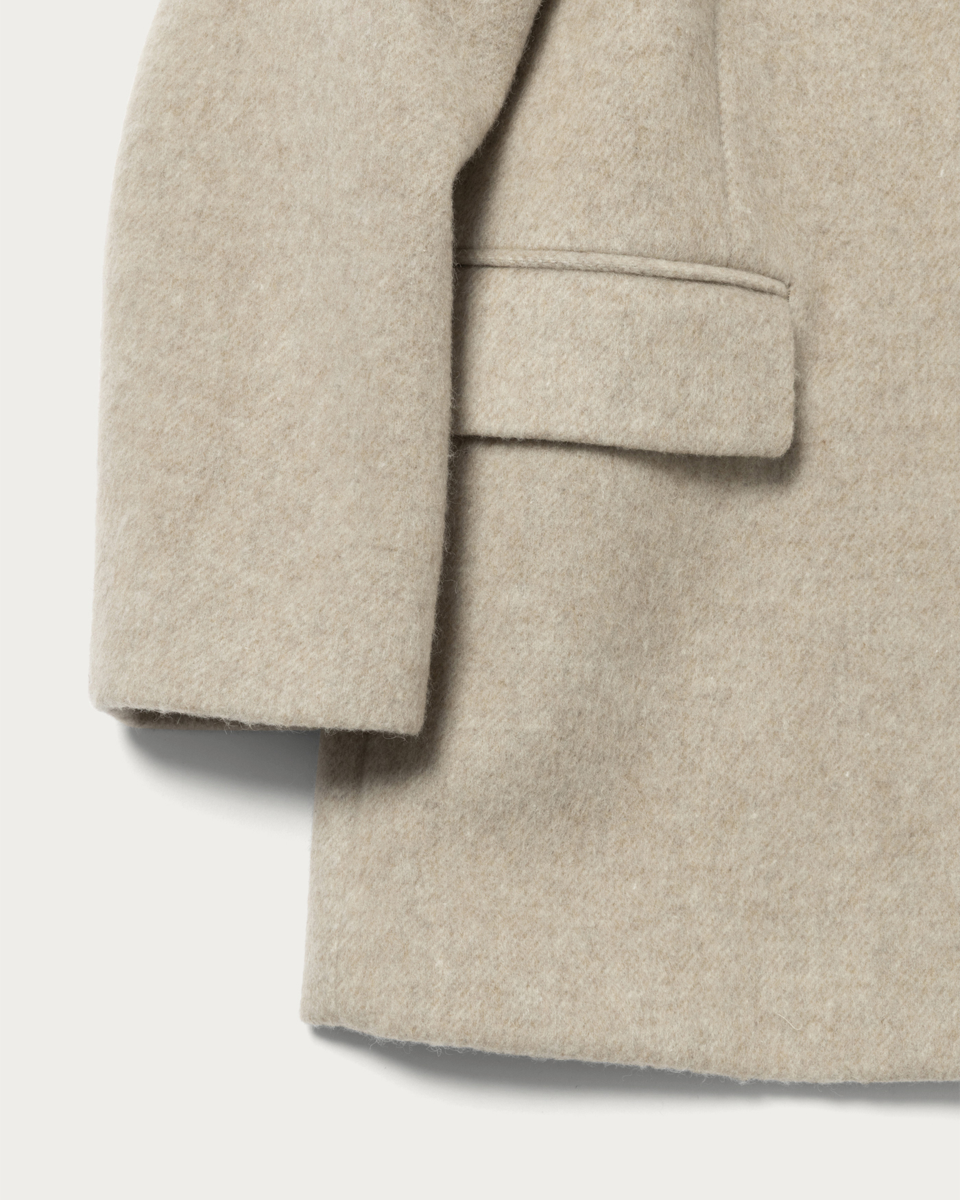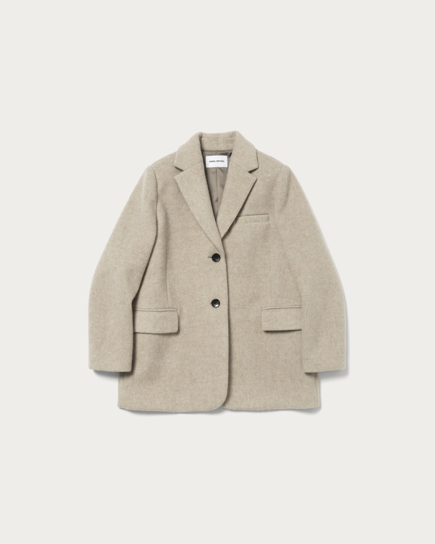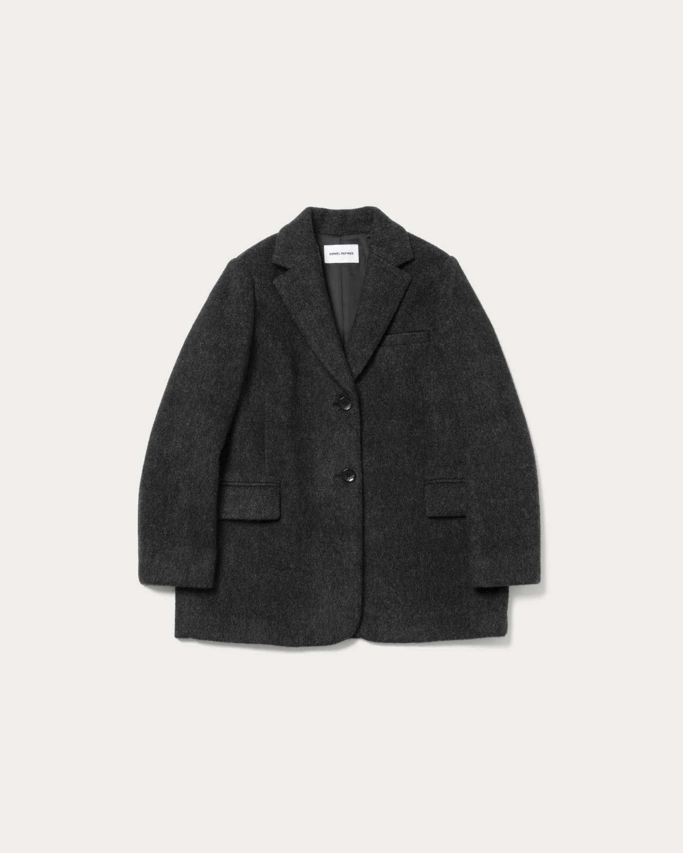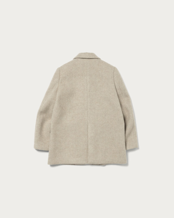A boxy silhouette bonding jacket that can be worn like outerwear. Made with a moderately firm material, it maintains a three-dimensional shape while achieving a size that doesn't appear overly large. The outer fabric is a shaggy material with a soft texture, making it a piece that can be worn with a feminine touch without looking too masculine.