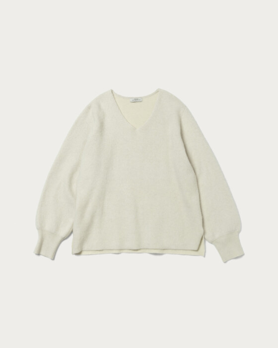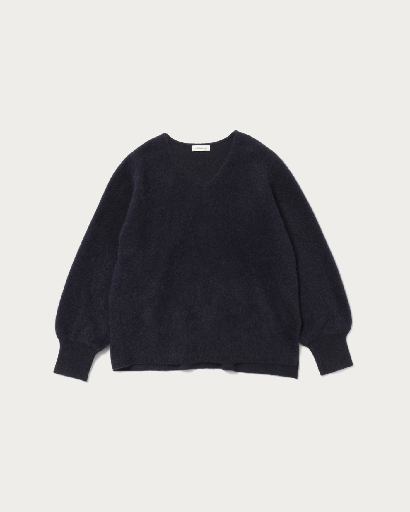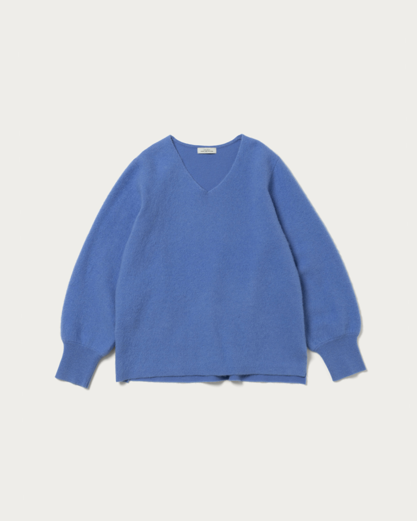 The fox blend knit, known for its soft and fluffy texture, is a piece that offers both a pleasant feel and warmth. The V-neck design provides a clean look around the neck, creating a sharp appearance around the face. Additionally, the sleeves have just the right amount of volume to create a feminine and elegant atmosphere, making it perfect for sophisticated adult styling.