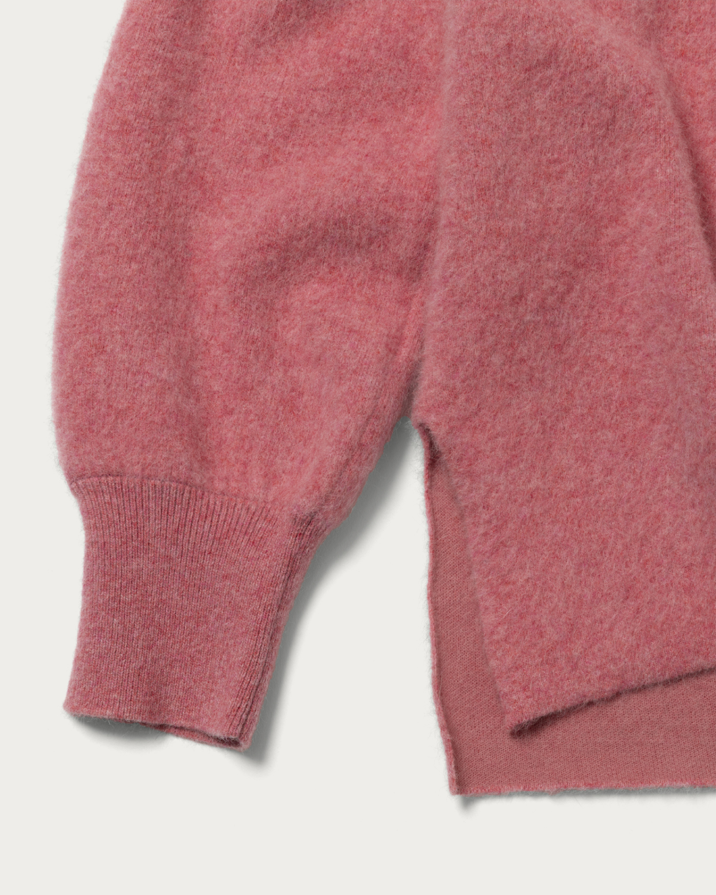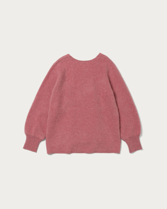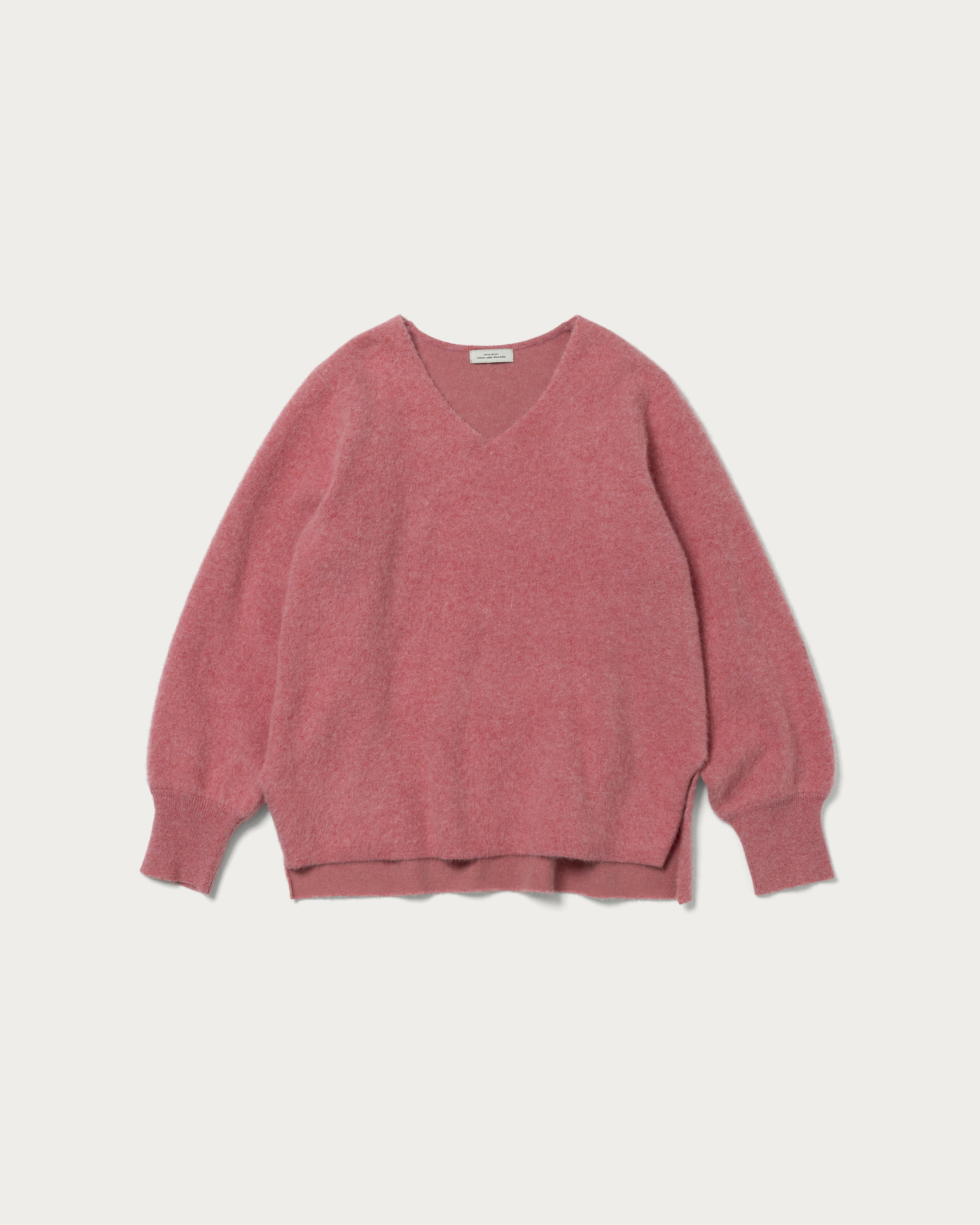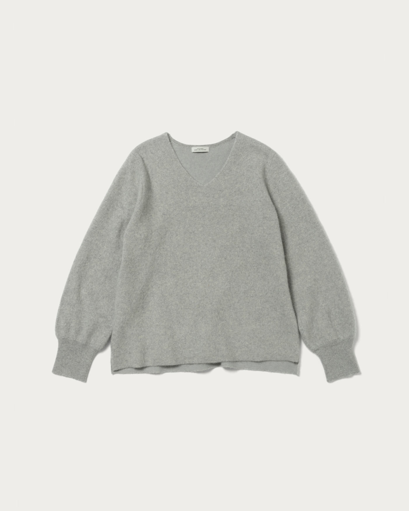 The fox blend knit, known for its soft and fluffy texture, is a piece that offers both a pleasant feel and warmth. The V-neck design provides a clean look around the neck, creating a sharp appearance around the face. Additionally, the sleeves have just the right amount of volume to create a feminine and elegant atmosphere, making it perfect for sophisticated adult styling.